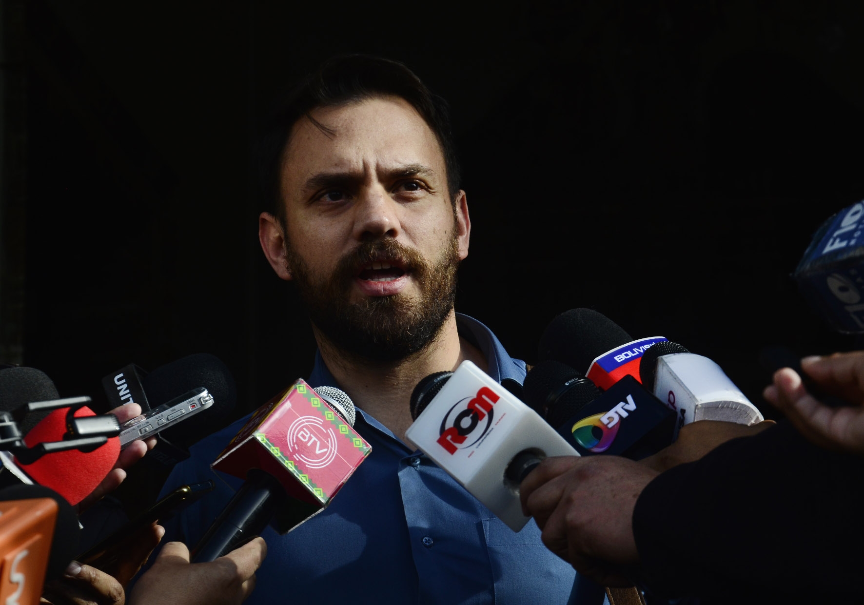 El ministro de Gobierno Eduardo Del Castillo ofrece declaraciones a medios de comunicación en puertas de Palacio Quemado. Fotos: Freddy Barragán