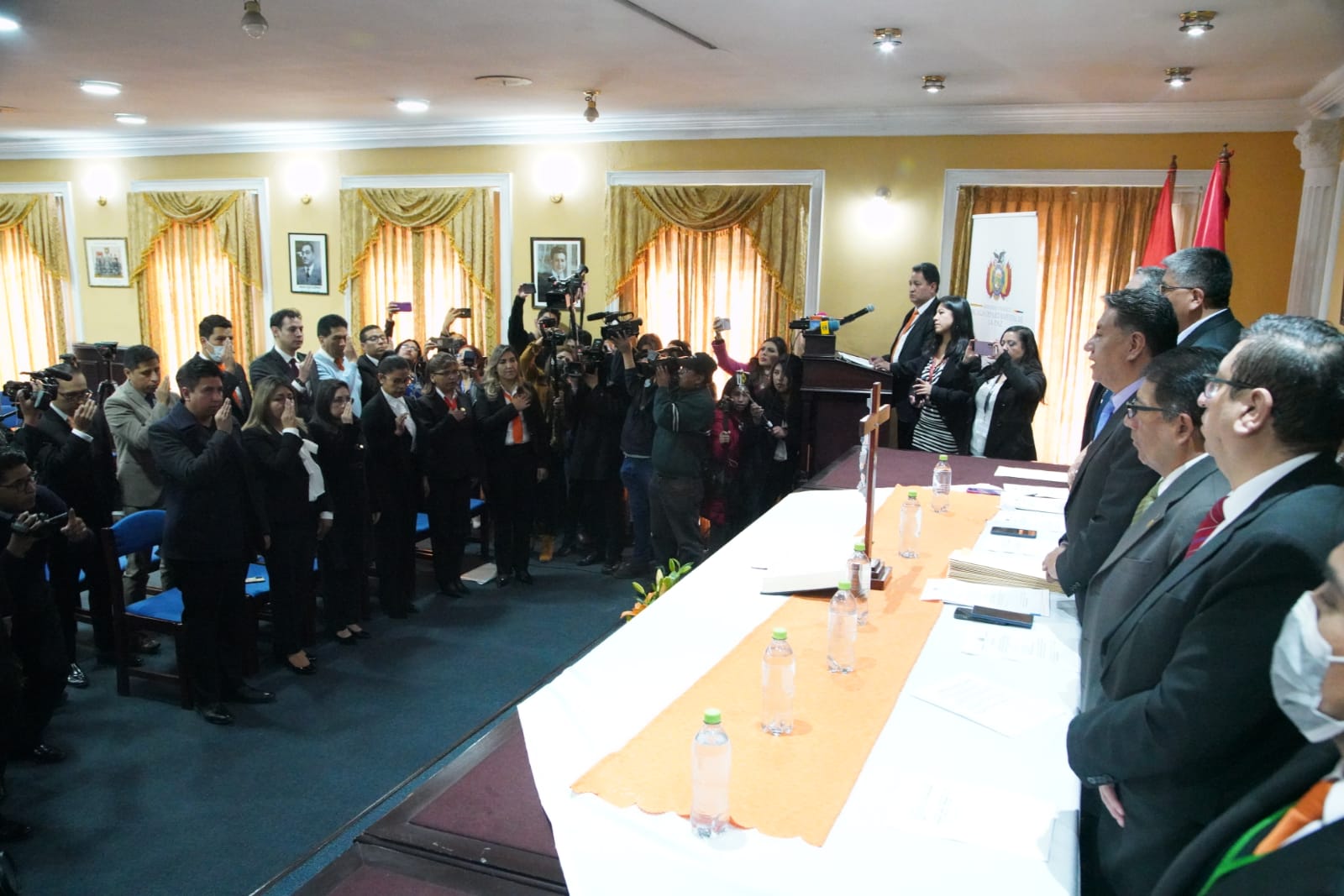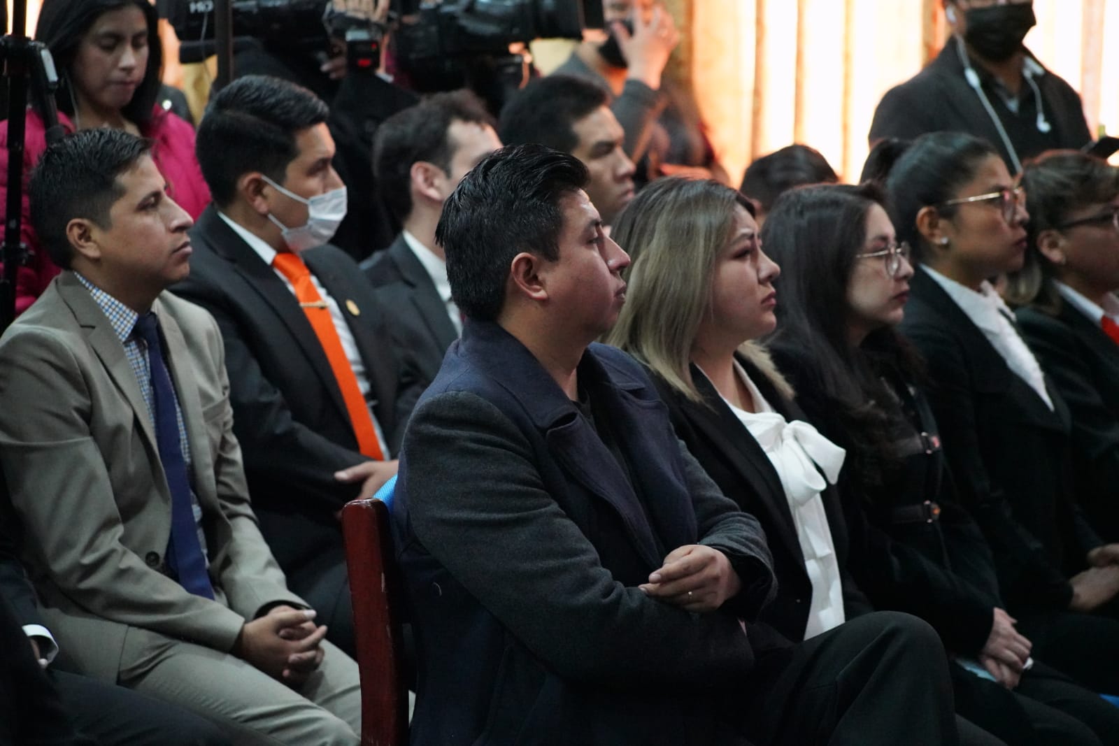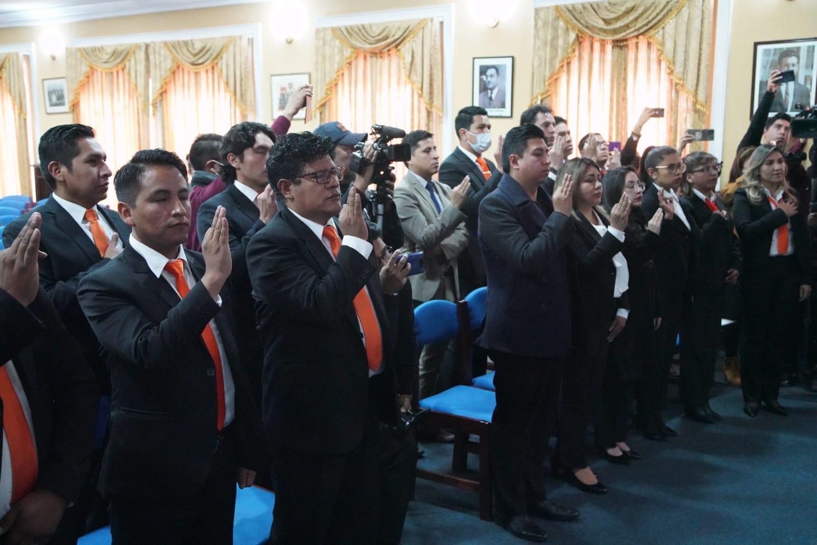 El Fiscal Departamental de La Paz, William Alave Laura, posesiona a los nuevos Fiscales Institucionalizados del Tercer Programa de Formación Inicial, en el salón de Honor del Colegio de Abogados. Fotos: Jorge Mamani