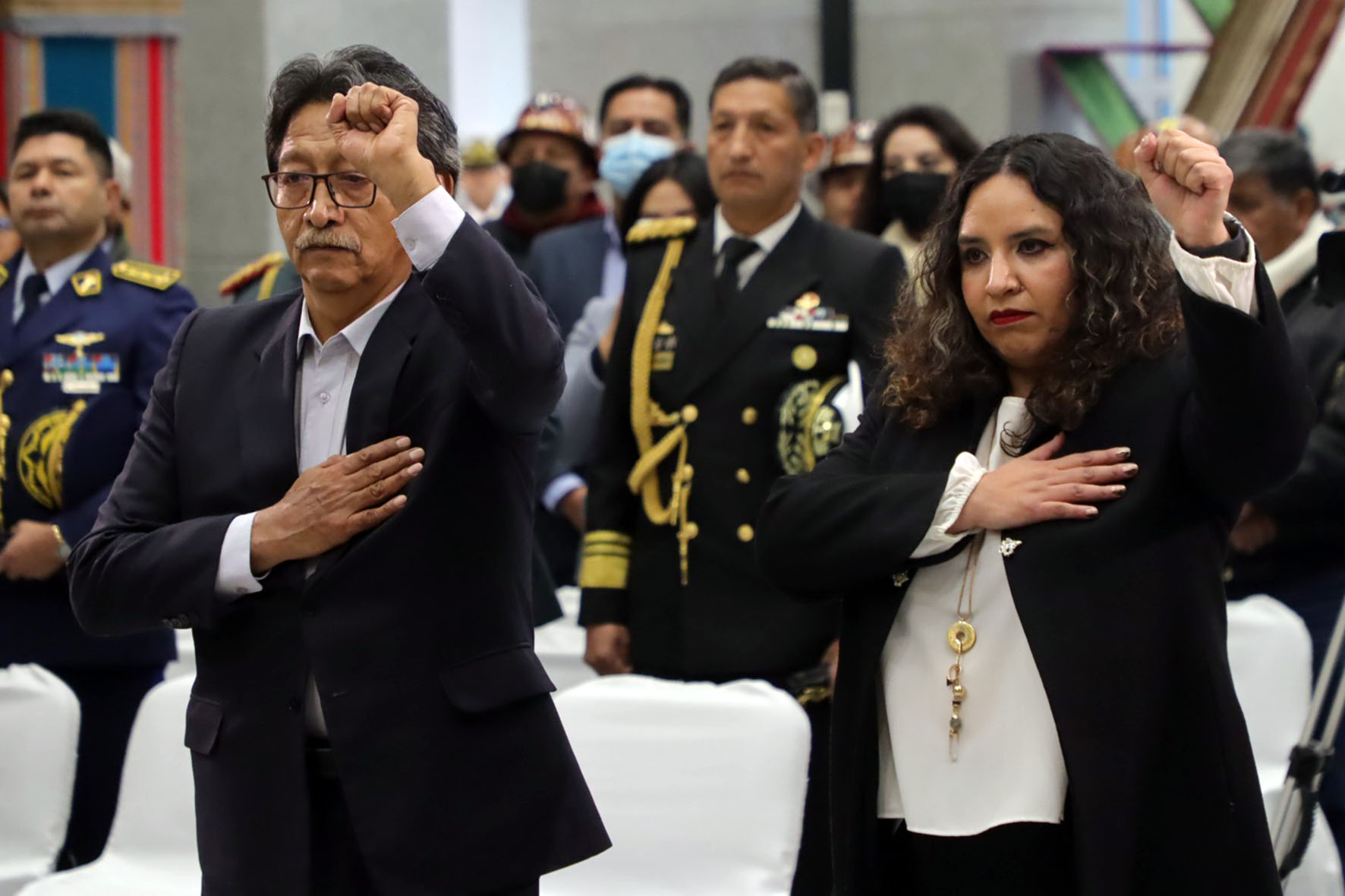 El presidente Luis Arce Catacora posesionó este viernes a María Renée Castro Cusicanqui como nueva Ministra de Salud y Deportes y a Marcelino Quispe López como Ministro de Minería y Metalurgia. Fuente: Comunicación Presidencial
