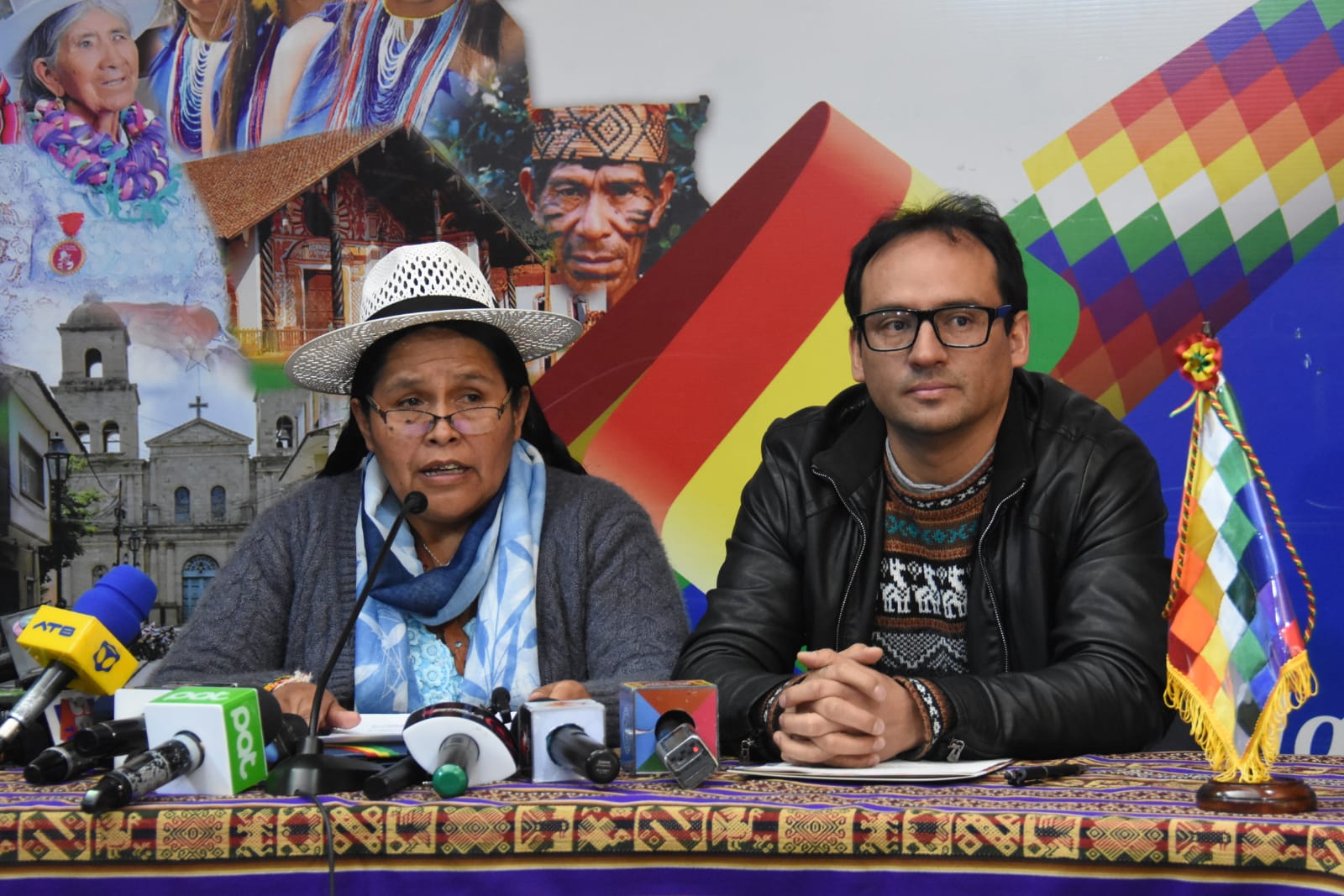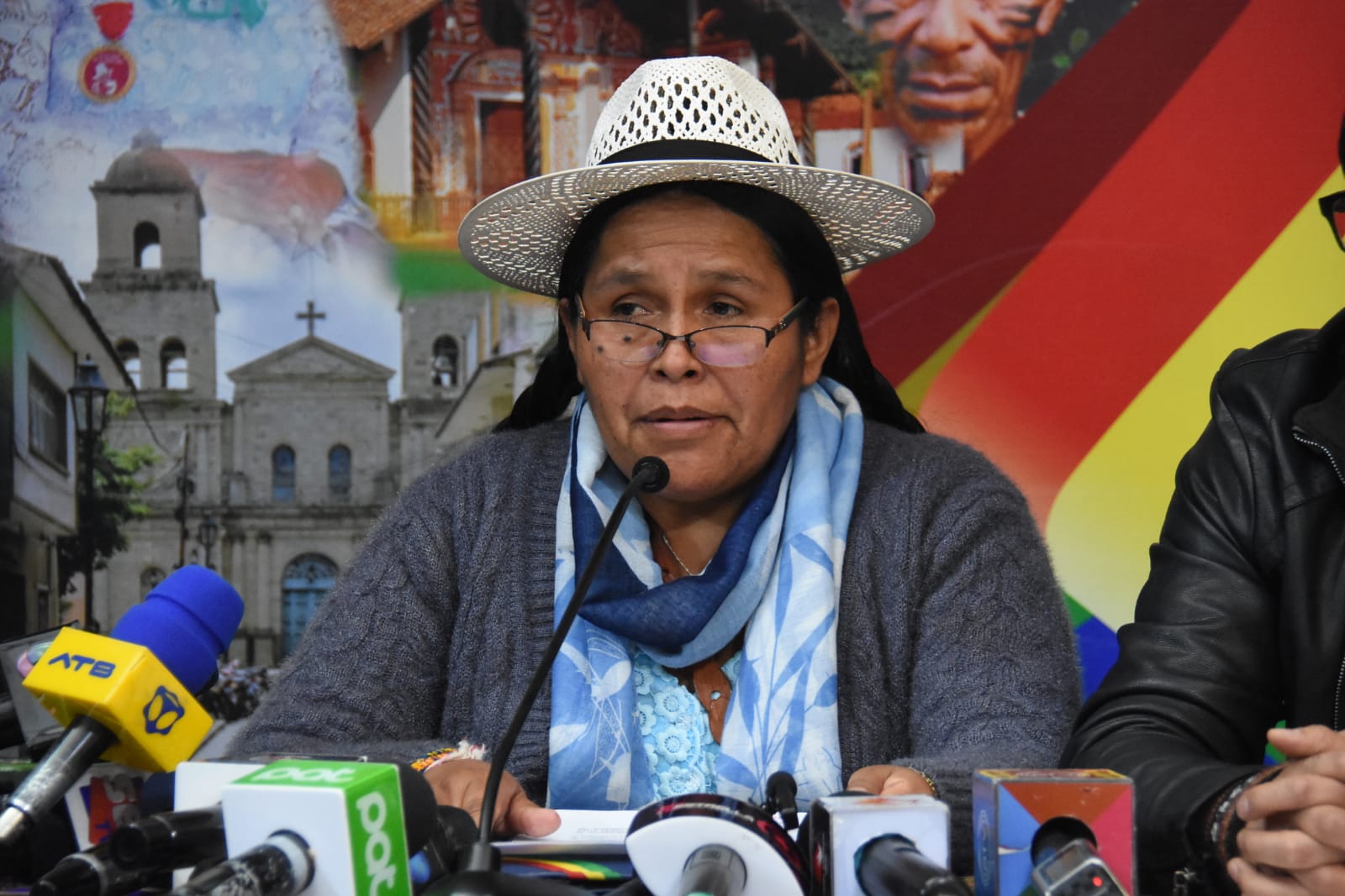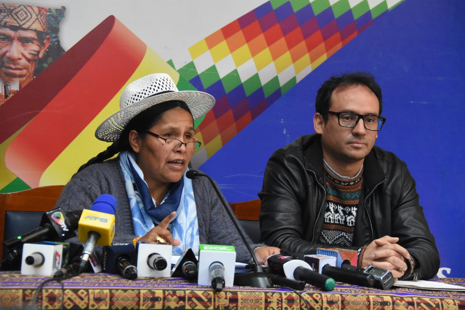 La ministra de Culturas, Descolonización y Despatriarcalización Sabina Orellana, en conferencia de prensa