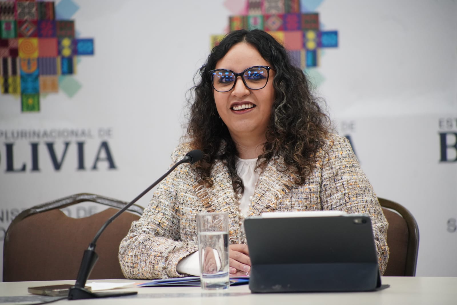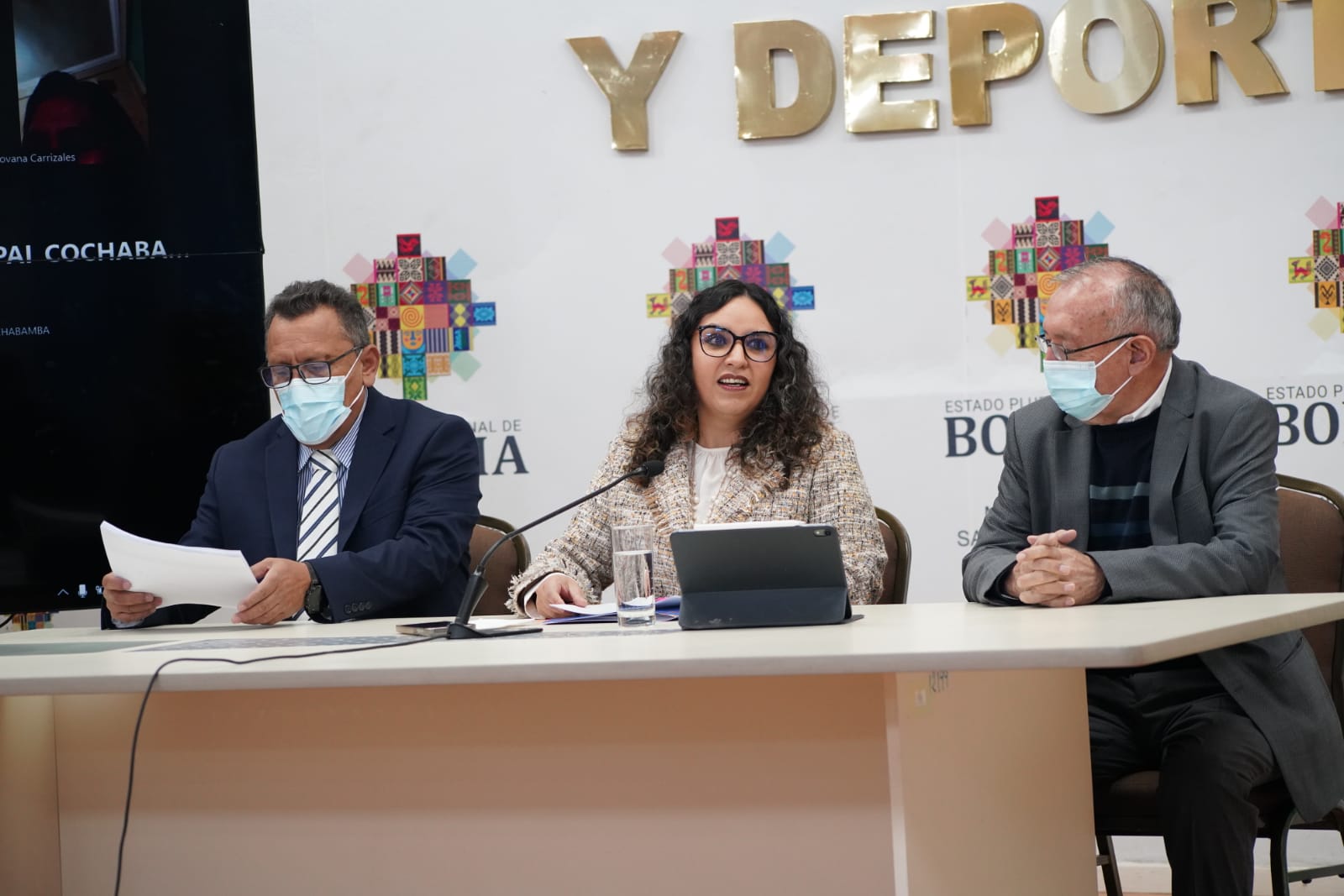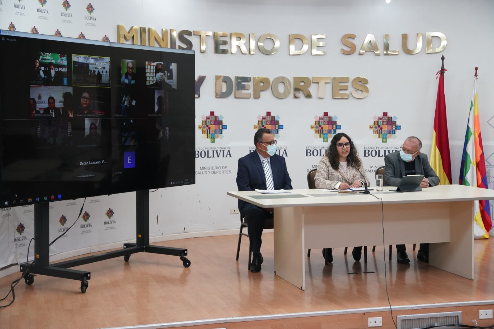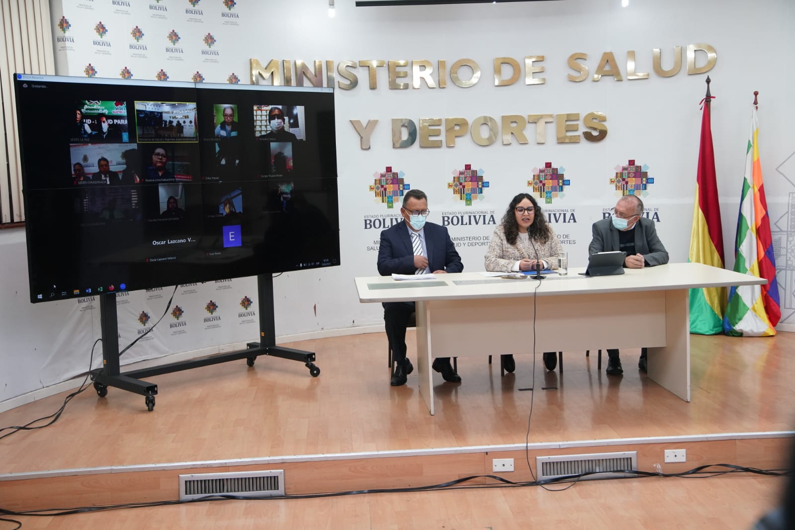 La Ministra de Salud y Deportes María Renée Castro, junto a los directores nacionales de Epidemiología y PAI (Programa Ampliado de Inmunización), realizan “informe del inicio del Monitoreo Rápido de Vacunación a menores de 6 años”. Fotos: Jorge Mamani