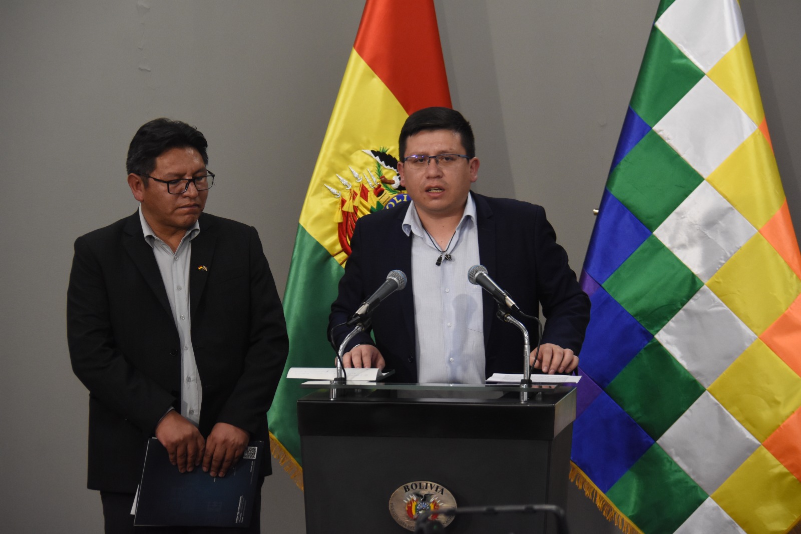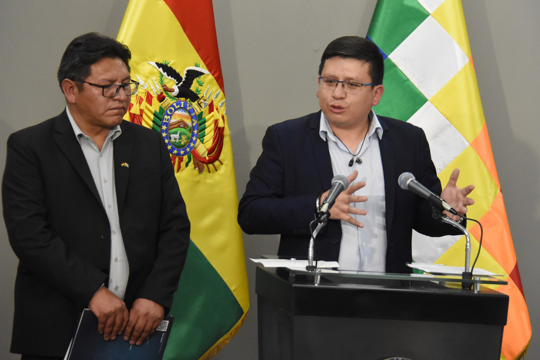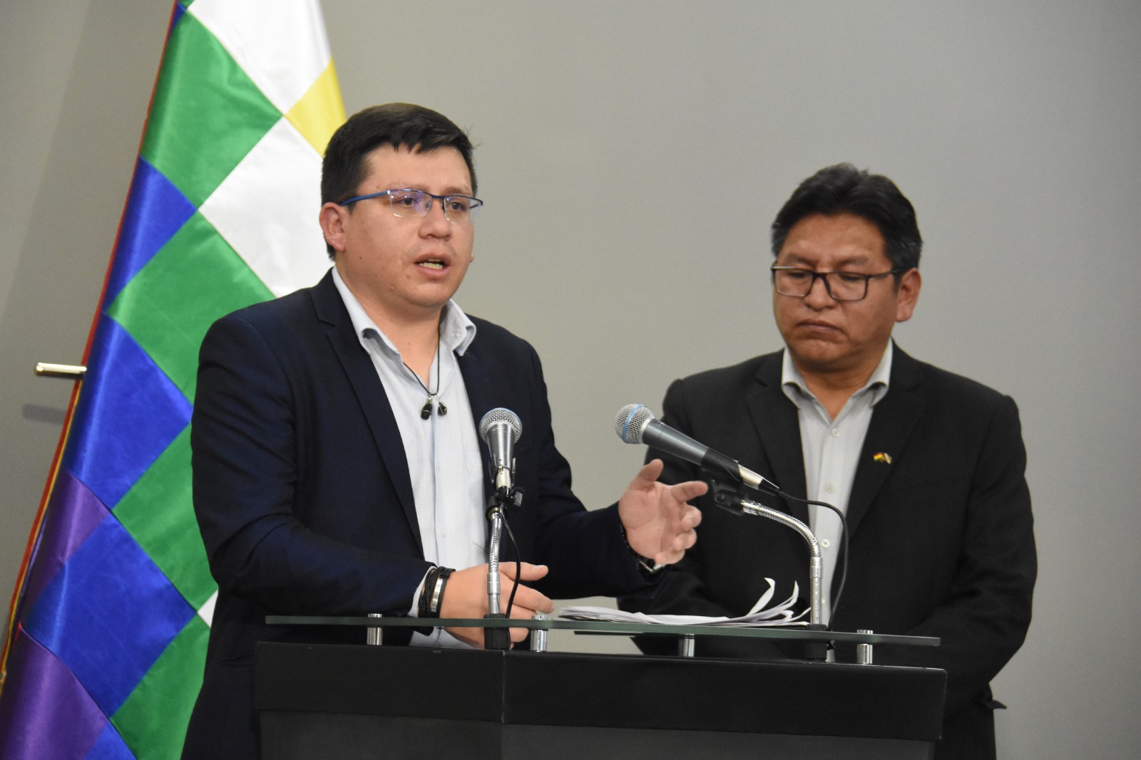 Ministro de Planificación del Desarrollo, Sergio Cusicanqui junto al vicecanciller Freddy Mamani en conferencia de prensa