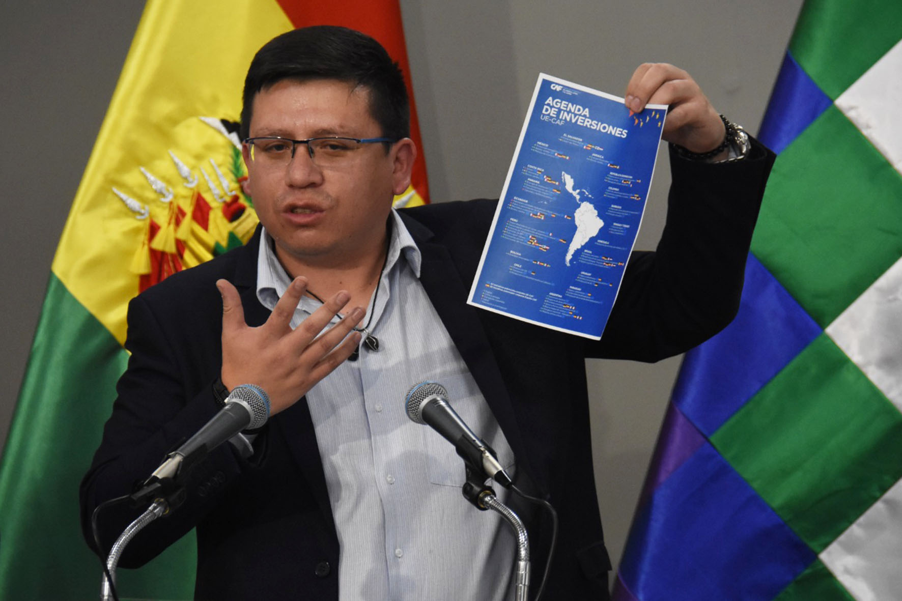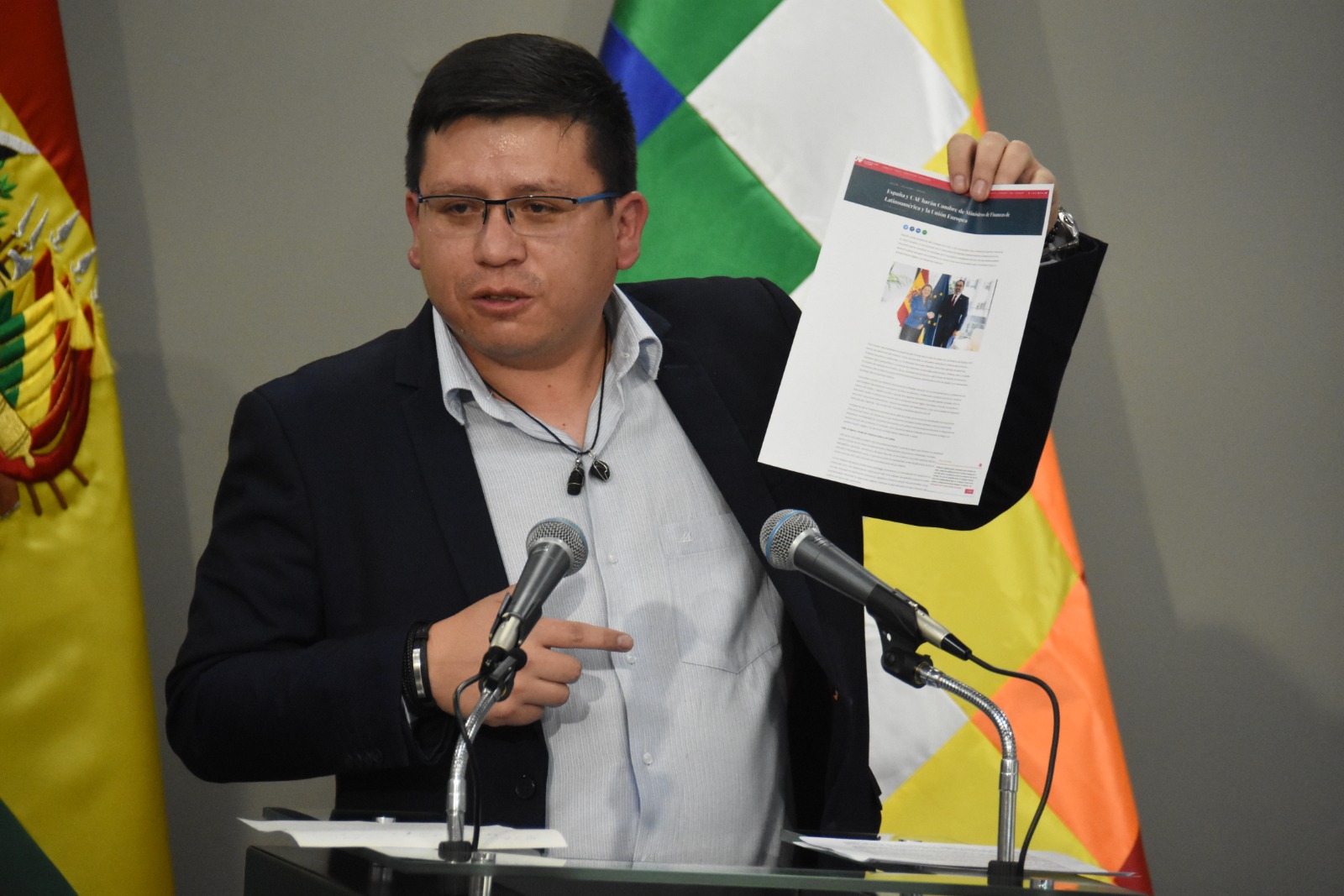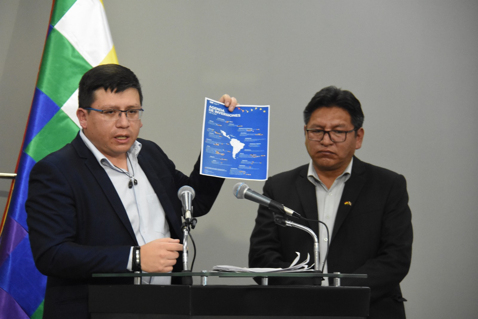 Ministro de Planificación del Desarrollo, Sergio Cusicanqui junto al vicecanciller Freddy Mamani en conferencia de prensa