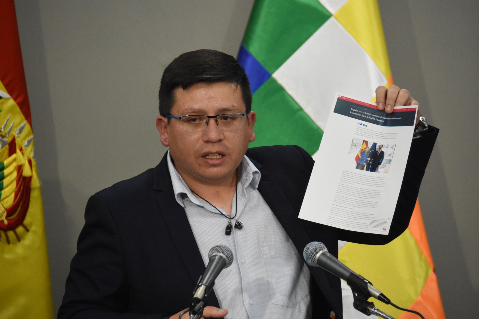 El Ministro de Planificación del Desarrollo, Sergio Cusicanqui junto al vicecanciller Freddy Mamani en conferencia de prensa. Fotos: Gonzalo Jallasi