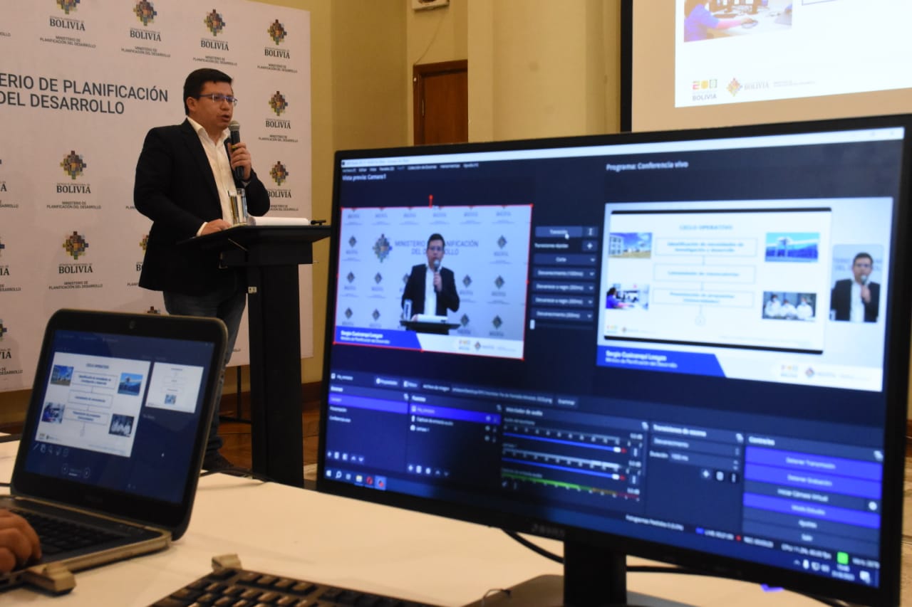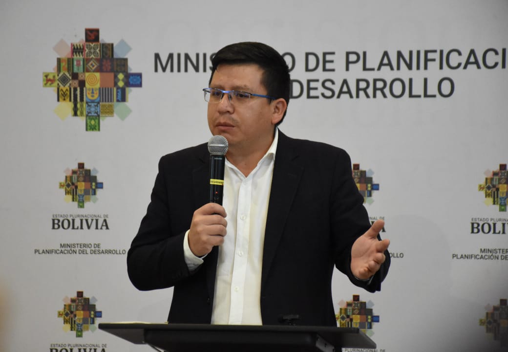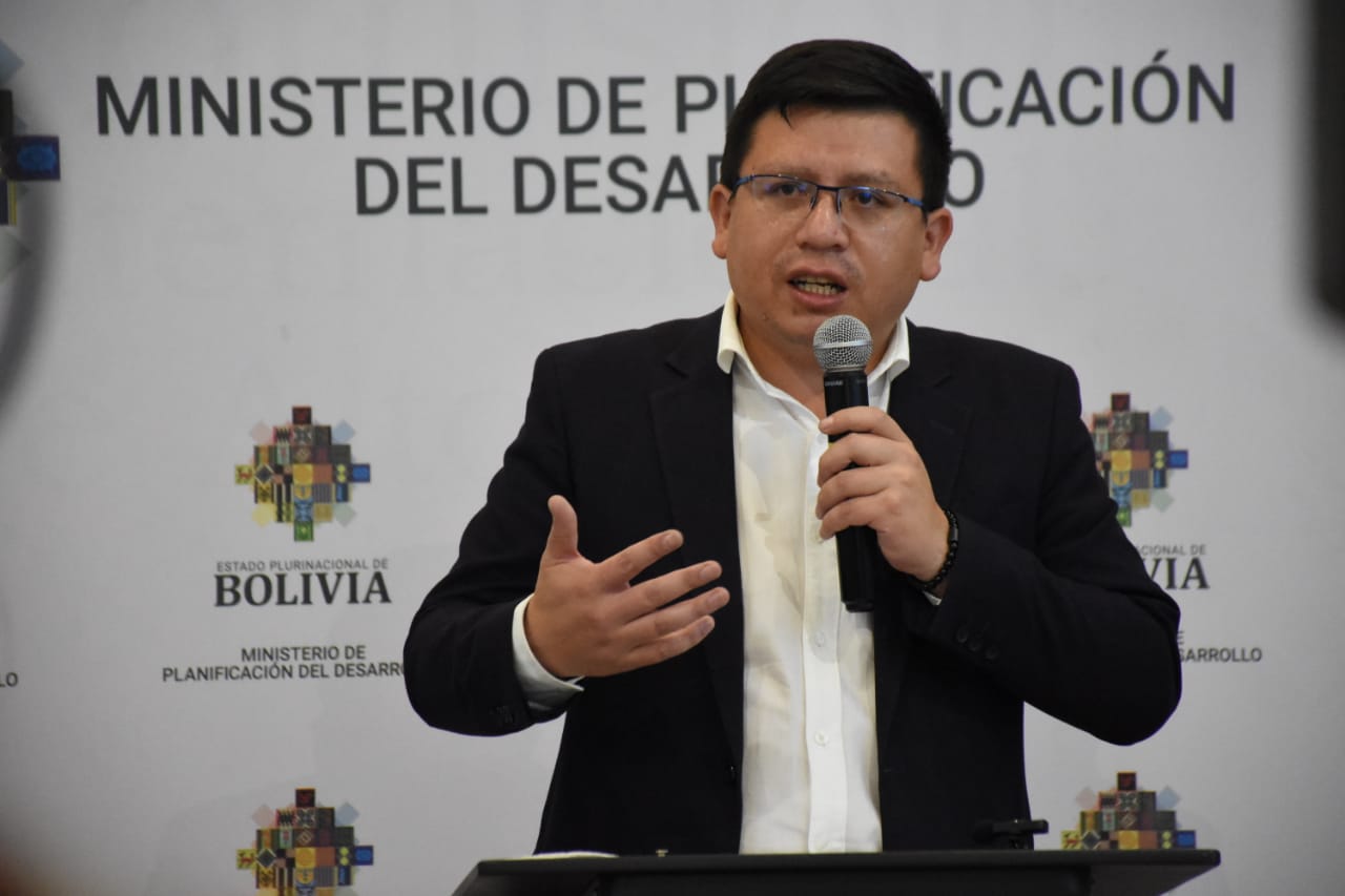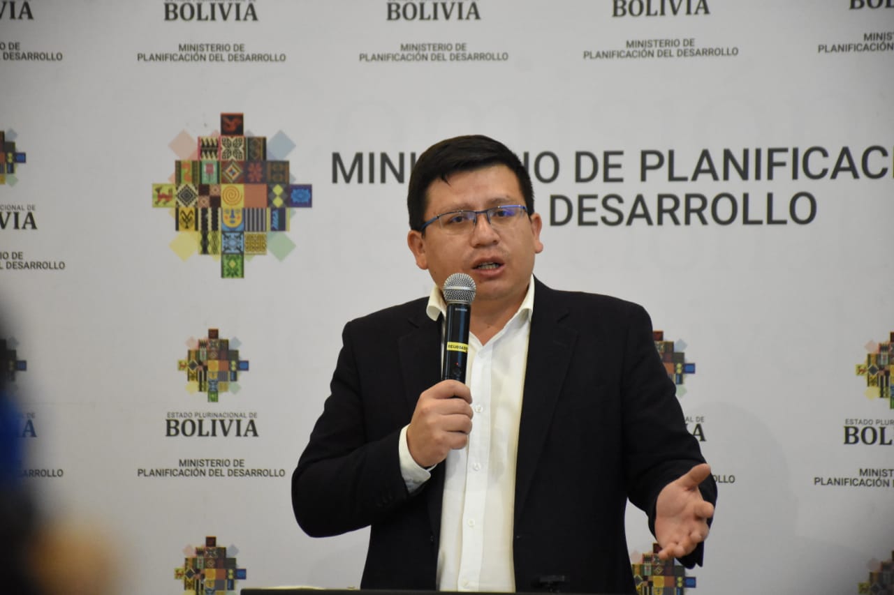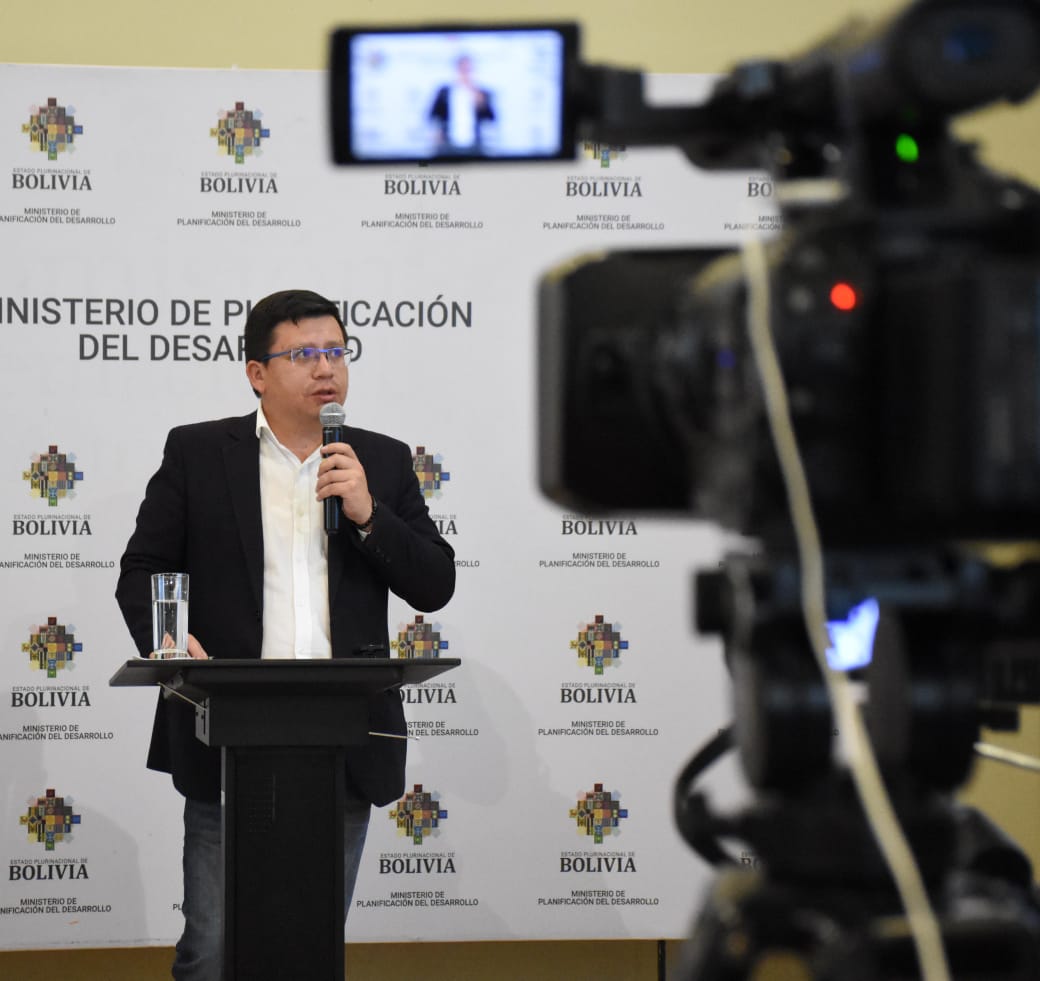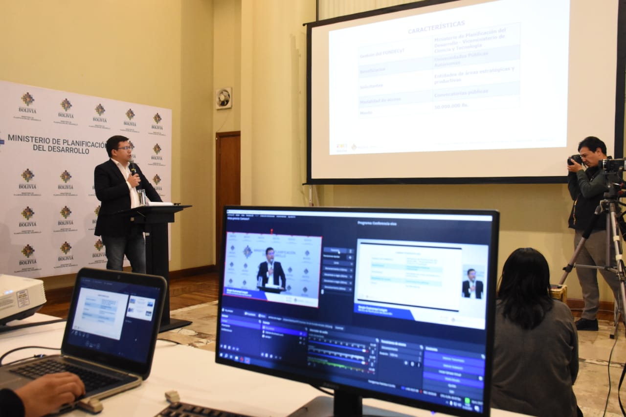El Ministro de Planificación Sergio Cusicanqui en conferencia de prensa informa sobre la creación del Fondo de Fomento al Desarrollo de Ciencia y Tecnología para las universidades públicas autónomas.