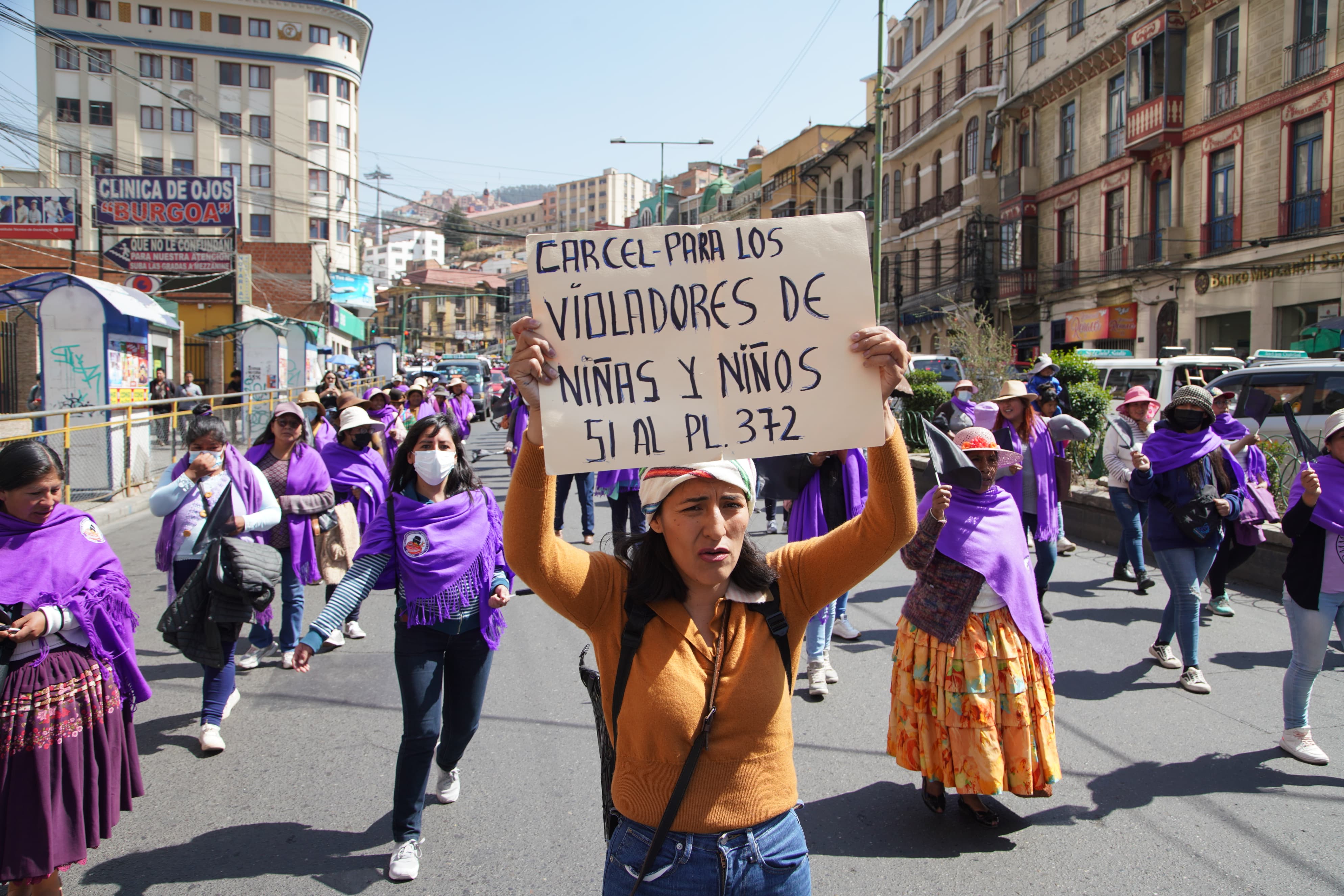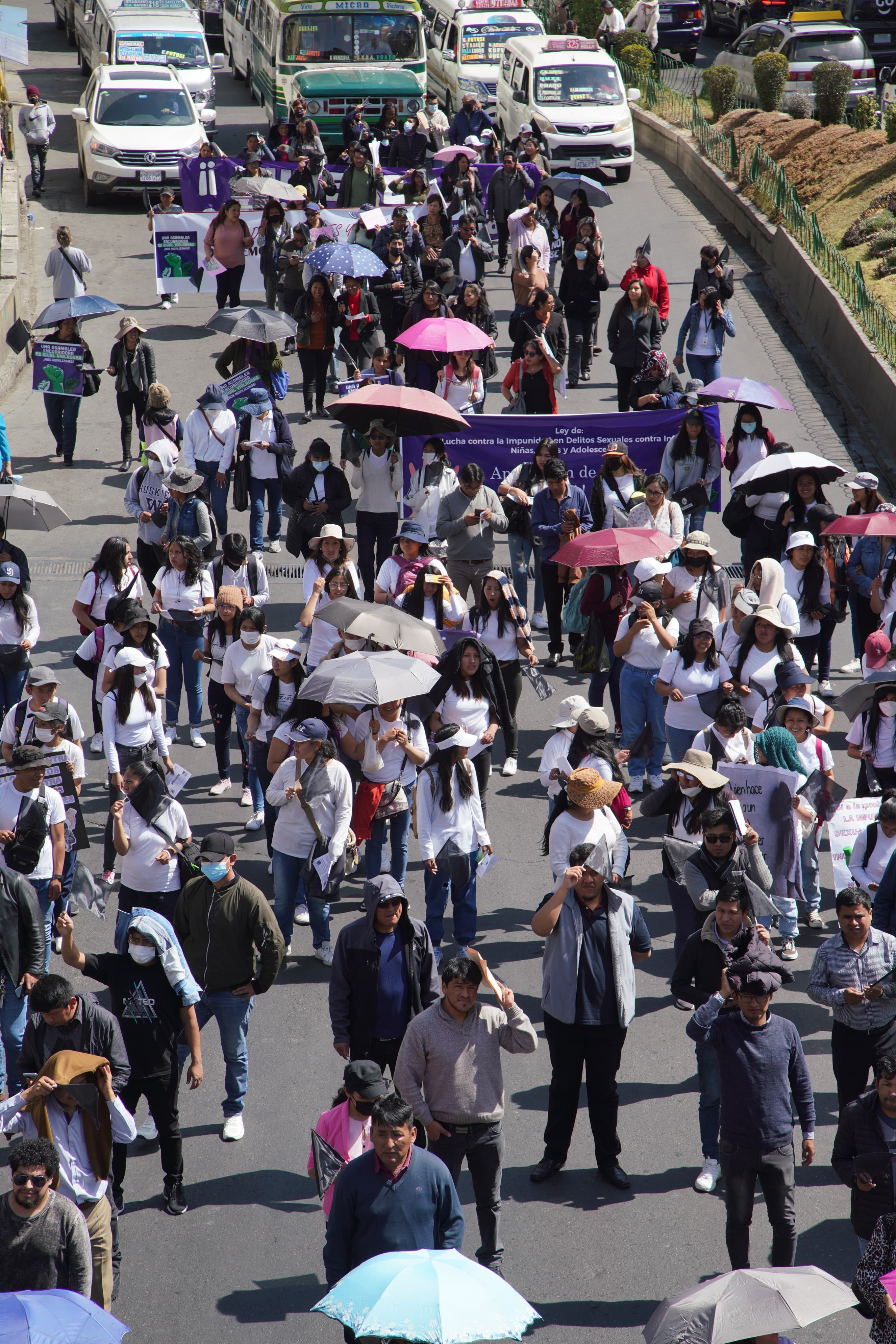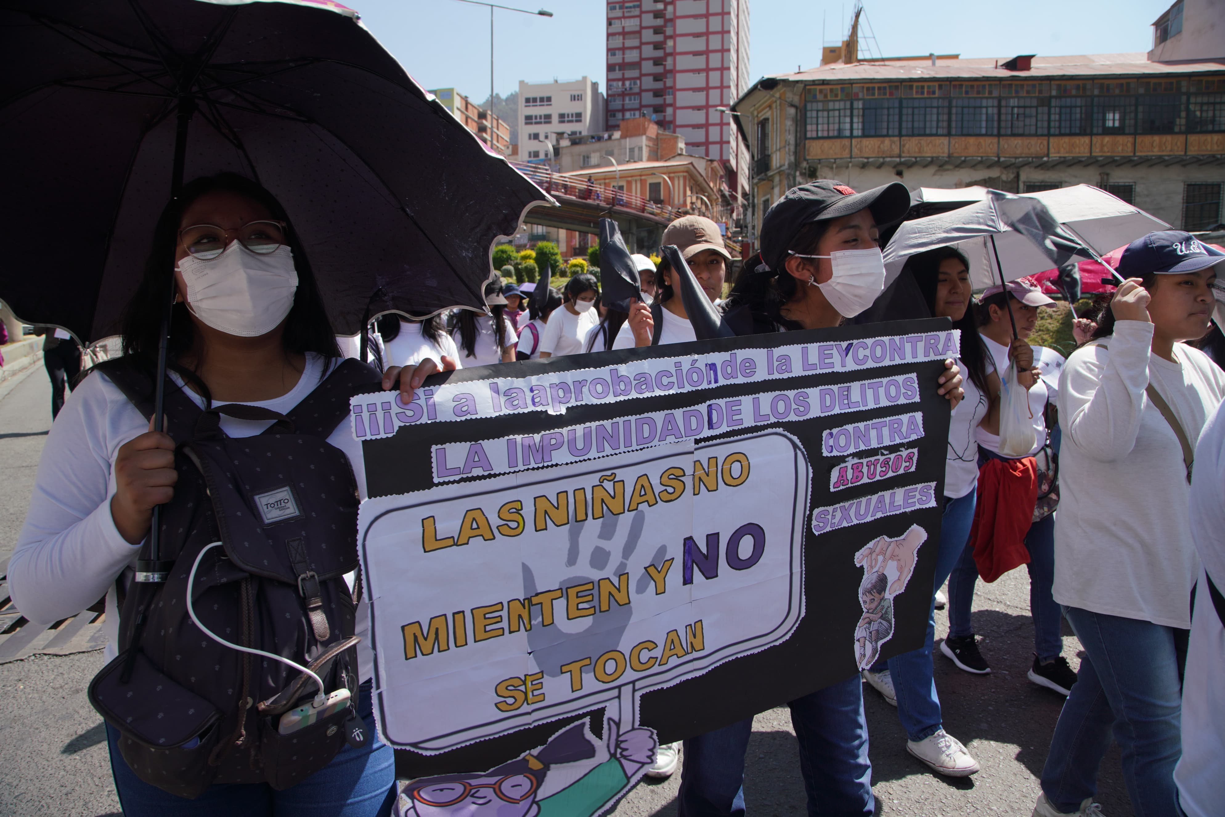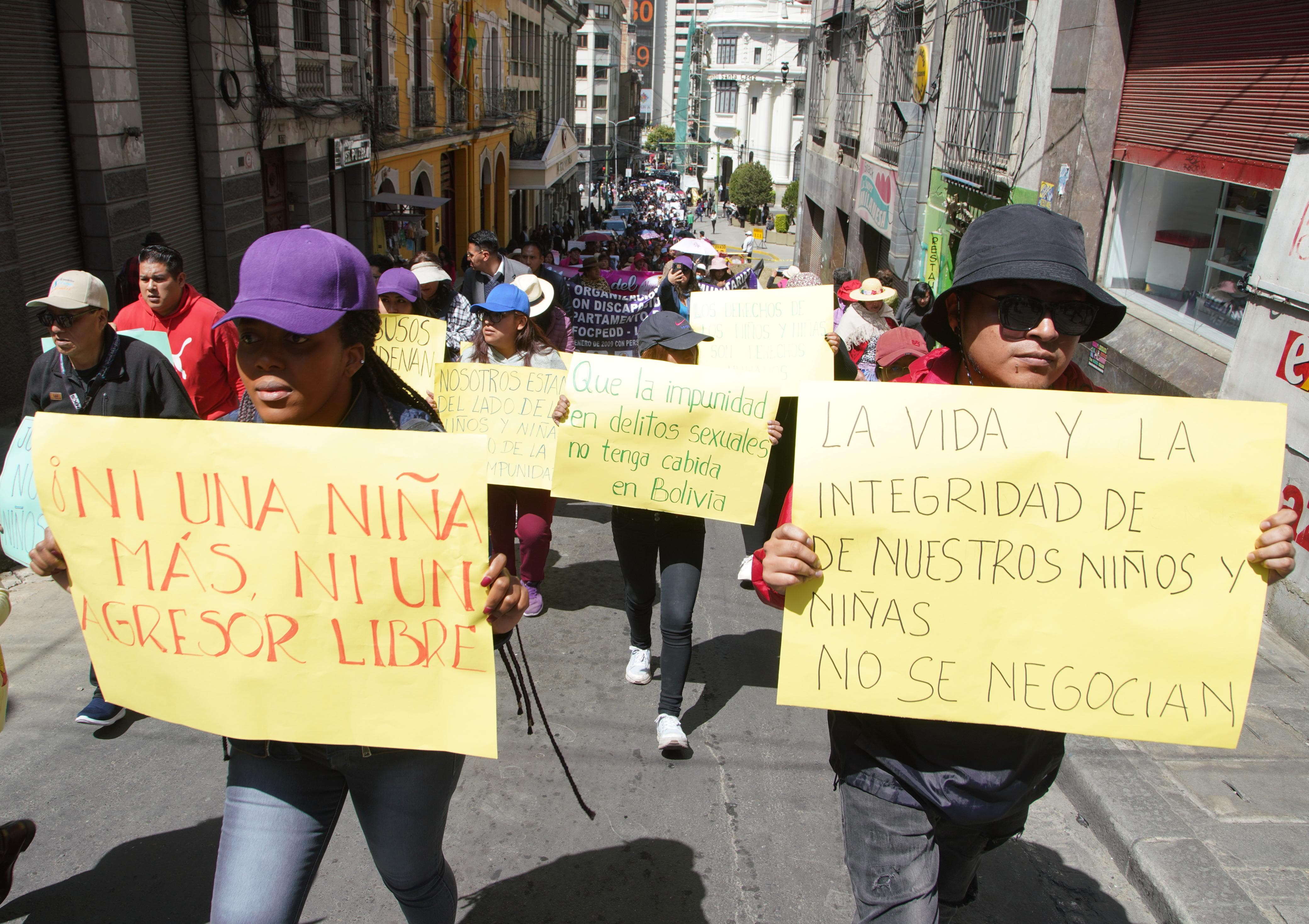 El Consejo de Mujeres del Departamento de La Paz y diferentes organizaciones sociales marchan, este lunes, en el centro paceño, en demanda del debate y aprobación del proyecto de “Ley 372 de Lucha contra la Impunidad en Delitos Sexuales contra Infantes, Niñas, Niños y Adolescentes”, en la Asamblea Legislativa Plurinacional (ALP).