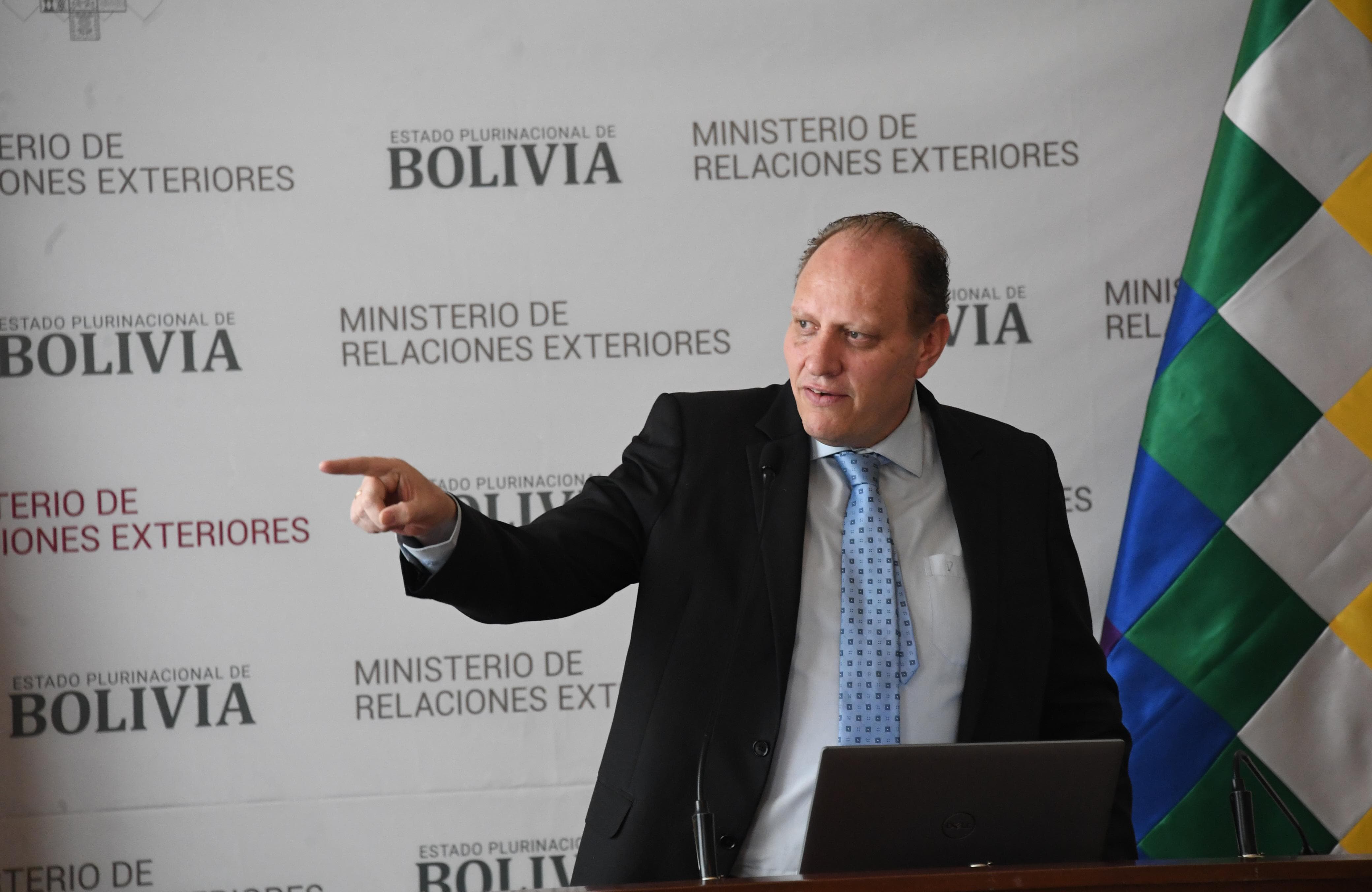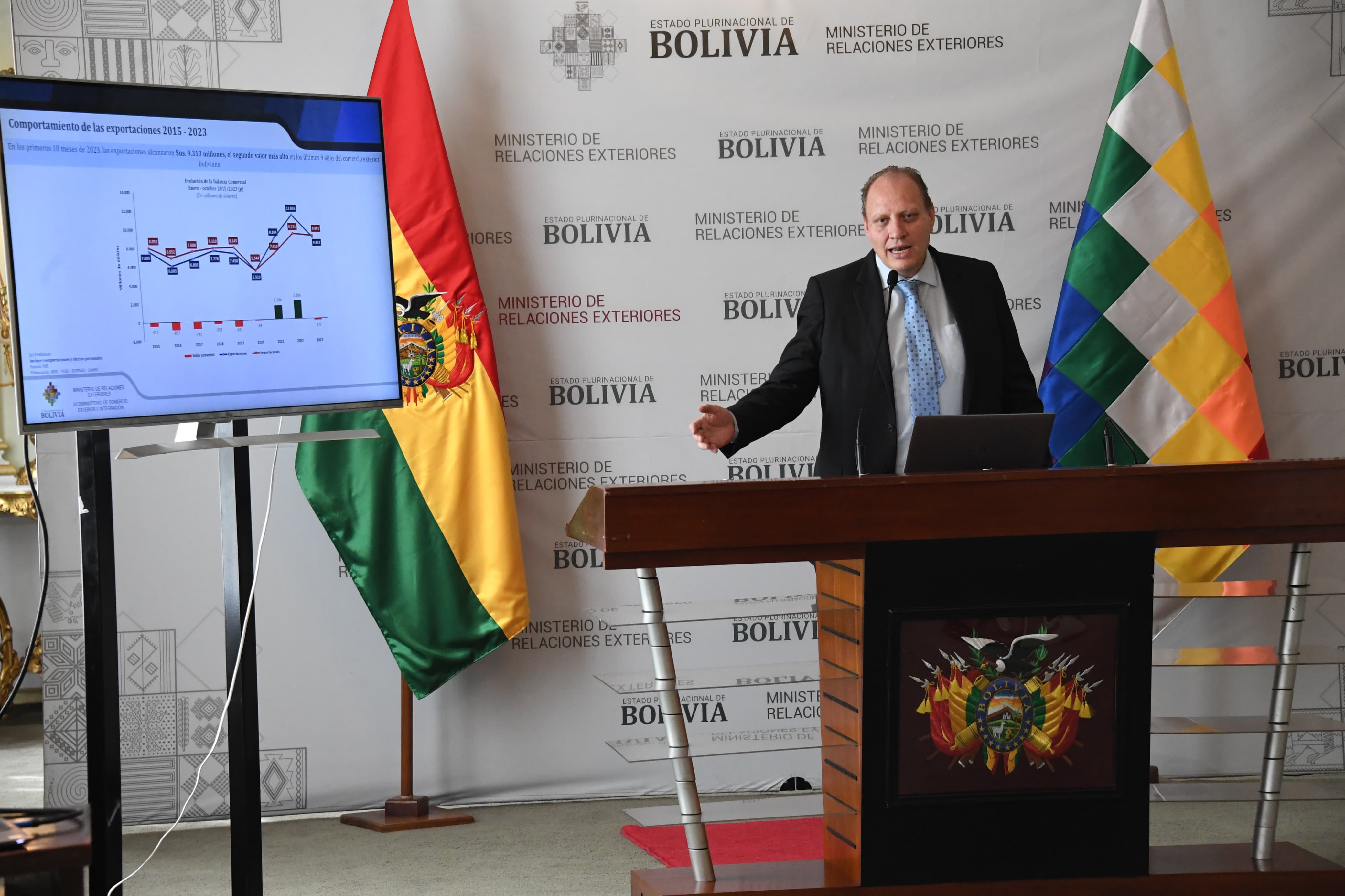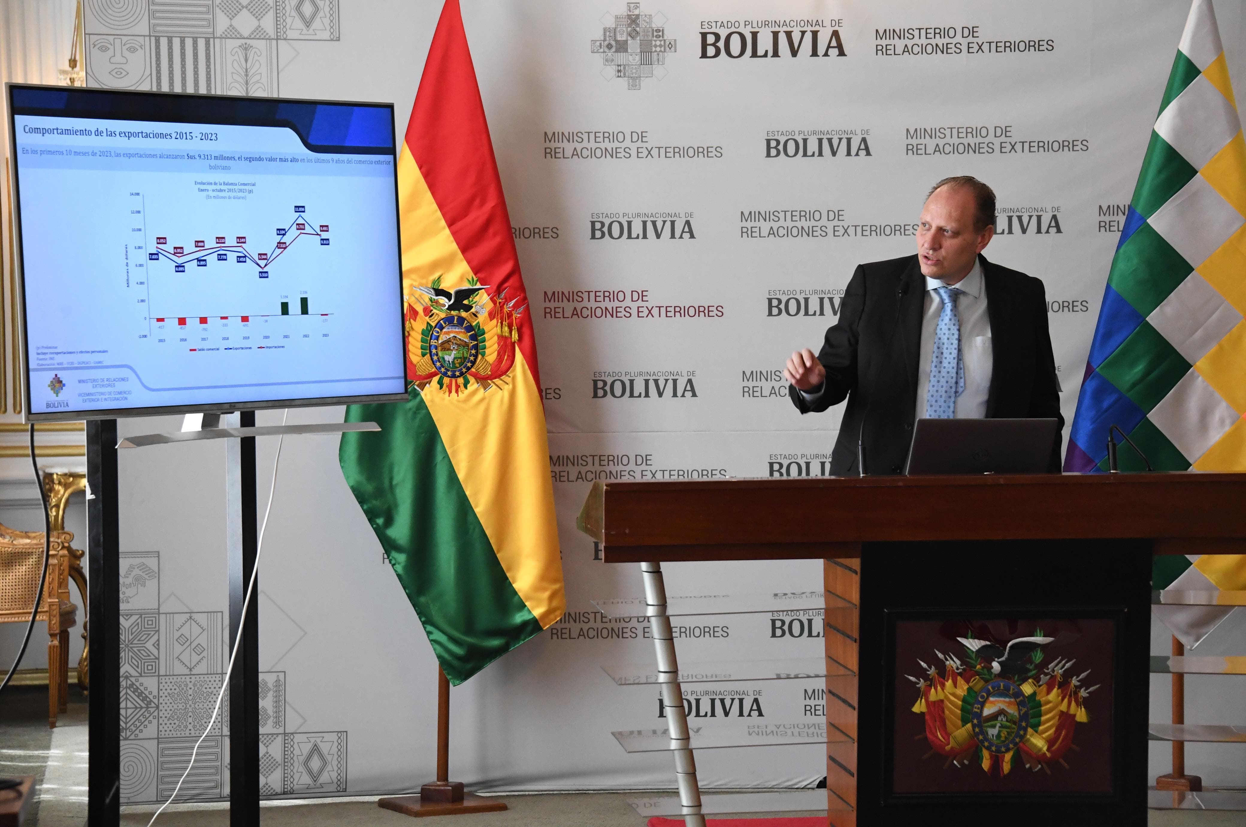 El Ministerio de Relaciones Exteriores, mediante el viceministro de Comercio Exterior e Integración, Benjamín Blanco en conferencia de prensa respecto al Desempeño del comercio exterior boliviano hasta octubre de 2023