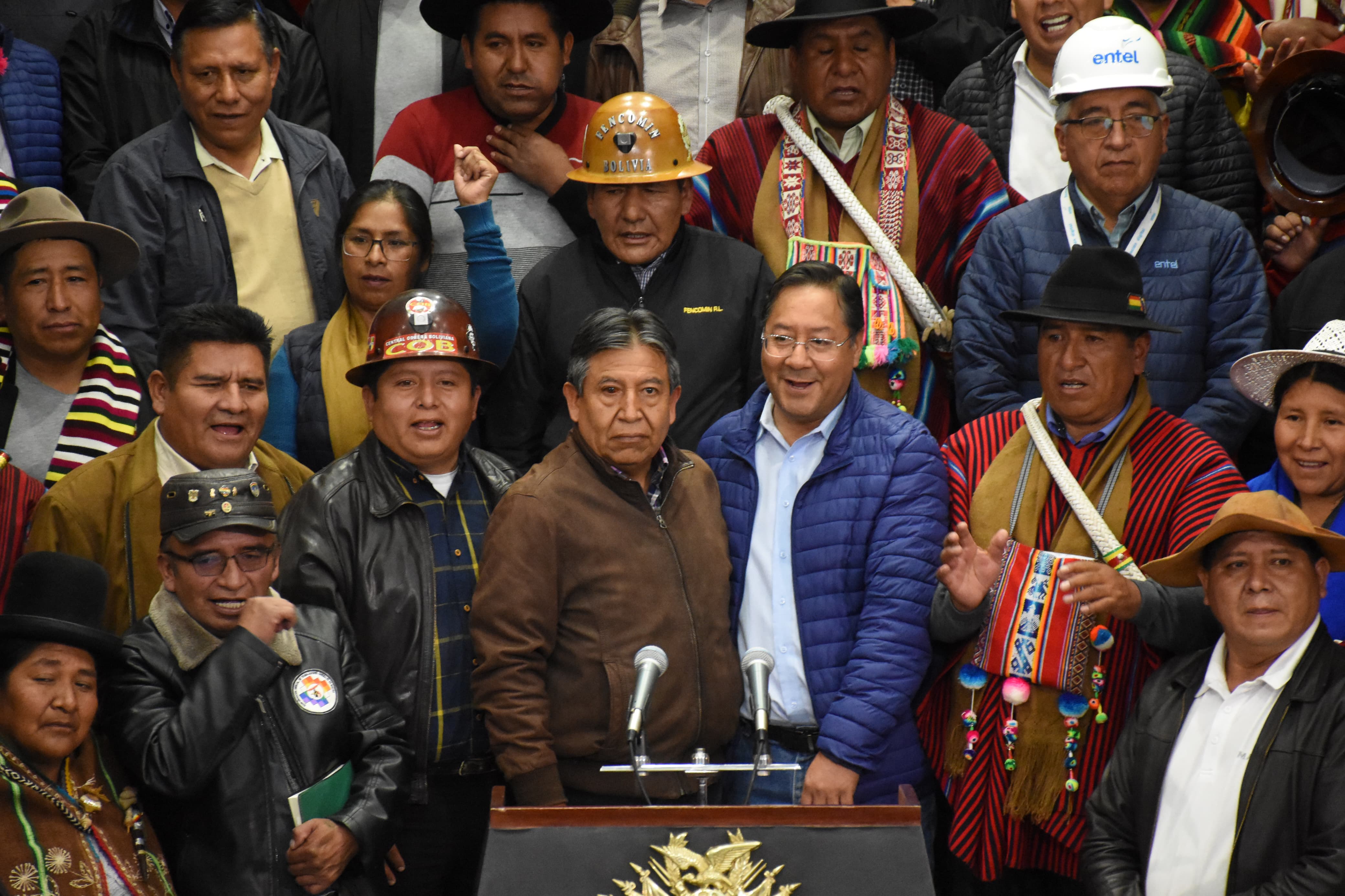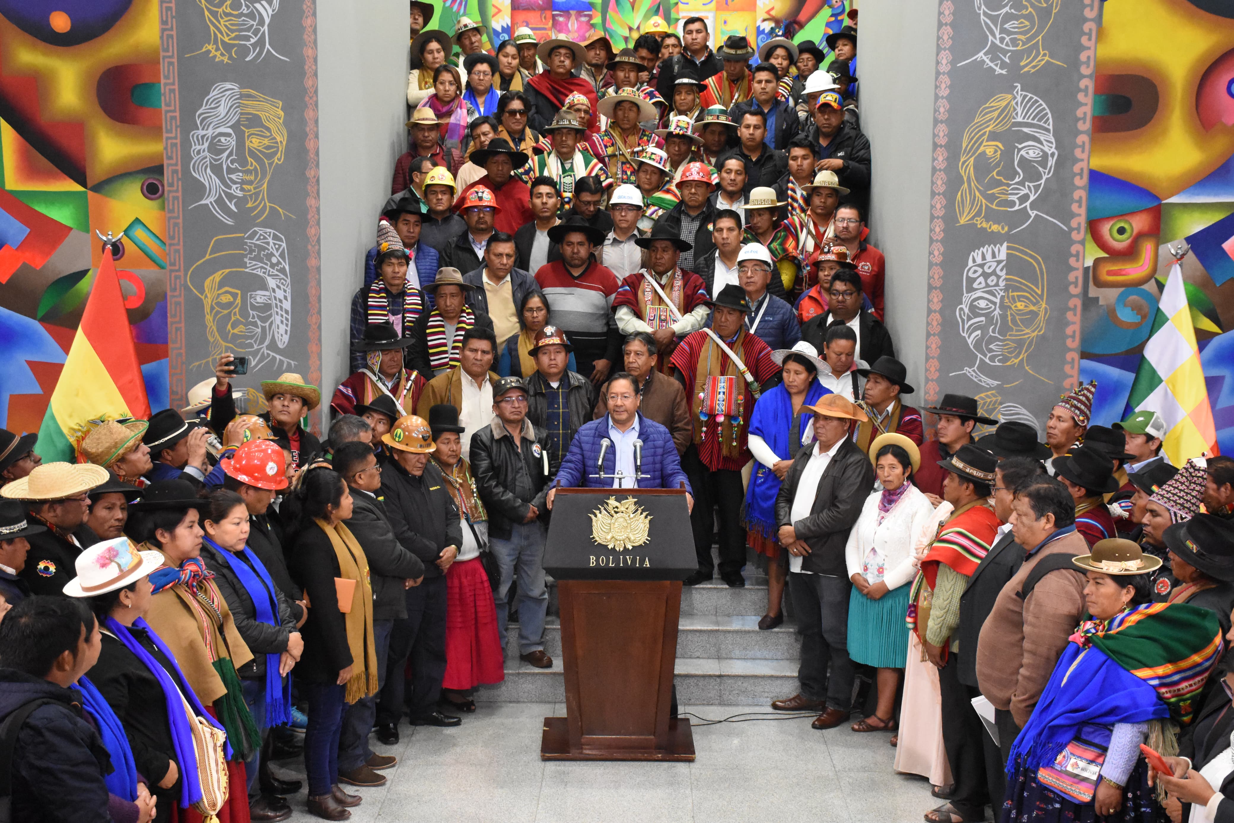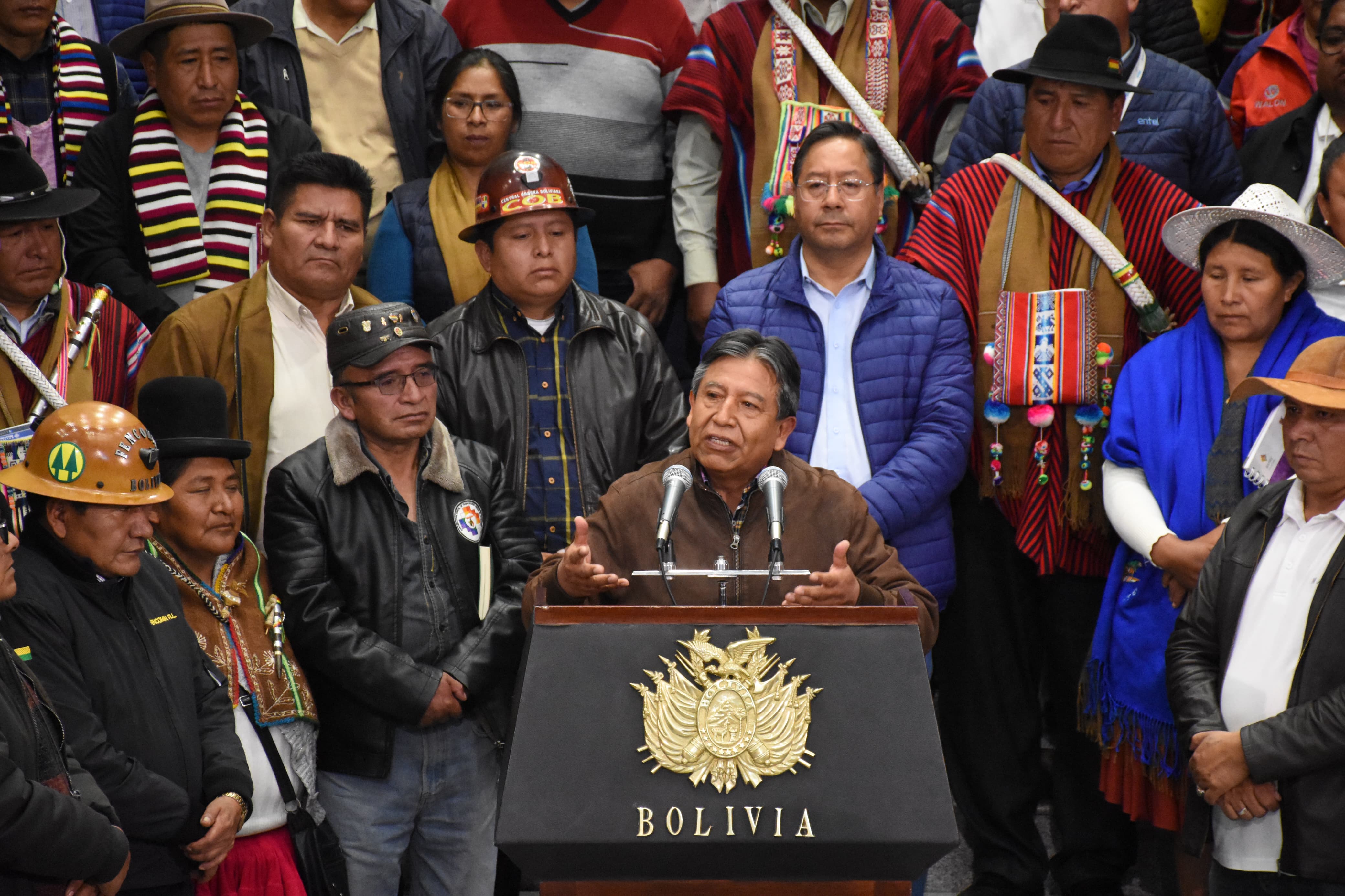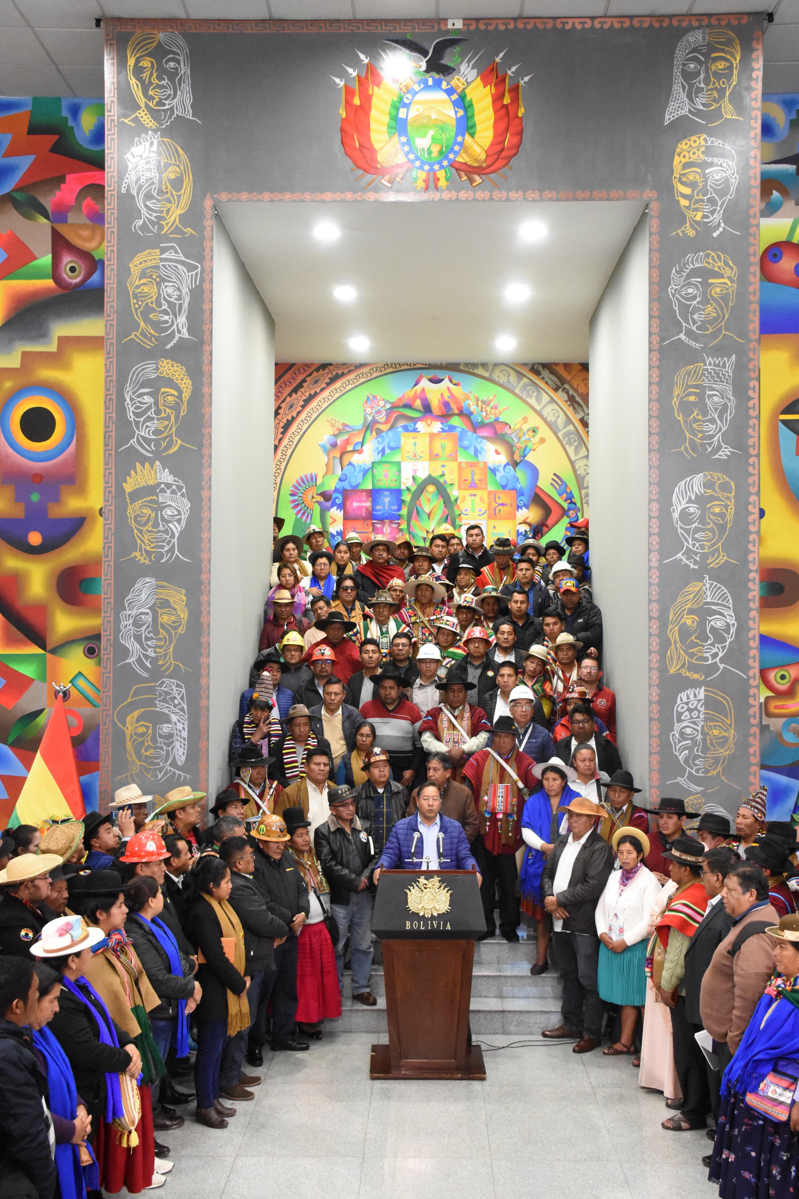 El presidente constitucional Luis Alberto Arce Catacora, conjuntamente el Pacto de Unidad y la Central Obrera Boliviana, brindan conferencia de prensa tras haber sostenido una reunión en Casa Grande del Pueblo