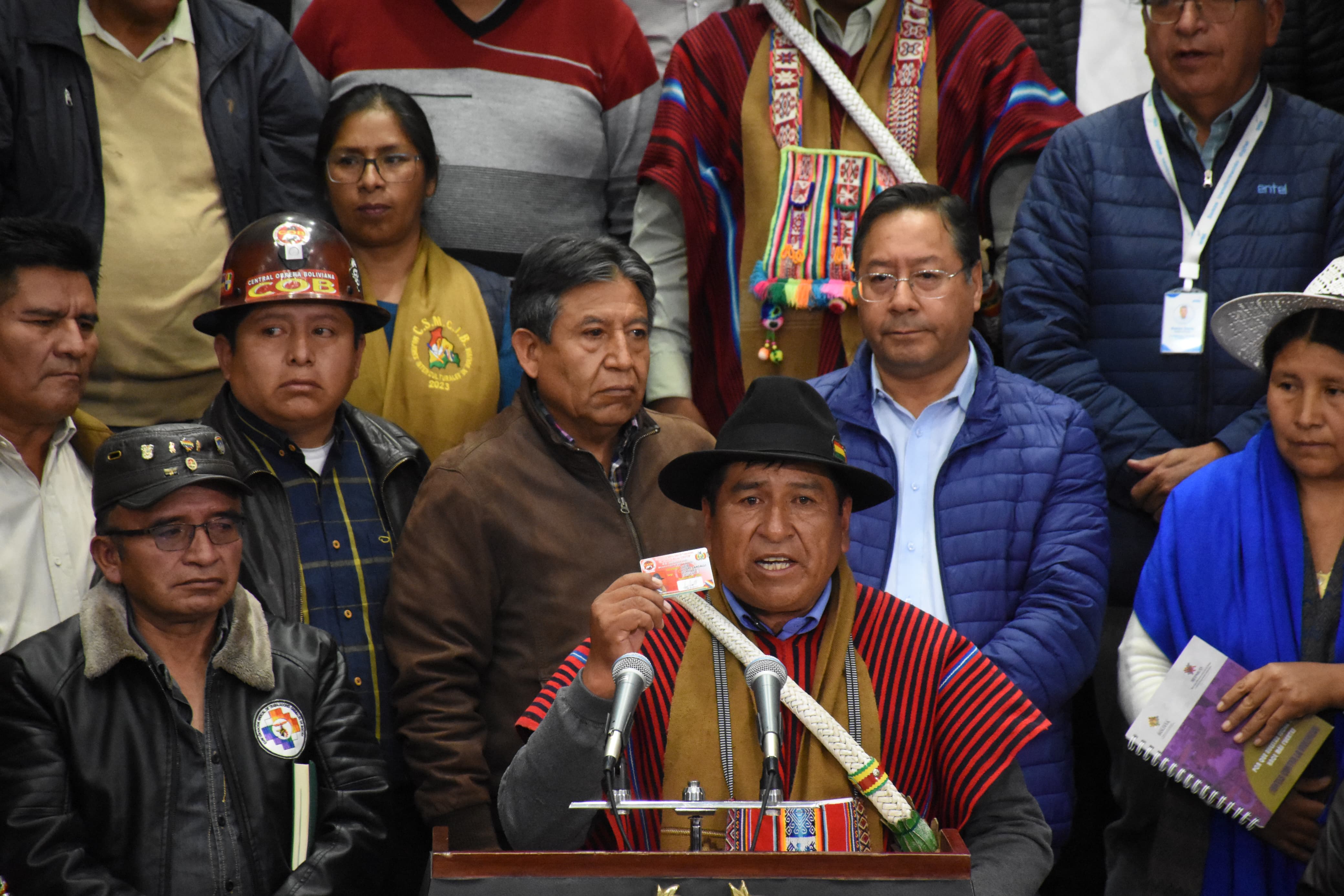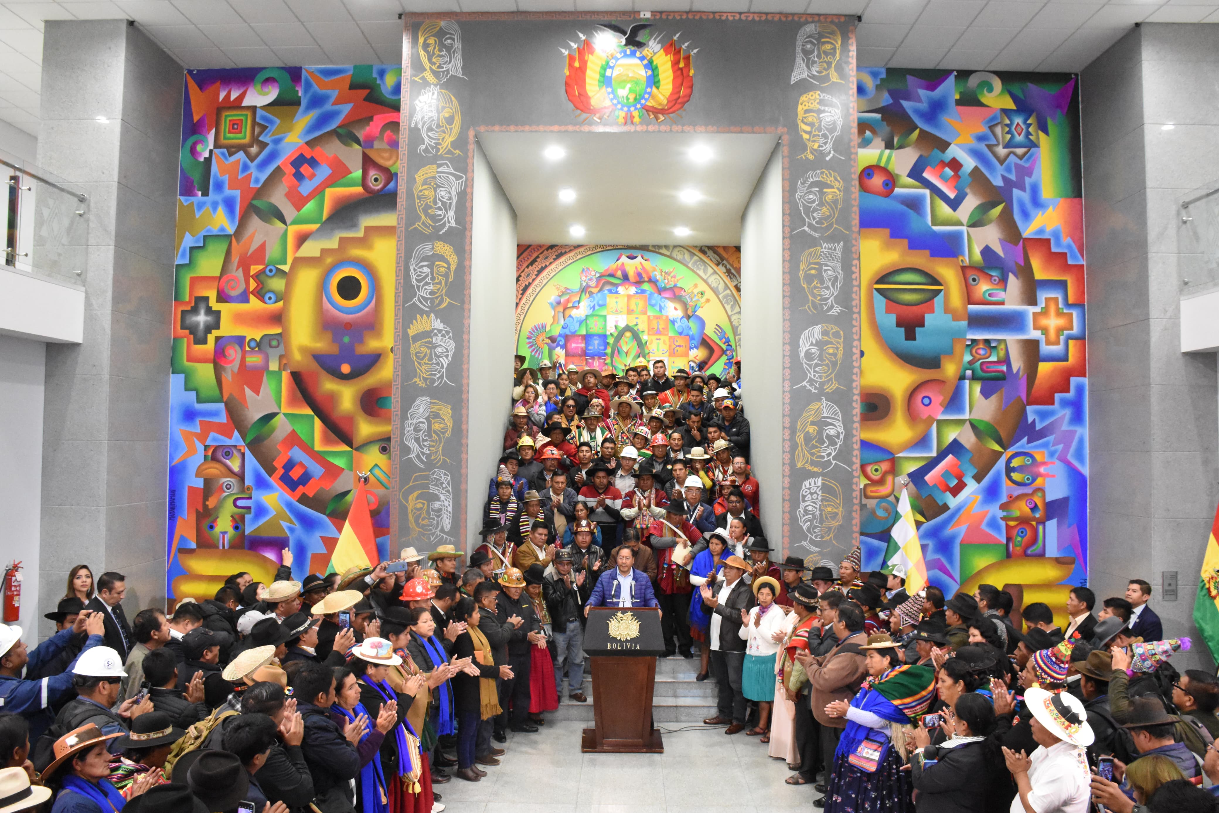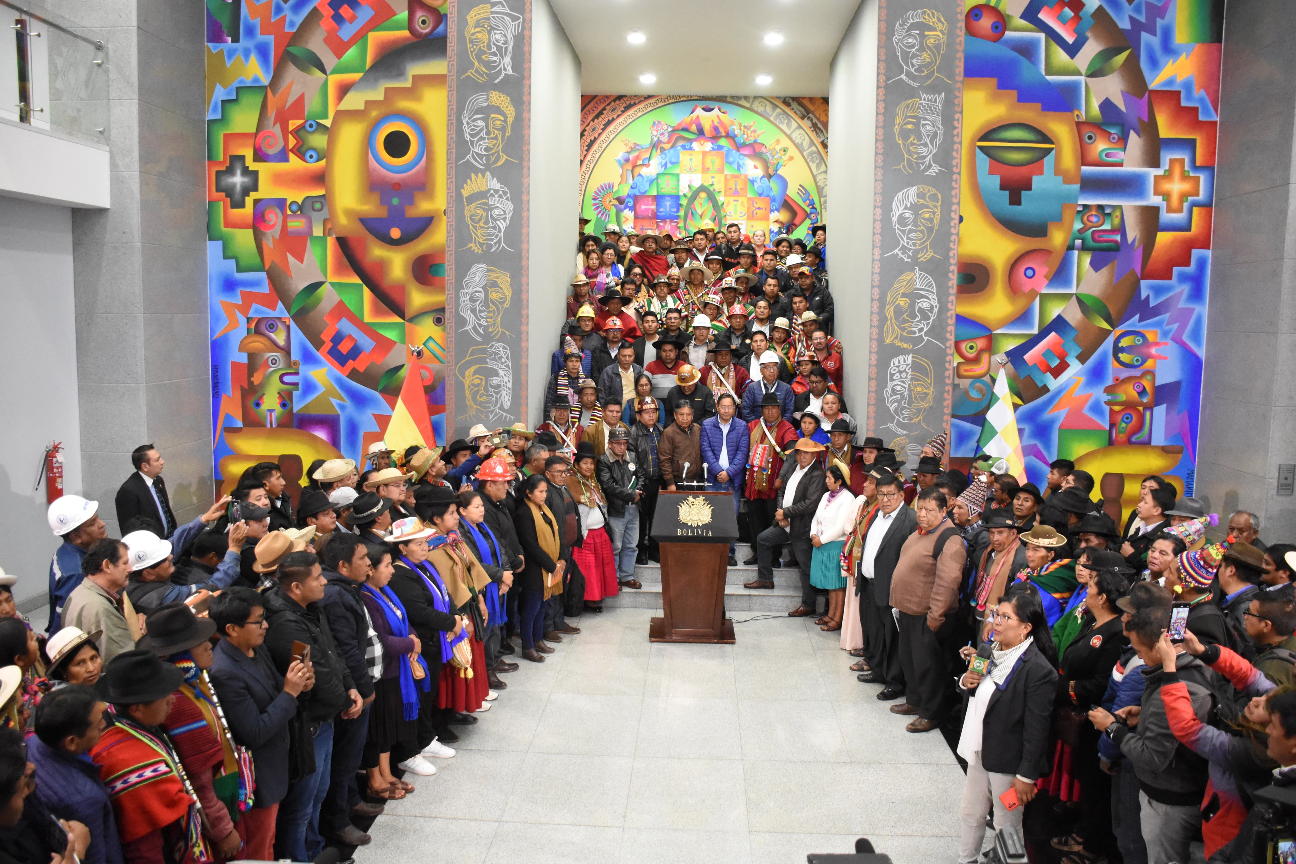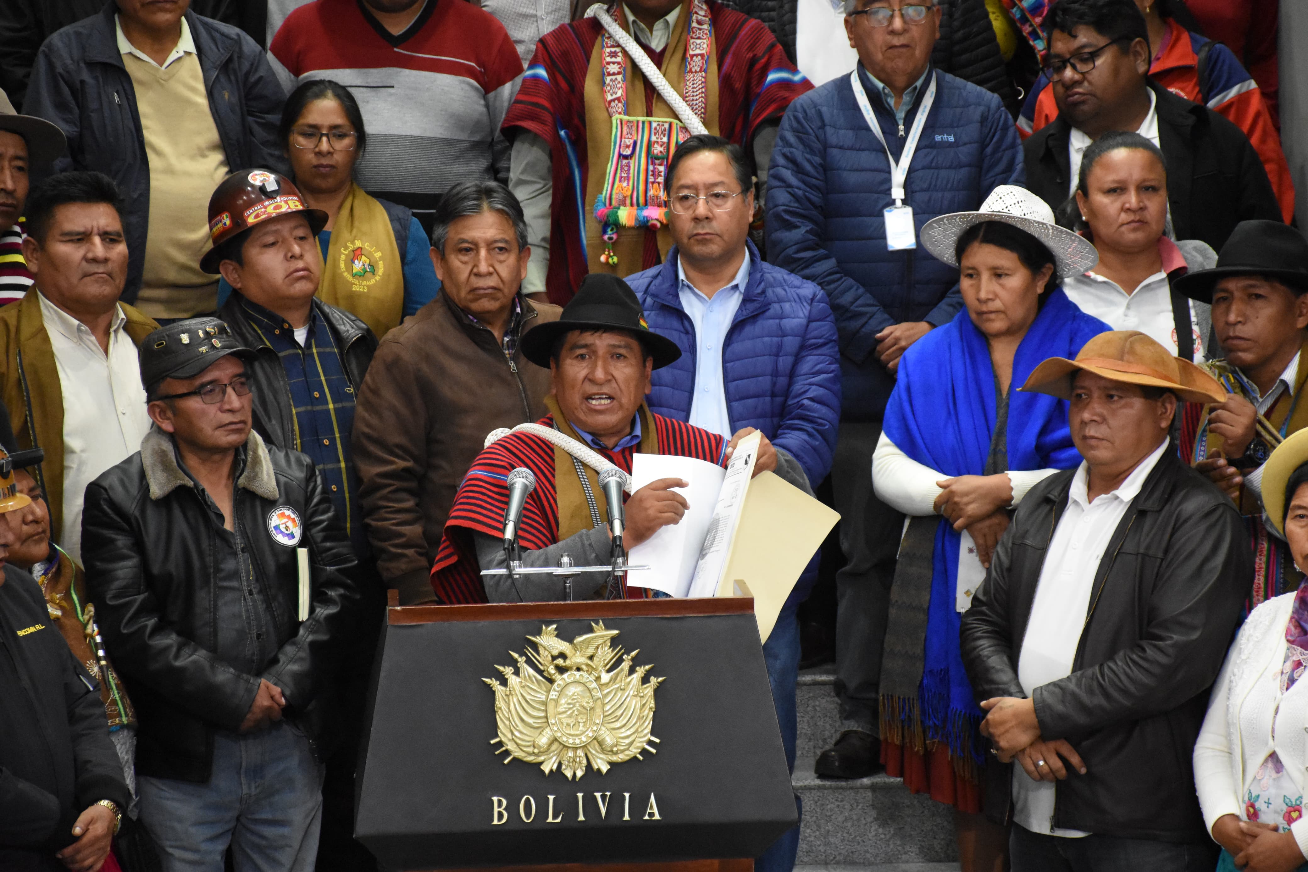 El presidente constitucional Luis Alberto Arce Catacora, conjuntamente el Pacto de Unidad y la Central Obrera Boliviana, brindan conferencia de prensa tras haber sostenido una reunión en Casa Grande del Pueblo