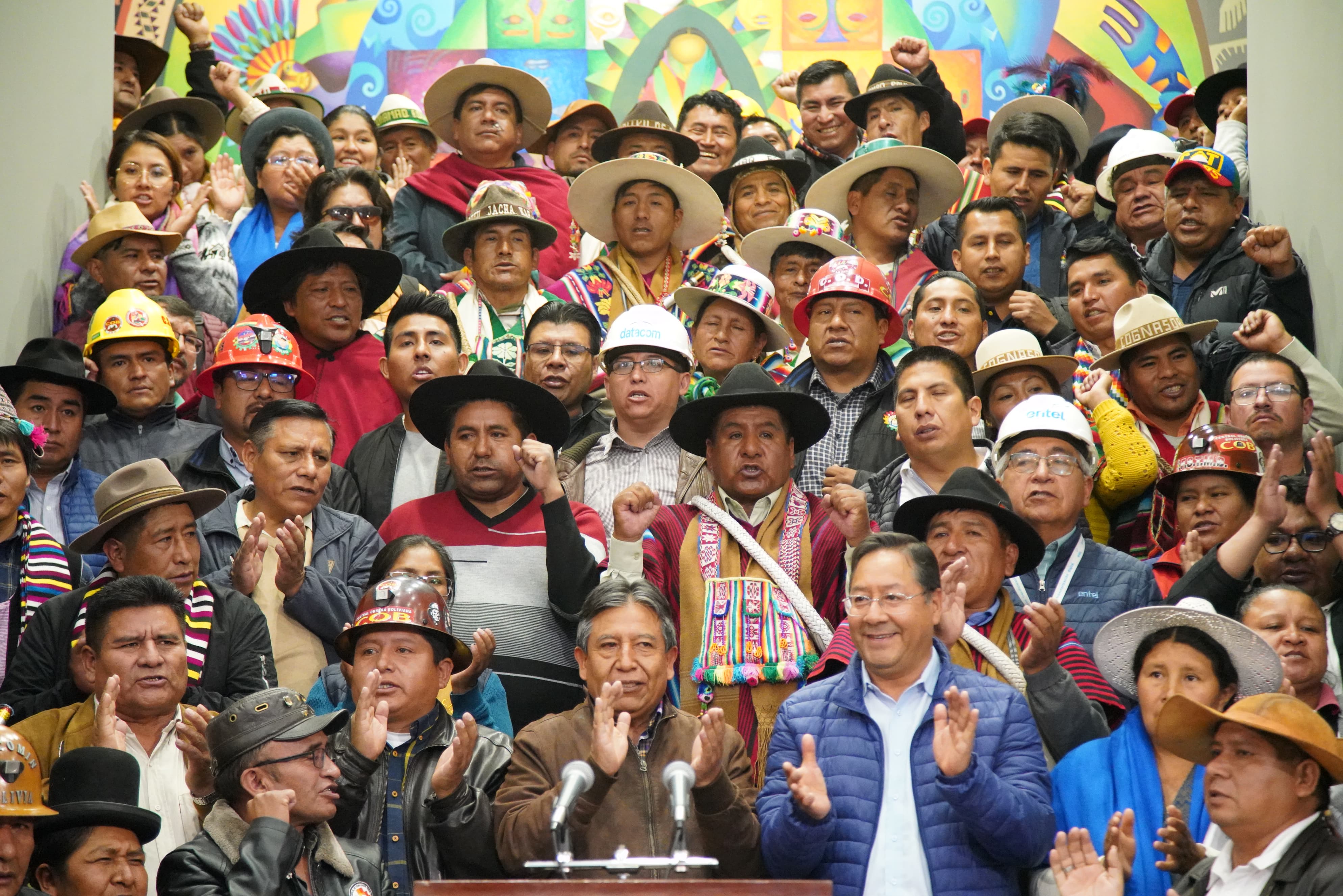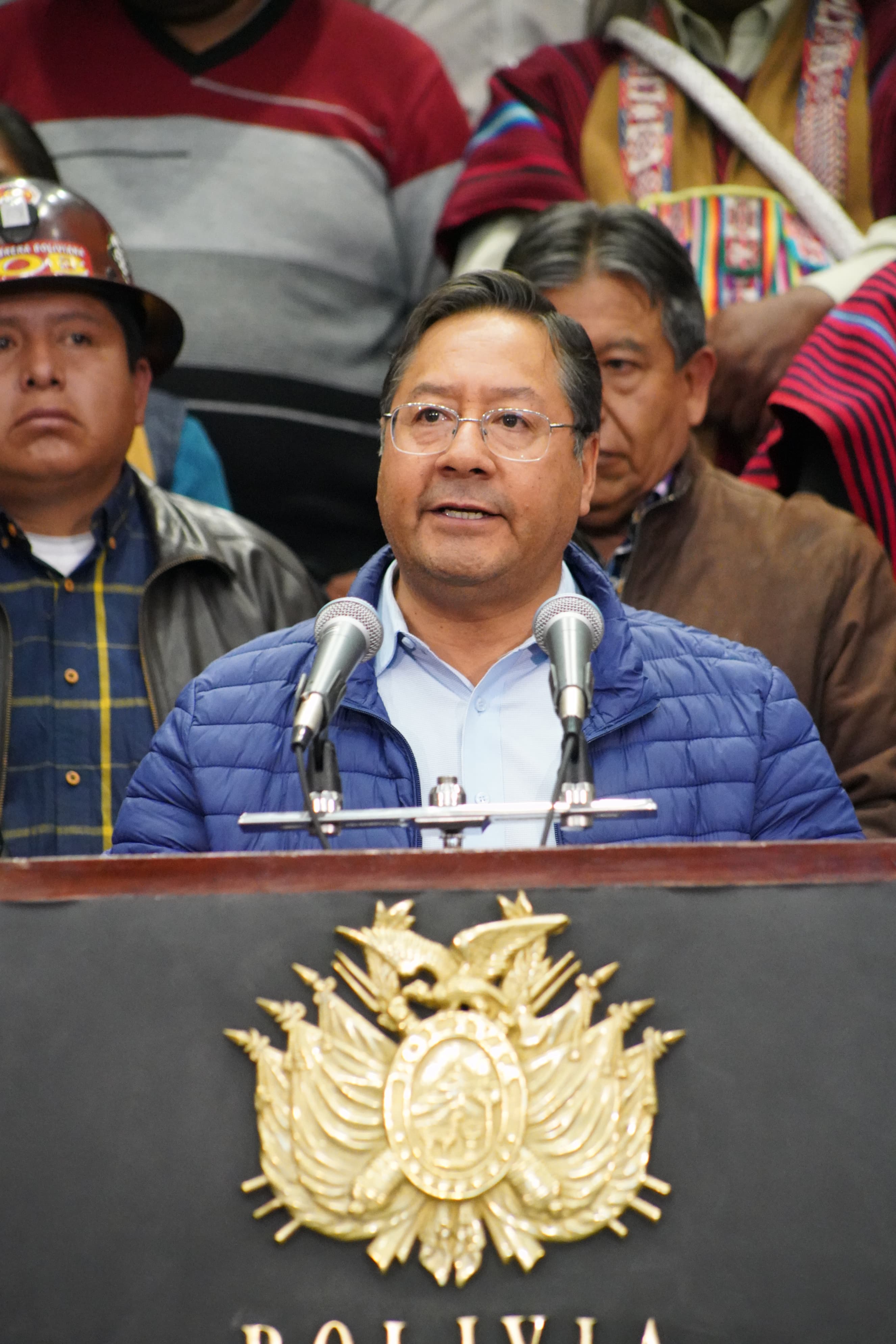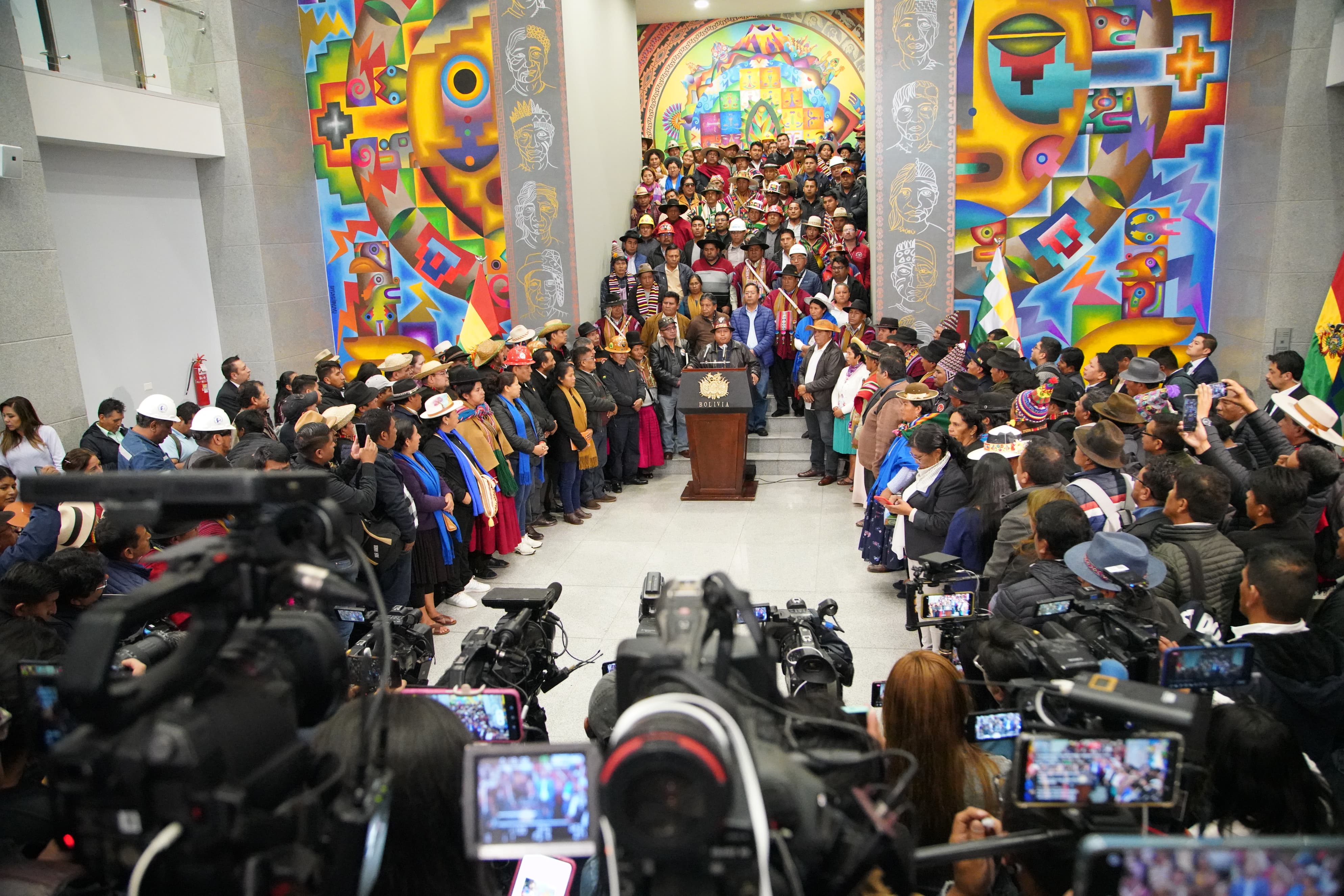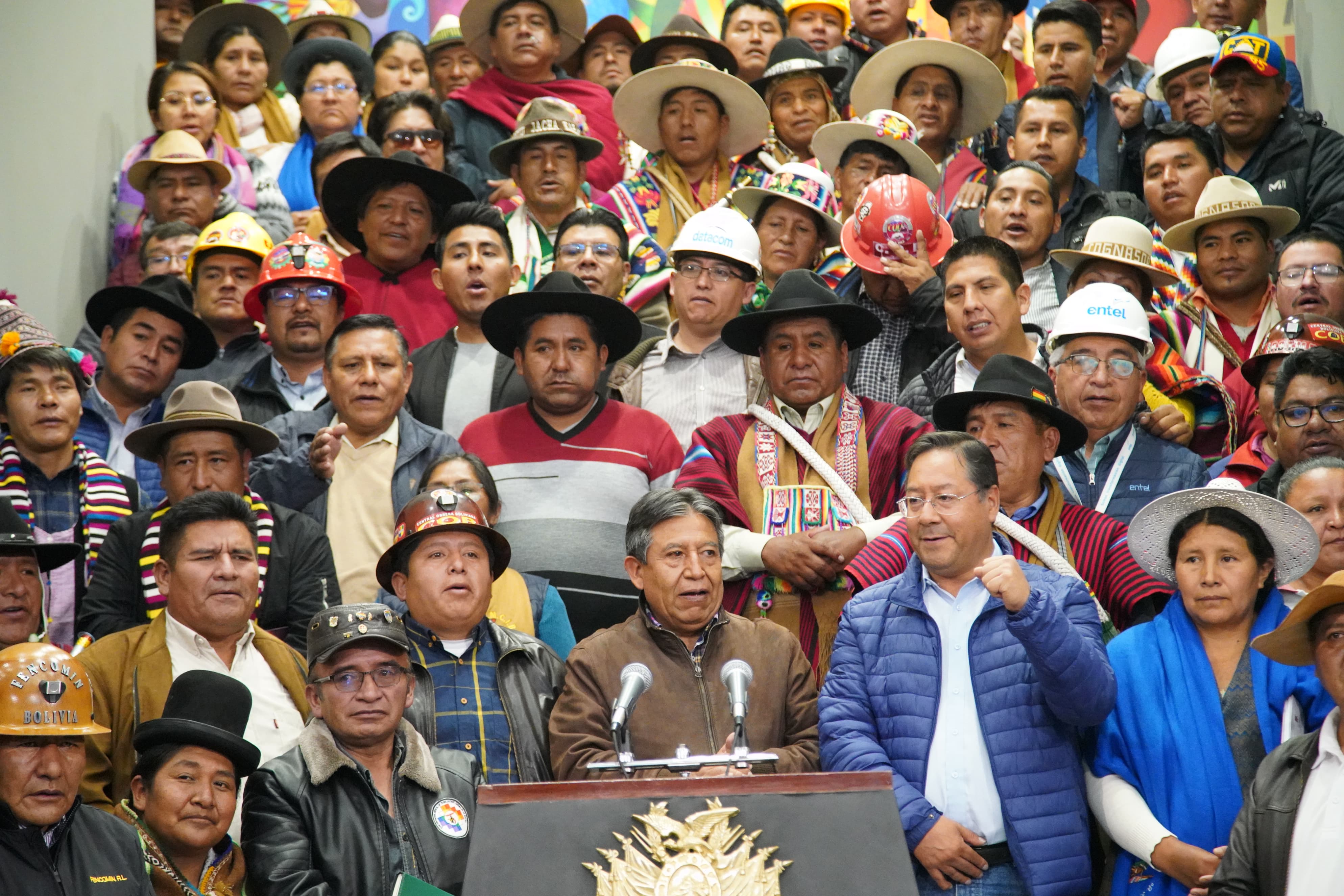 El presidente constitucional Luis Alberto Arce Catacora, conjuntamente el Pacto de Unidad y la Central Obrera Boliviana, brindan conferencia de prensa tras haber sostenido una reunión en Casa Grande del Pueblo (Parte 02)