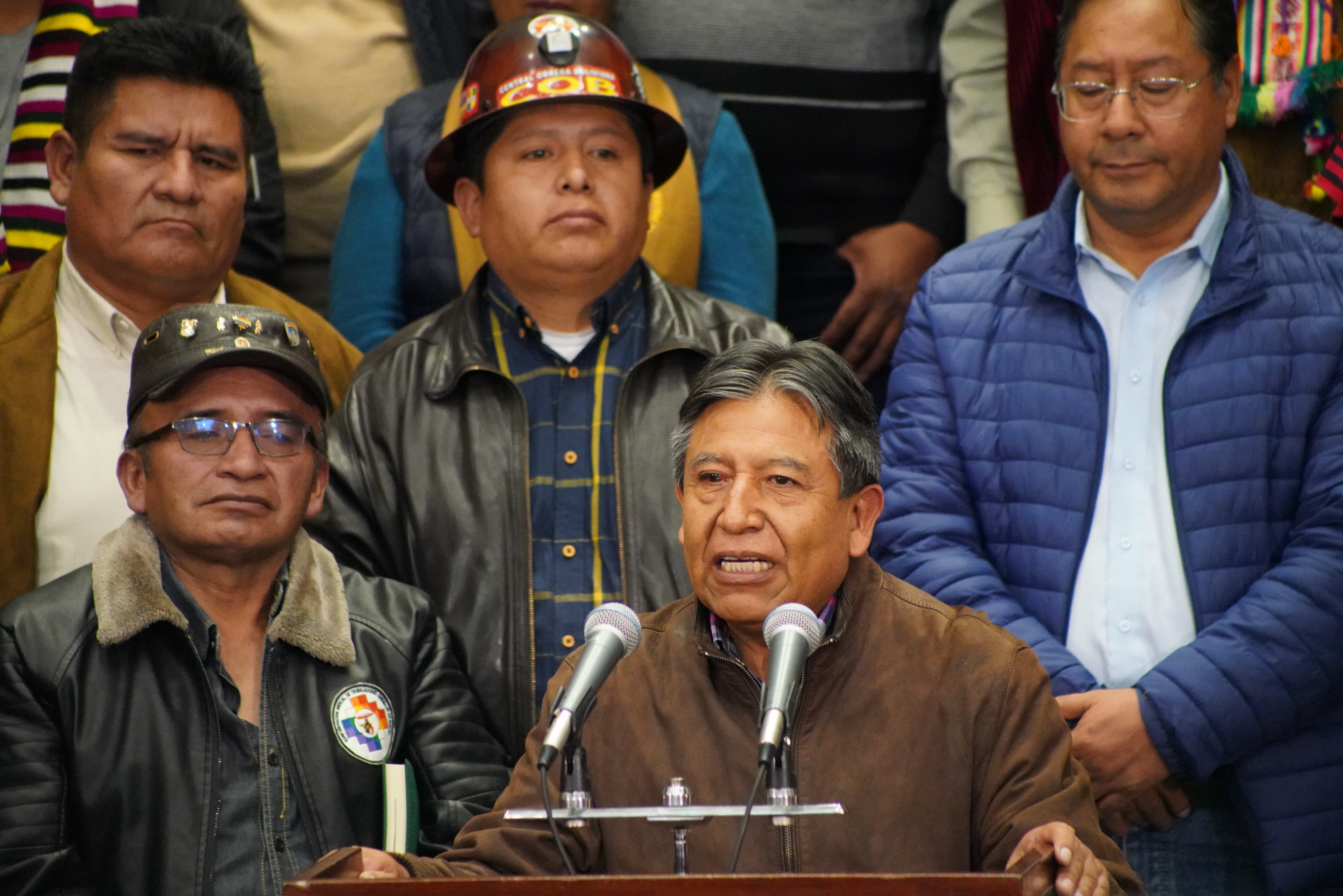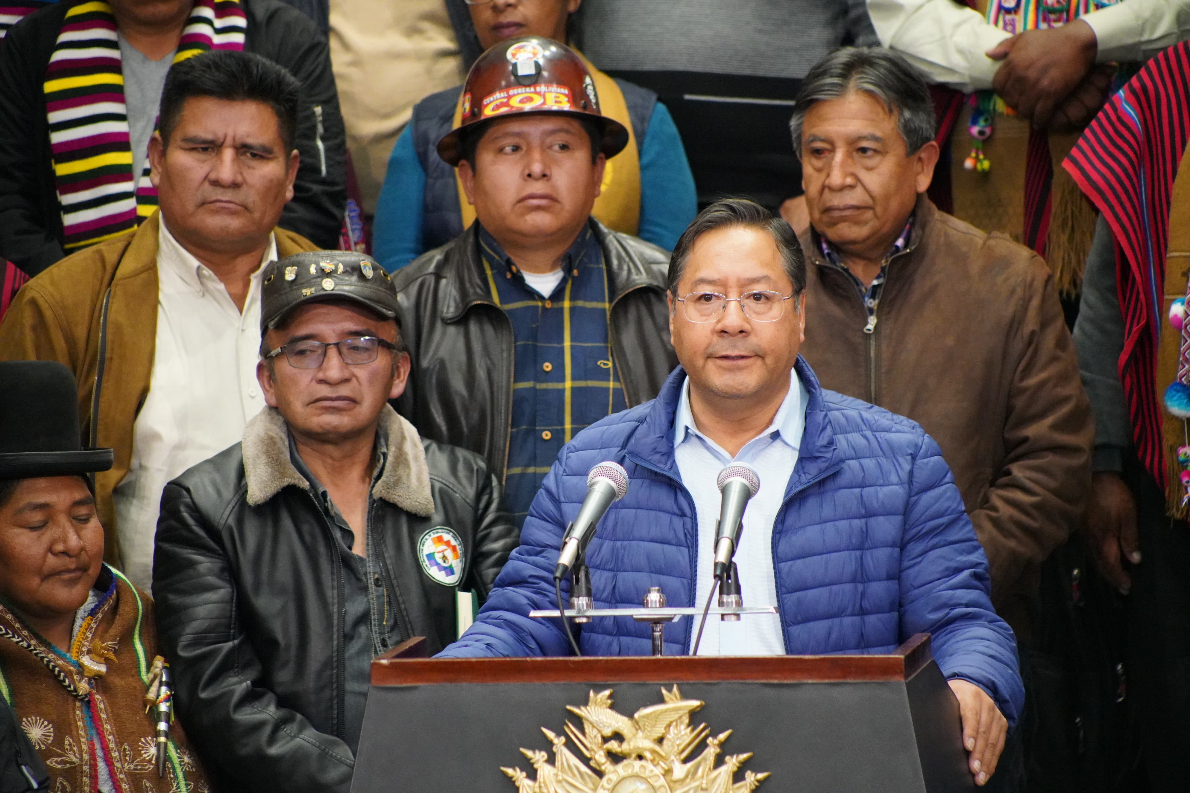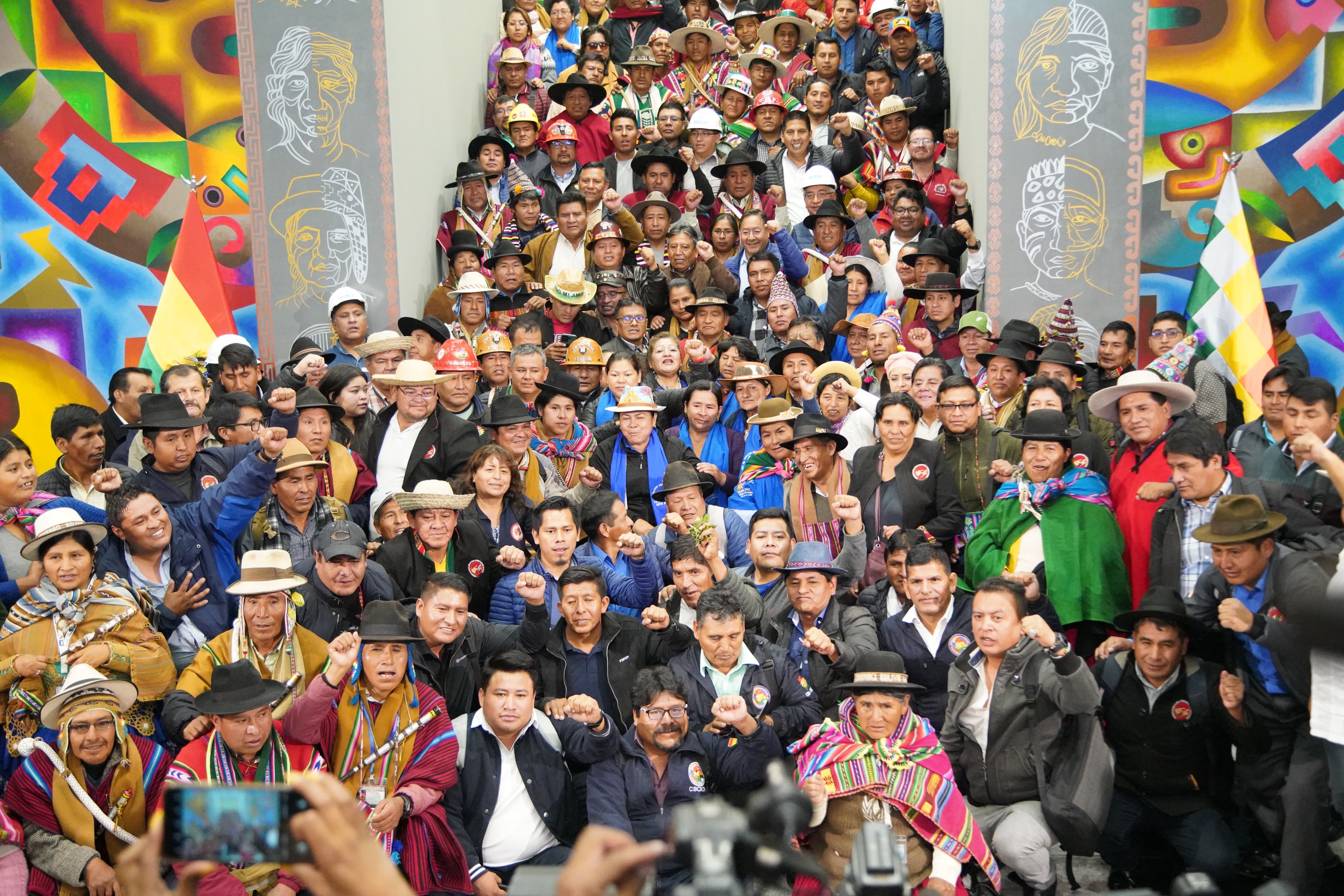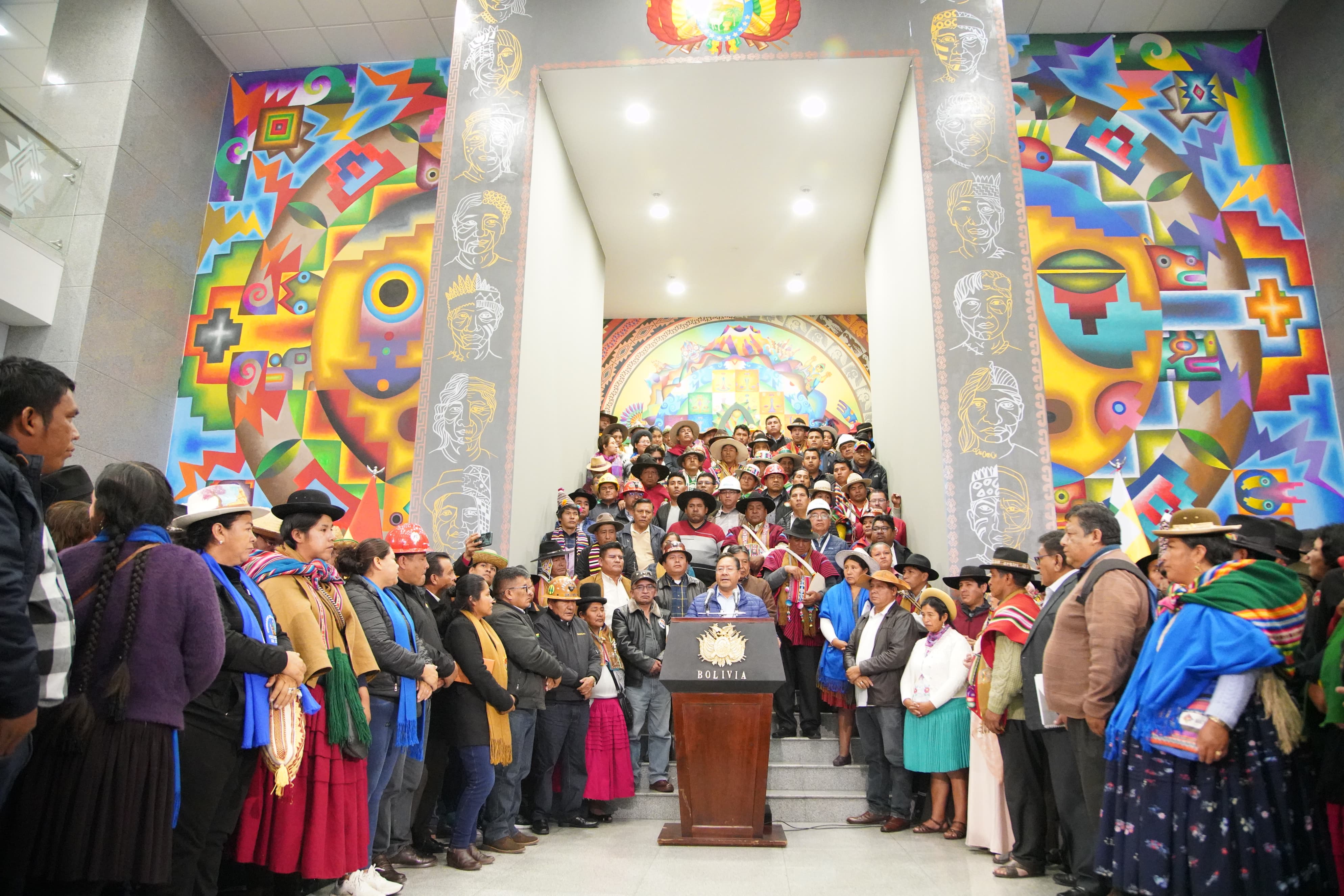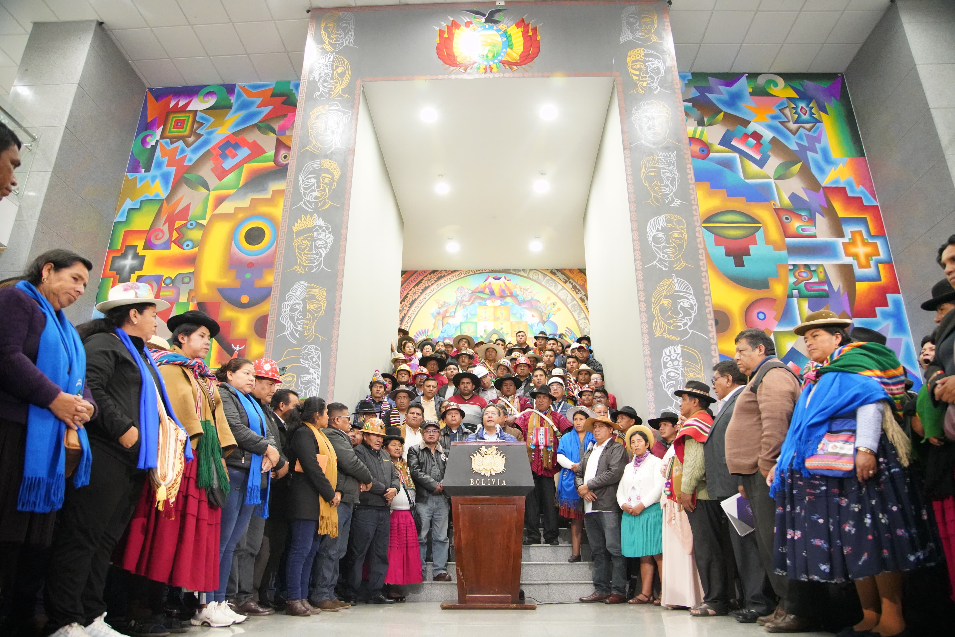 El presidente constitucional Luis Alberto Arce Catacora, conjuntamente el Pacto de Unidad y la Central Obrera Boliviana, brindan conferencia de prensa tras haber sostenido una reunión en Casa Grande del Pueblo (Parte 02)