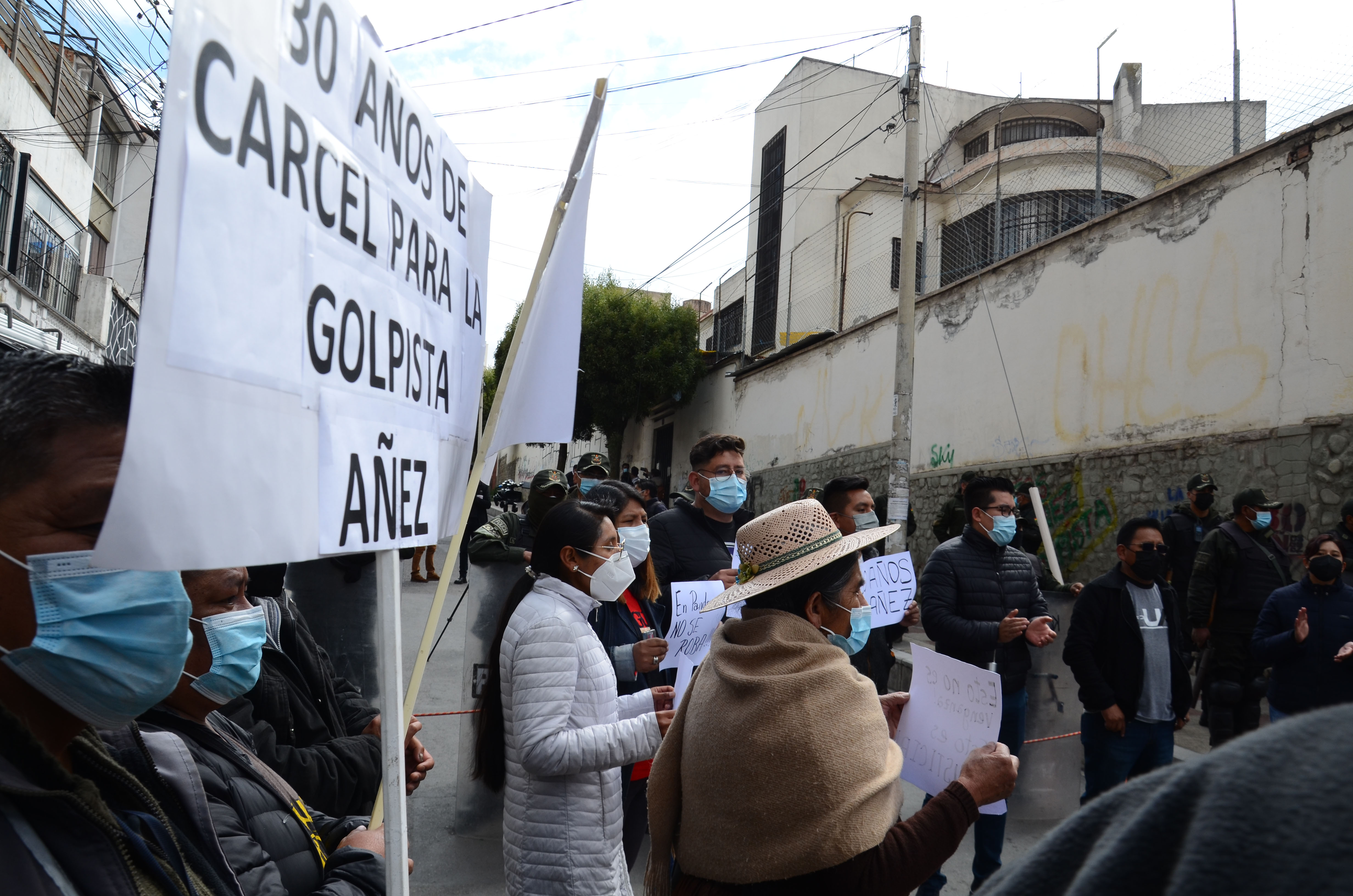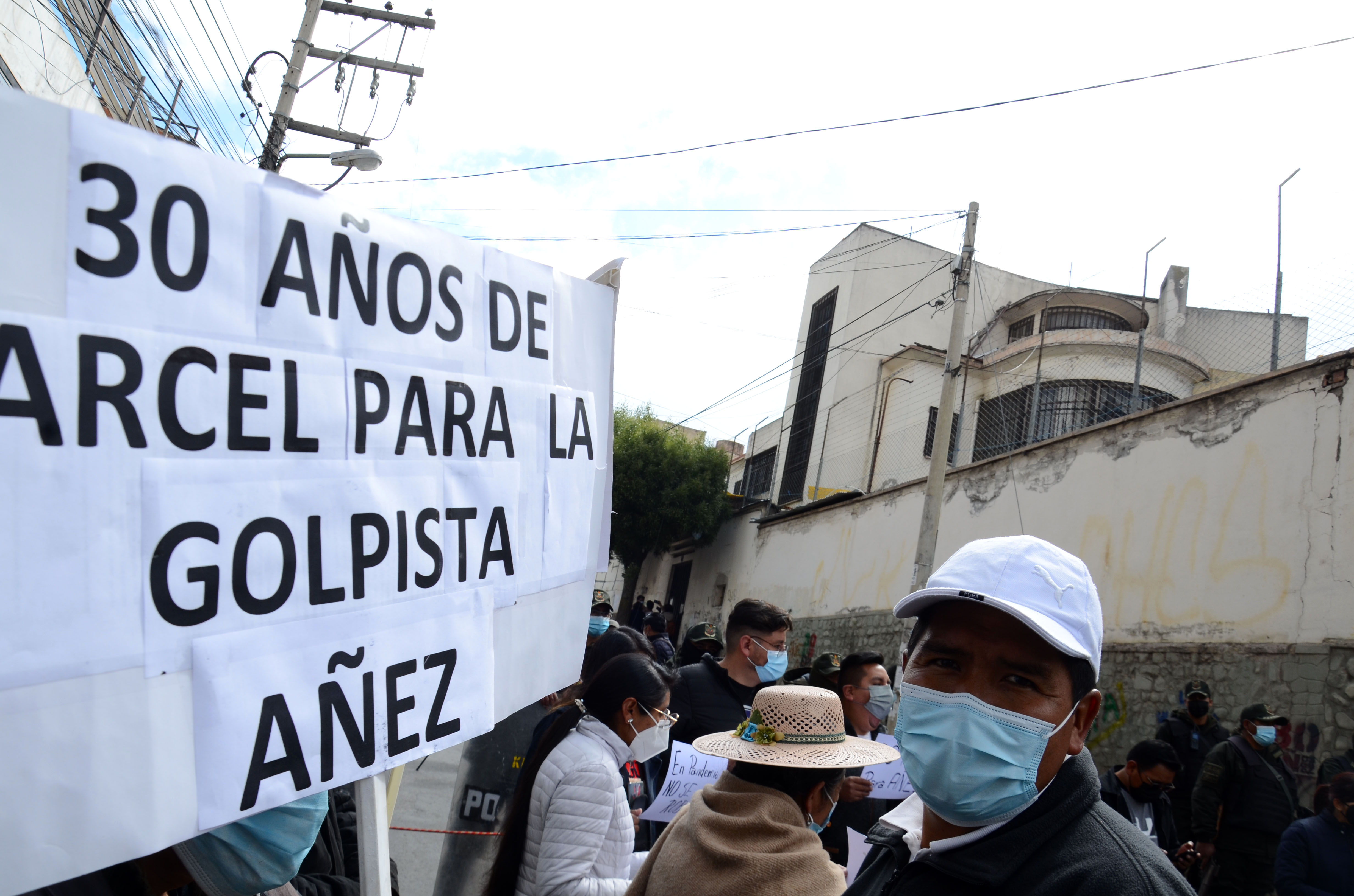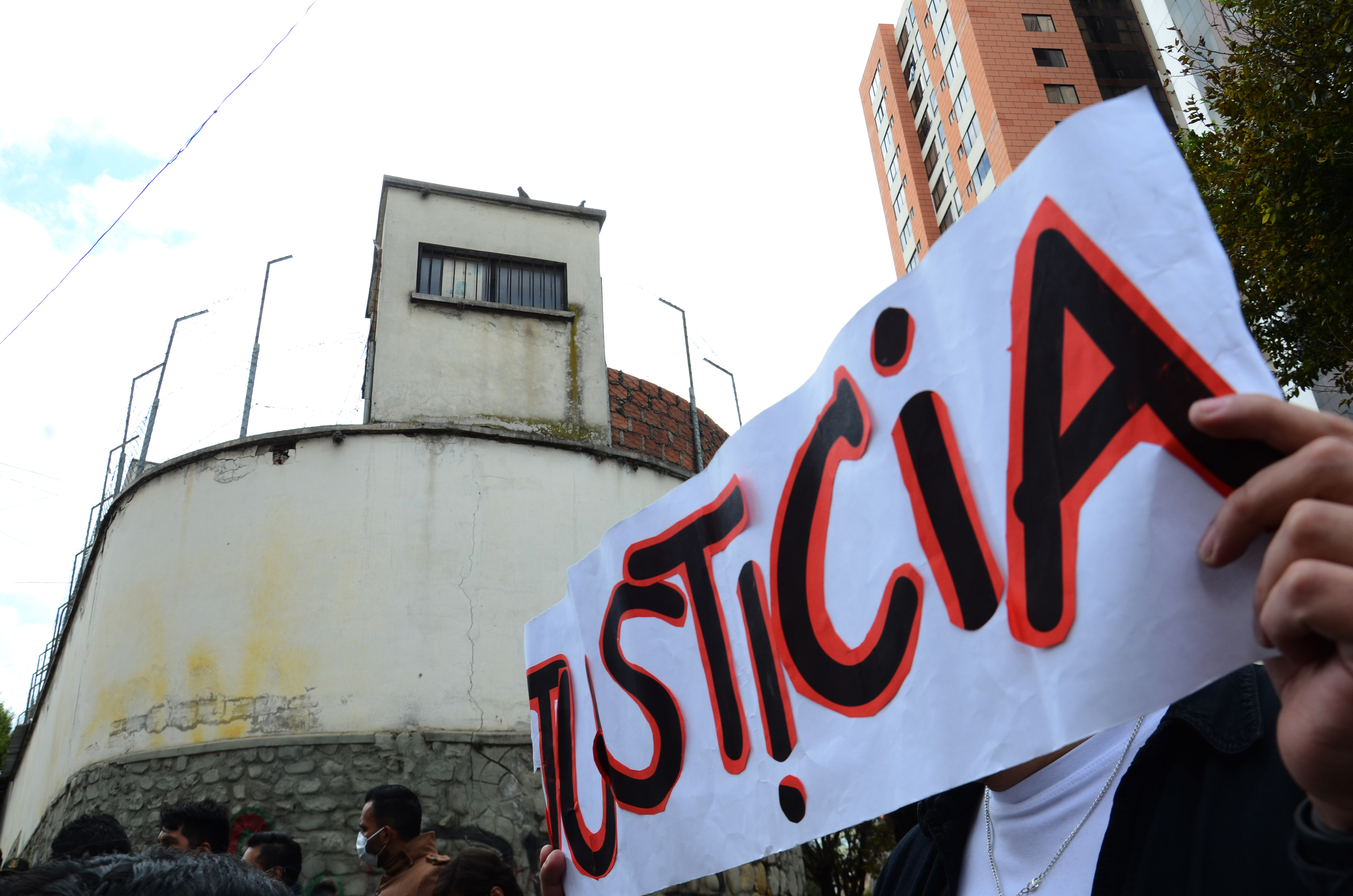 Personas protestan y piden sentencia de 30 años para Jeanine Áñez en afueras del centro penitenciario de Miraflores, mientras se realiza la audiencia a la exsenadora Jeanine Áñez.Usuario ABIGalería Fotográfica 08 Abril 2022 Visto: 18126ShareTwittearshare with Whatsappshare with TelegramFotos: Josué Cortéz / ABI AnteriorSiguiente