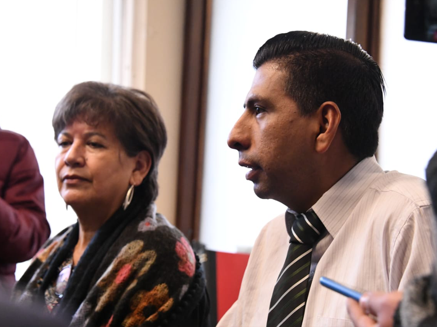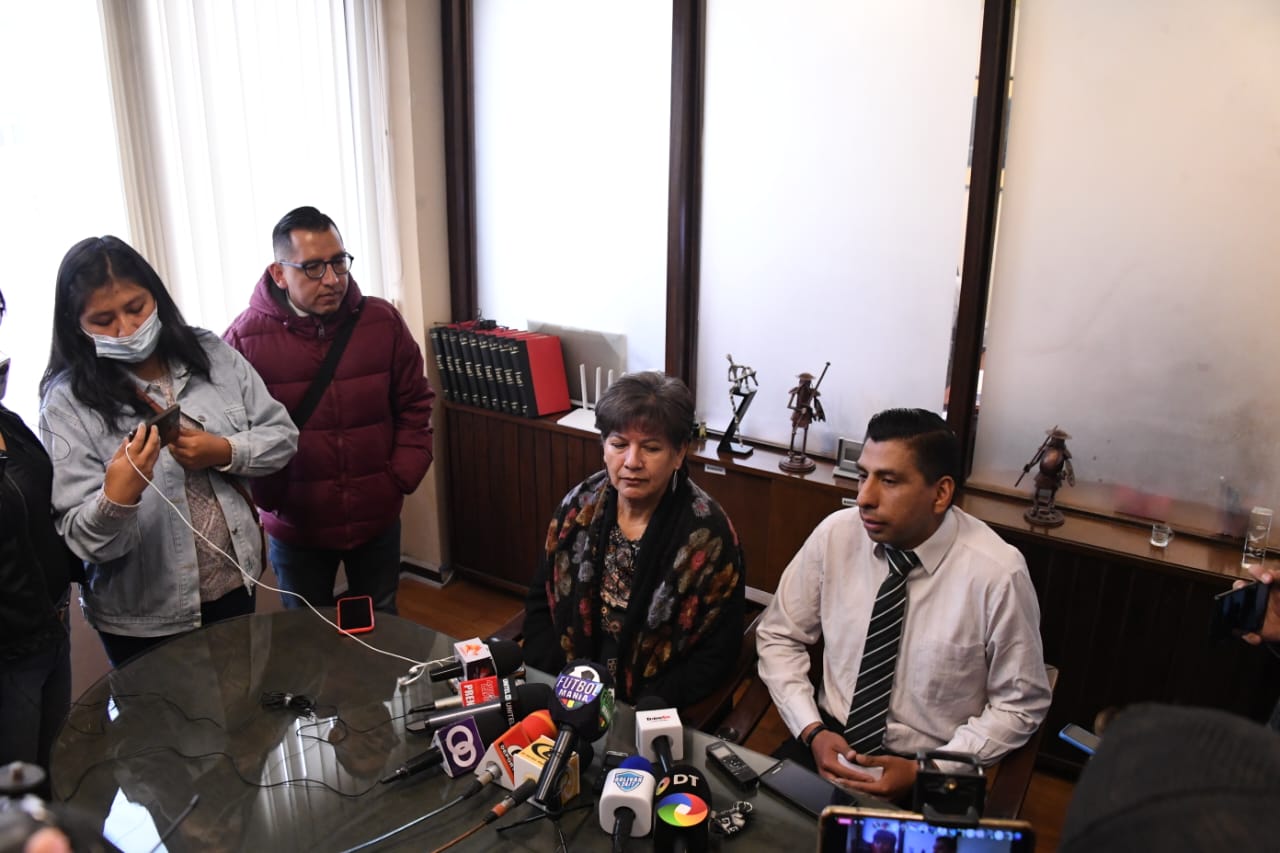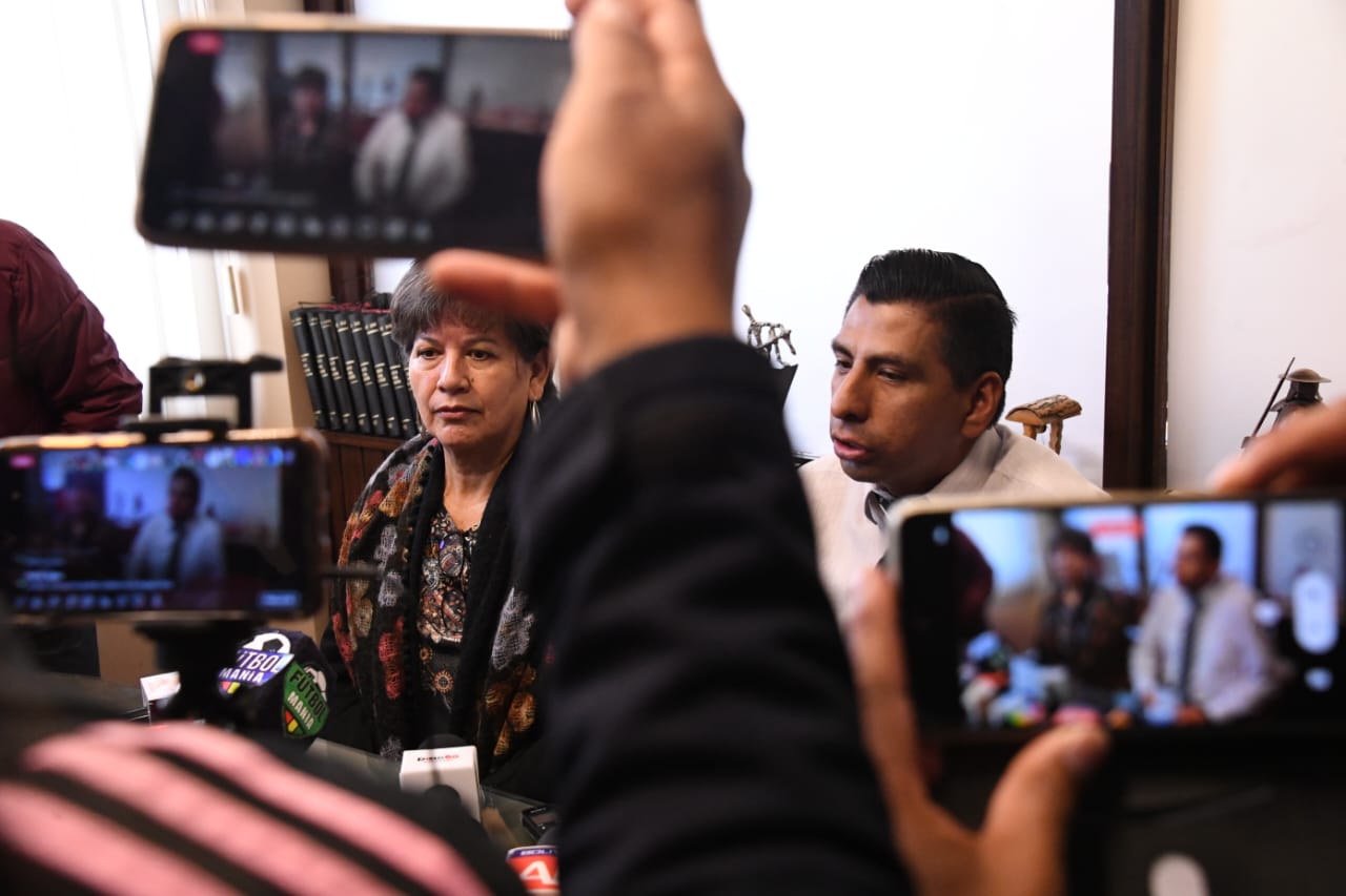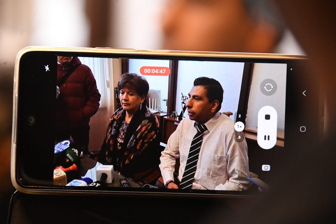Gaad Flores, árbitro de fútbol, y Audalia Zurita, abogada, brindan conferencia de prensa en relación al caso amaños en el fútbol boliviano.