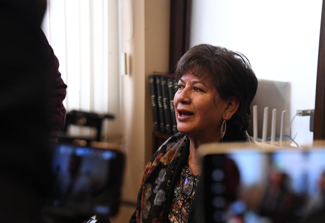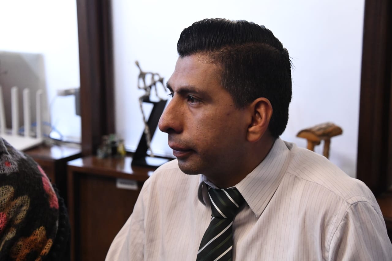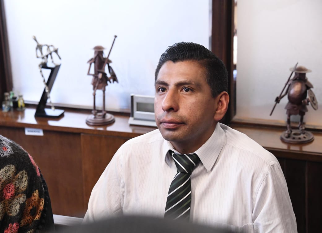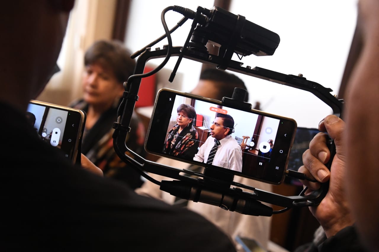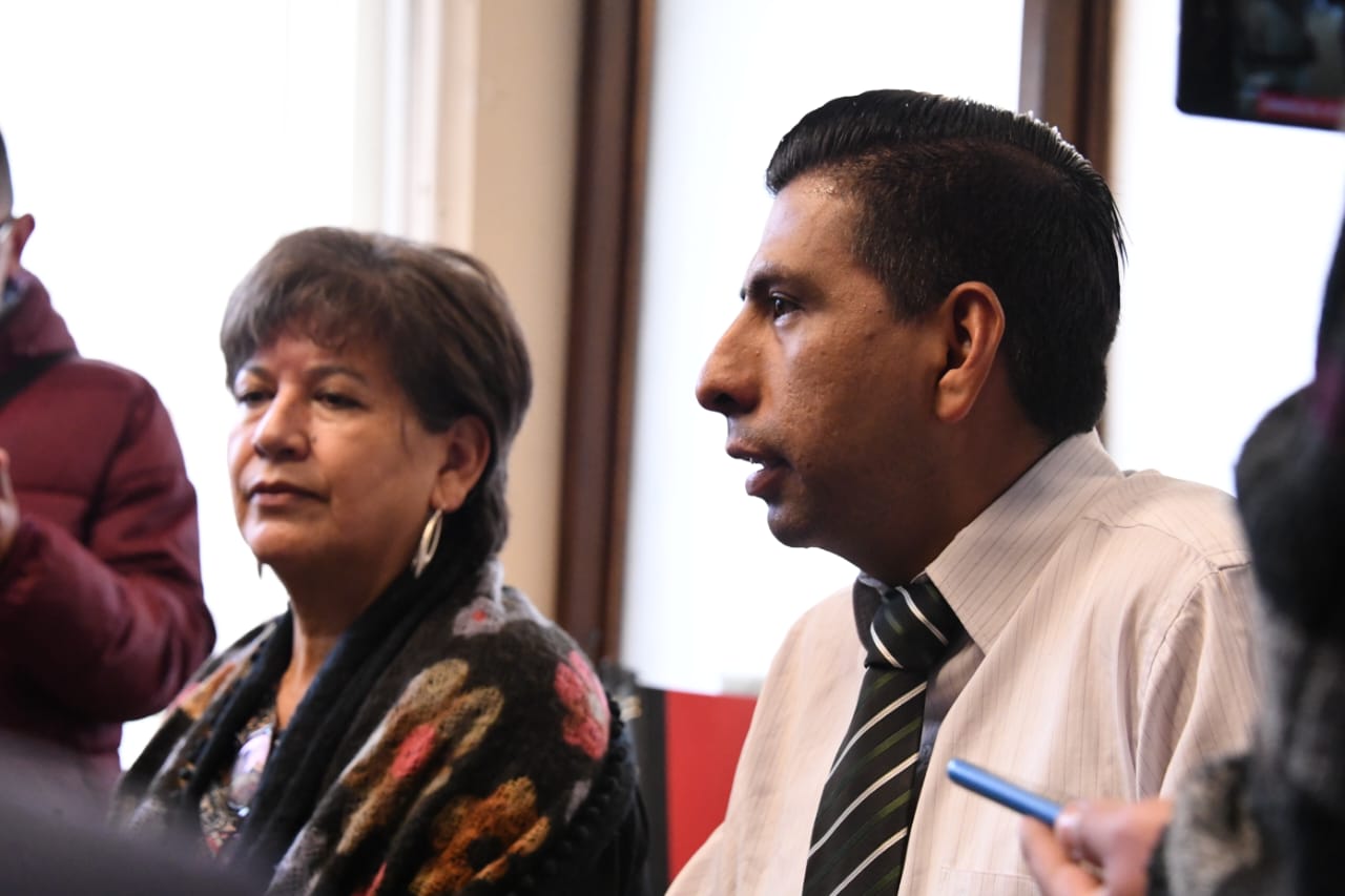 Gaad Flores, árbitro de fútbol, y Audalia Zurita, abogada, brindan conferencia de prensa en relación al caso amaños en el fútbol boliviano.