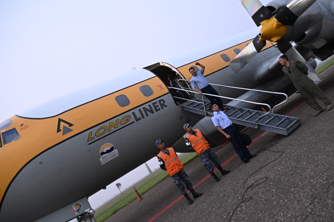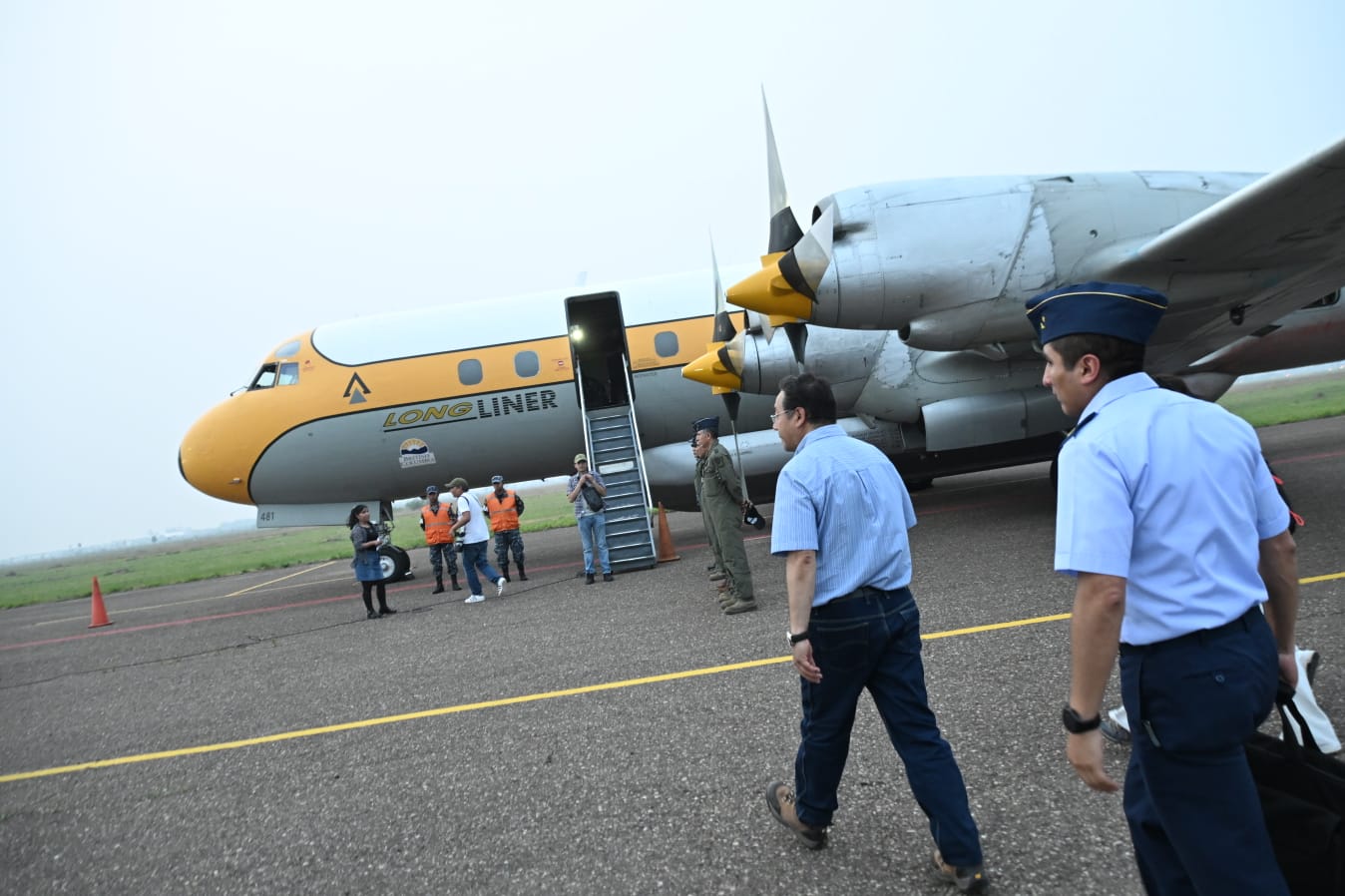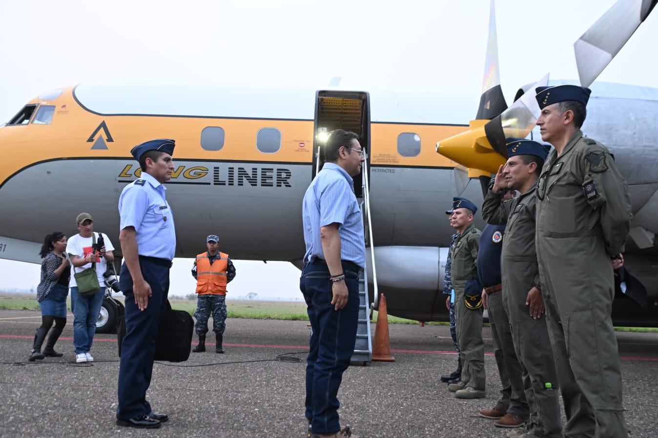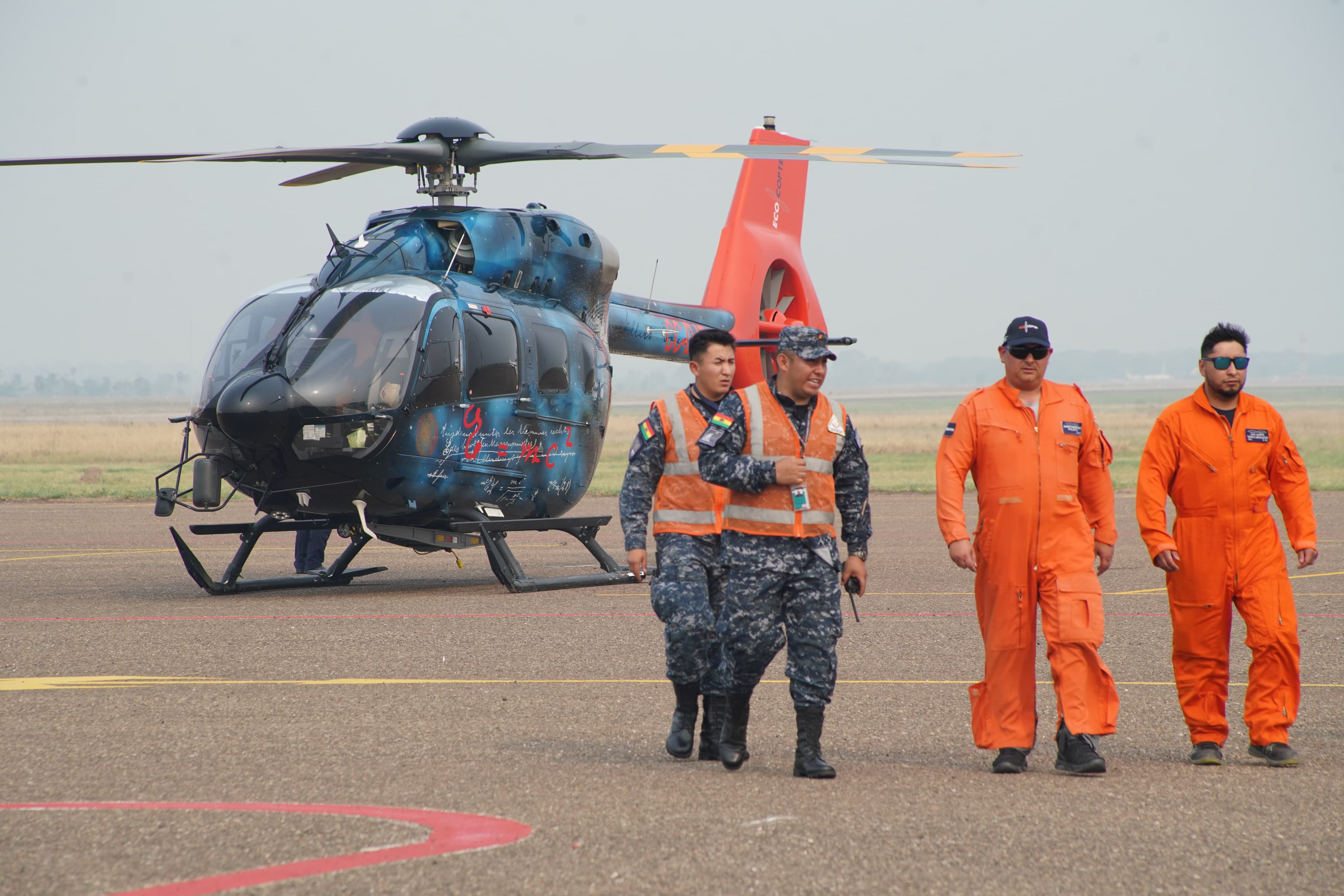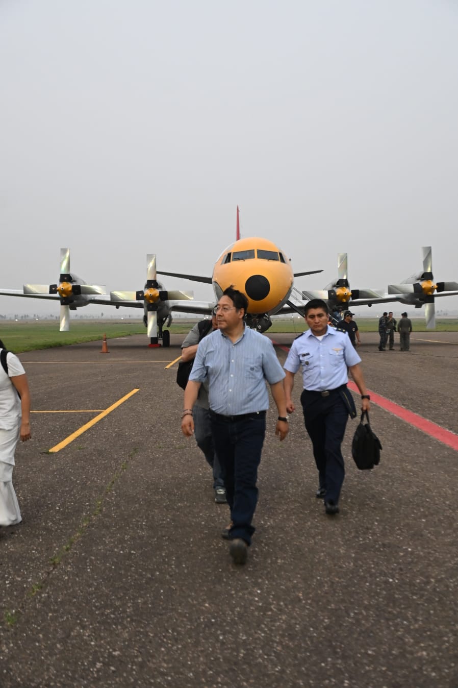 El presidente del Estado, Luis Arce Catacora, inspecciona la llegada del avión ELECTRA TANKER 481 y el helicóptero Airbus BK 117 D3 para fortalecer la lucha contra los incendios en Santa Cruz