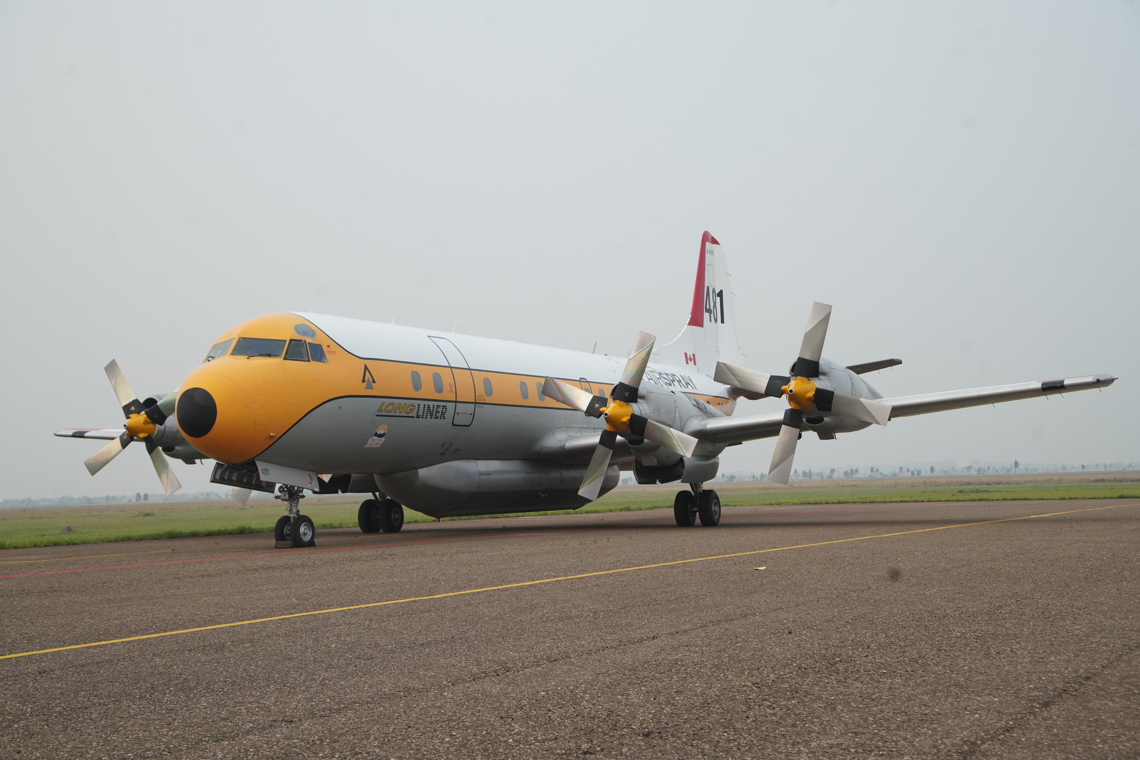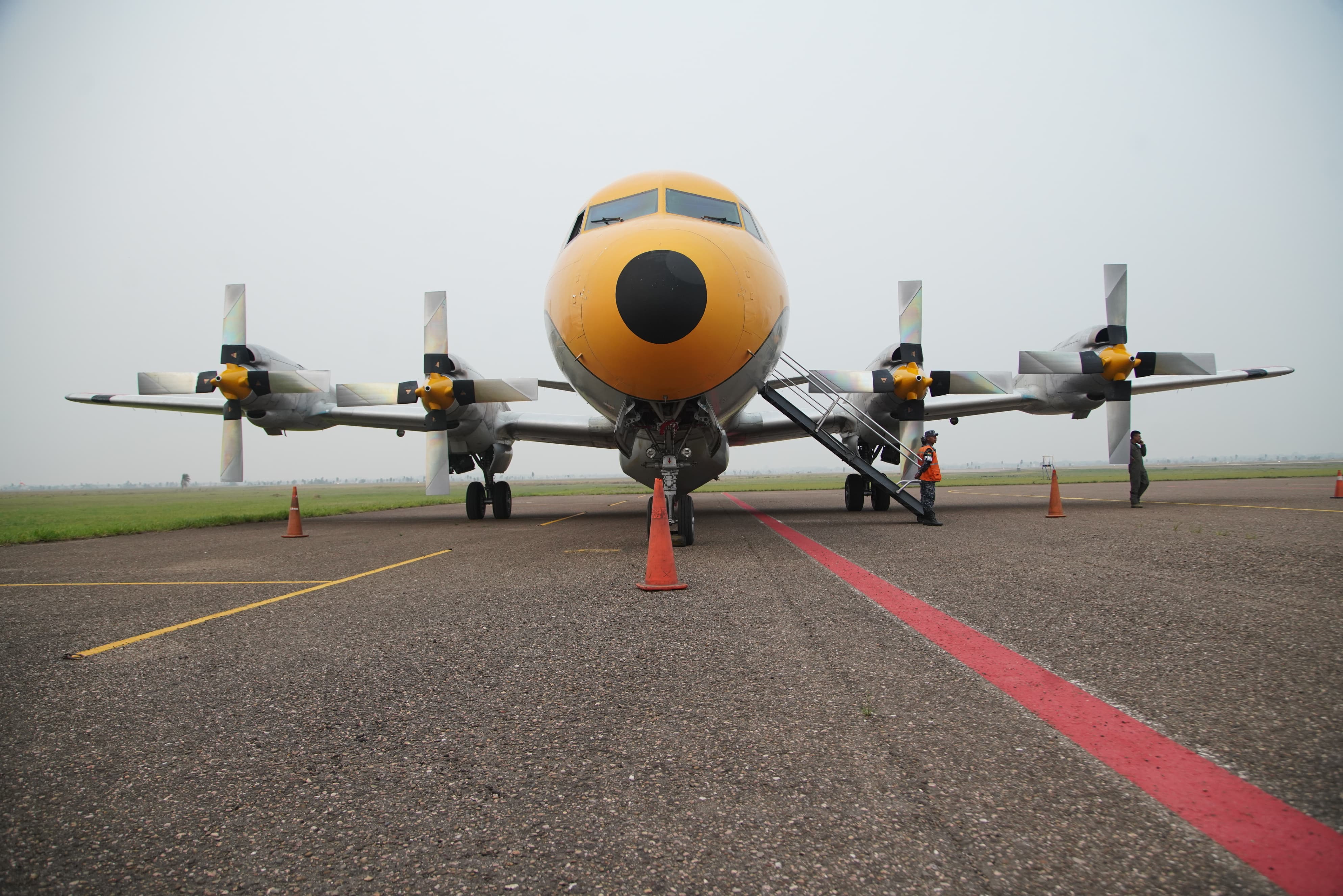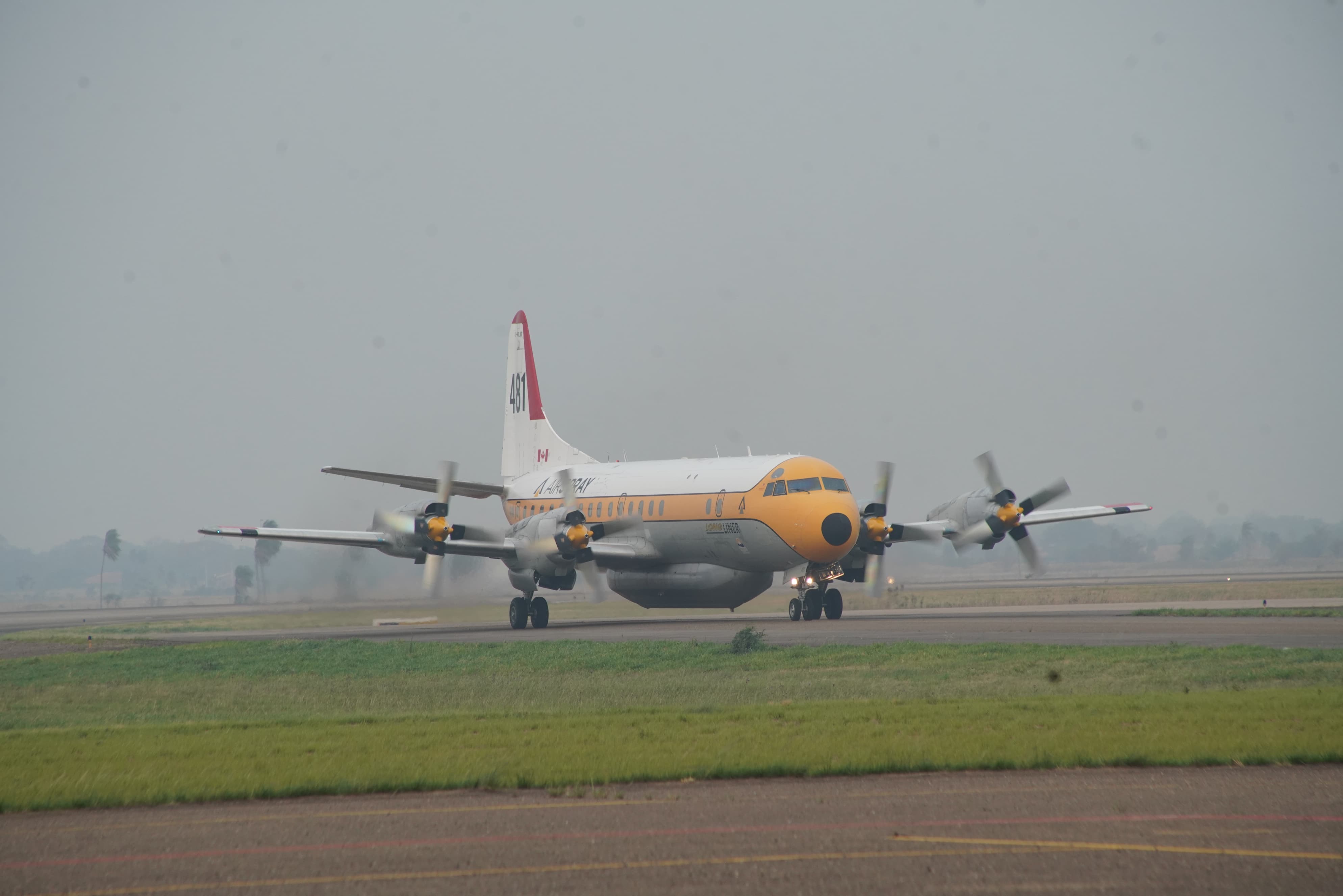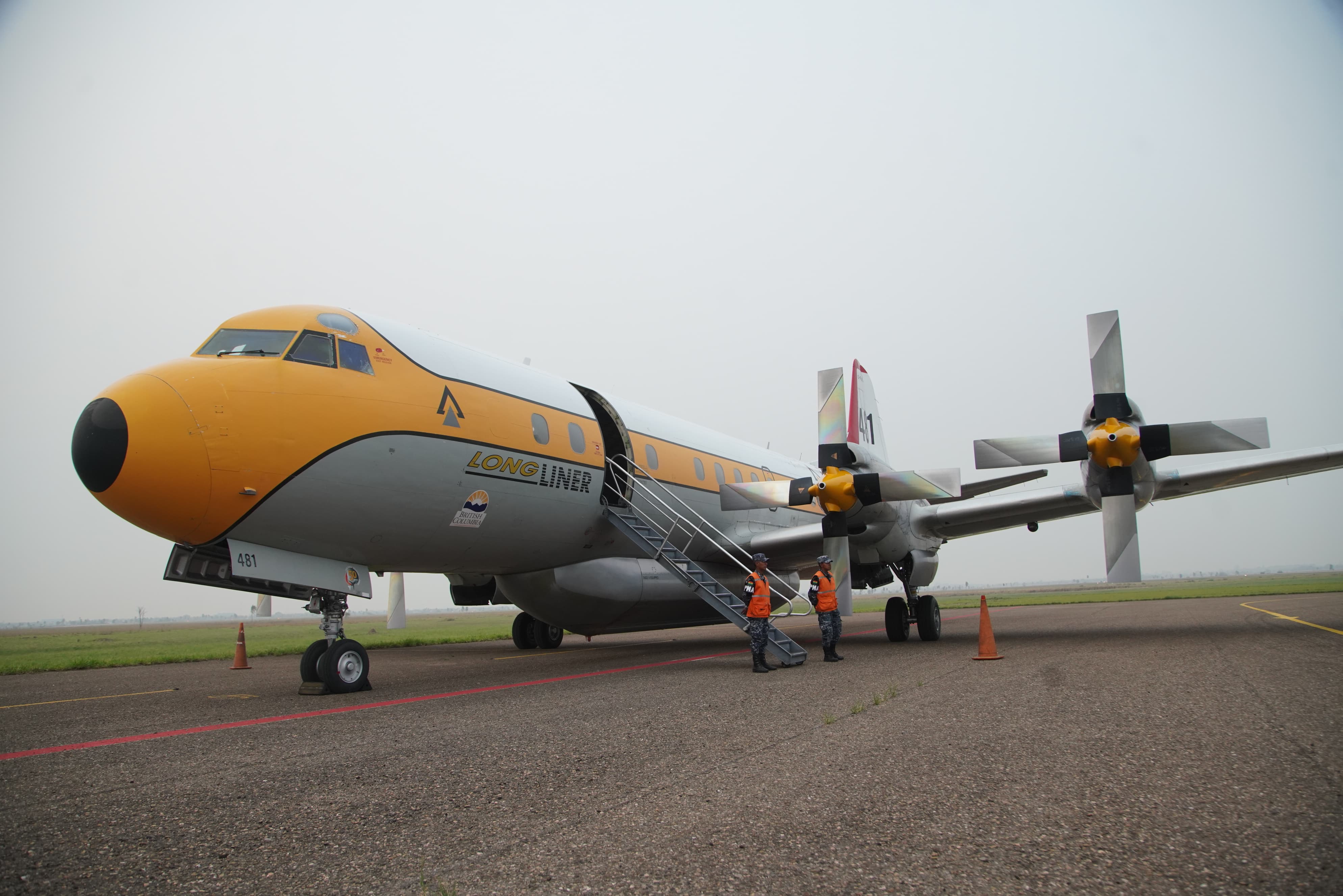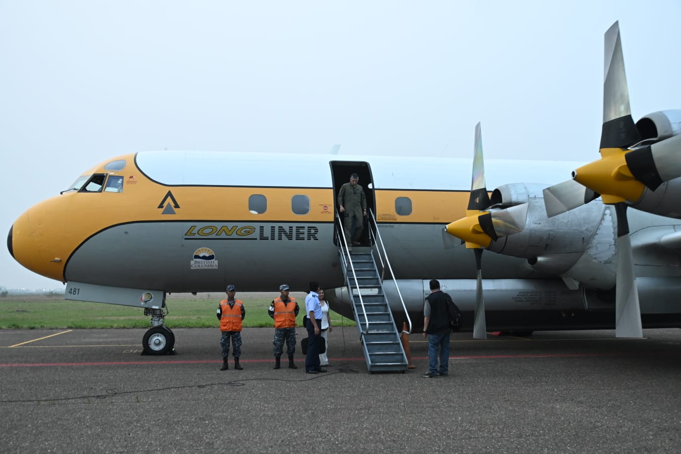 El presidente del Estado, Luis Arce Catacora, inspecciona la llegada del avión ELECTRA TANKER 481 y el helicóptero Airbus BK 117 D3 para fortalecer la lucha contra los incendios en Santa Cruz