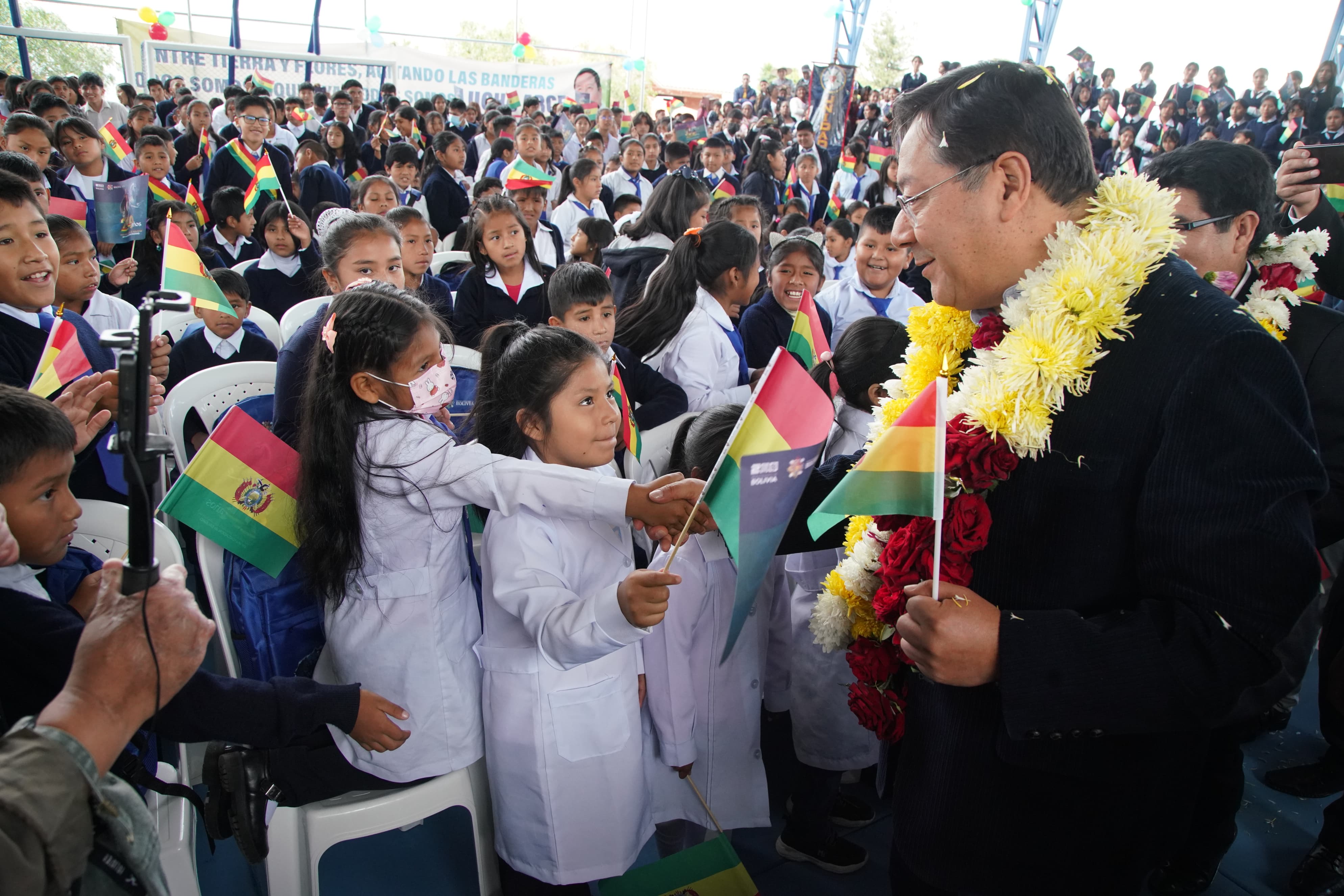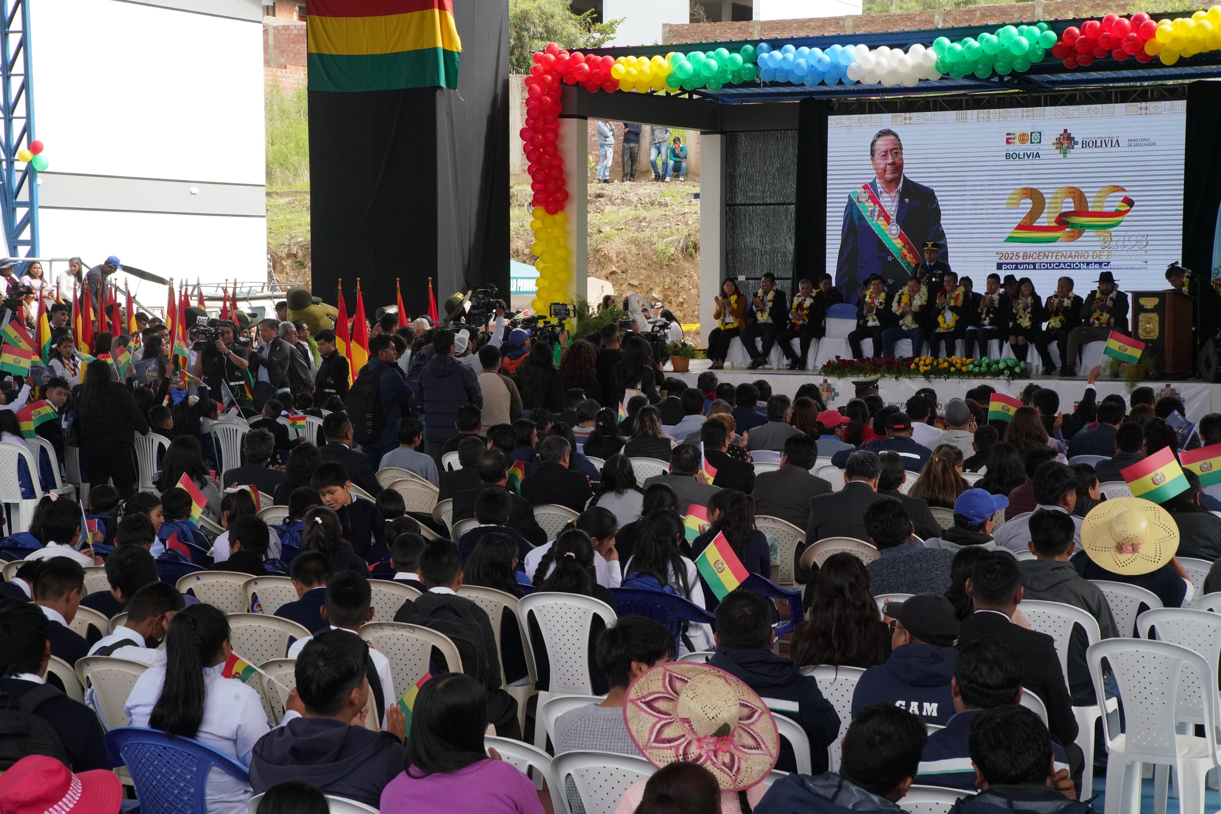 El Presidente del Estado Plurinacional de Bolivia, Luis Arce Catacora, inaugura el Calendario Escolar 2025 en Tiquipaya, Cochabamba, y entrega la Unidad Educativa 26 de Febrero