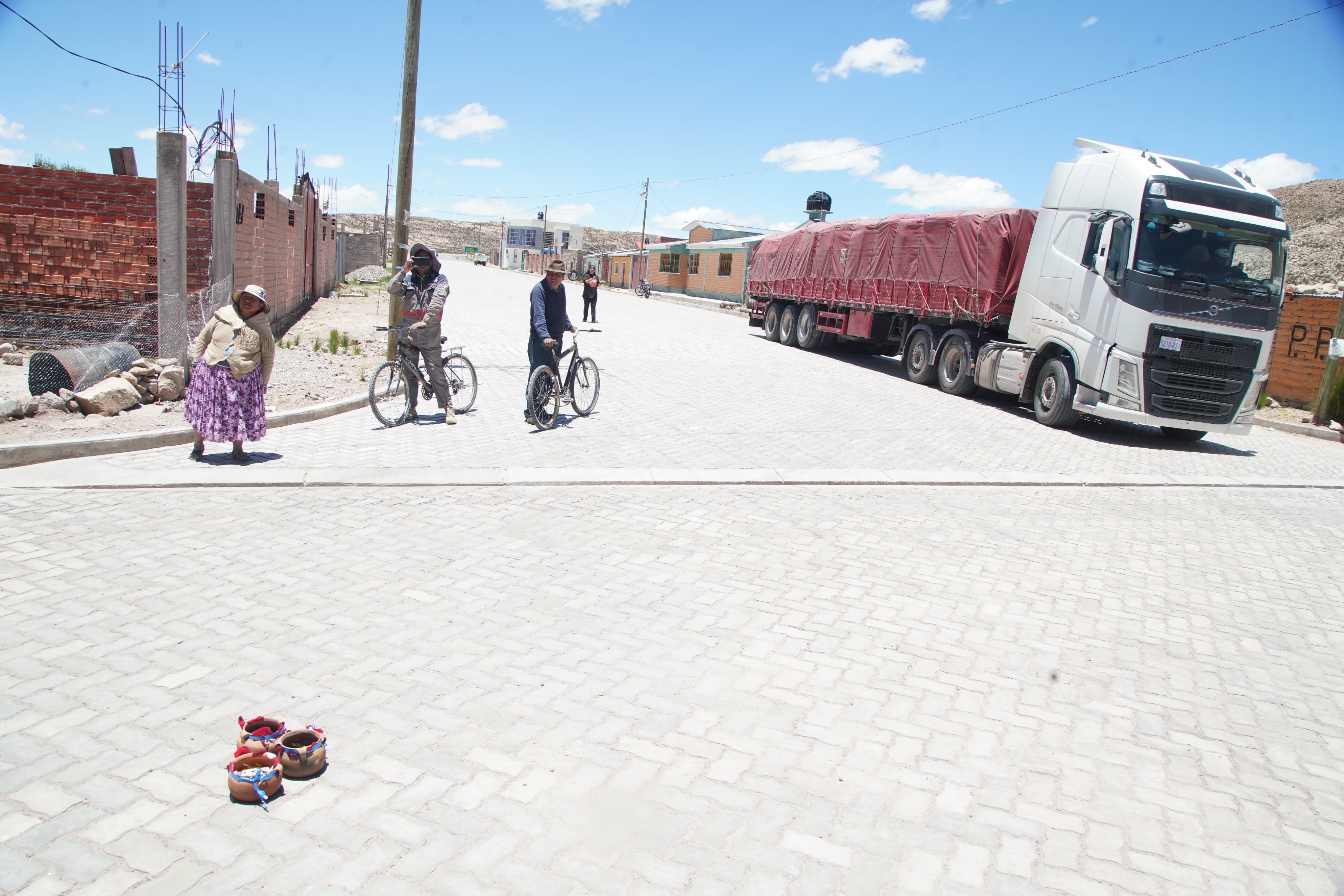 El Presidente del Estado Plurinacional de Bolivia, Luis Arce Catacora, entrega el proyecto de enlosetado de la avenida Panamericana y Martín Quispe en el municipio de Turco, Oruro