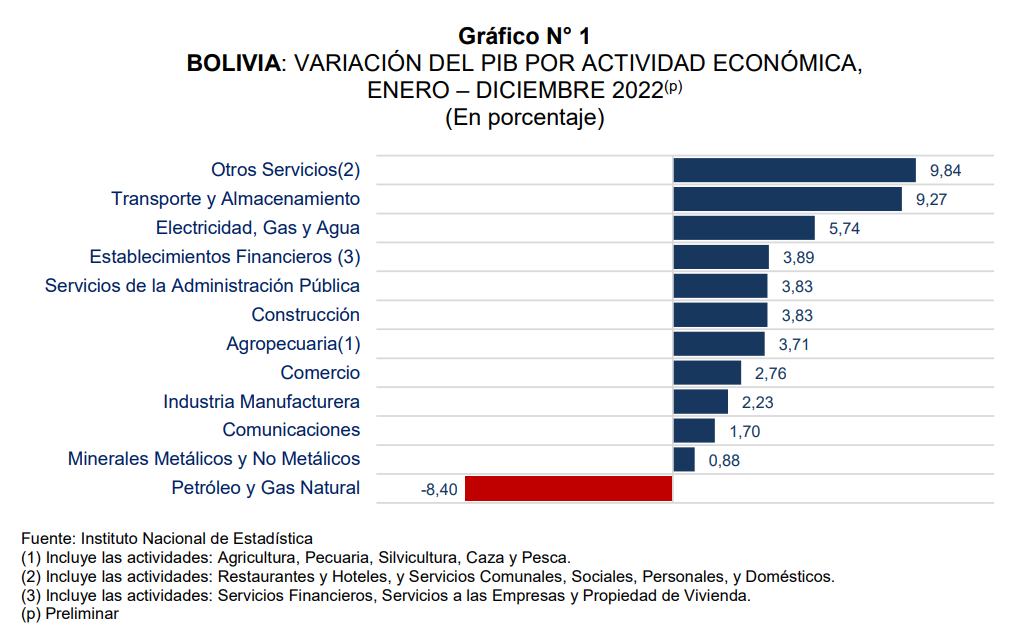 La Paz, 10 de mayo de 2023 (ABI). – El Producto Interno Bruto (PIB) de Bolivia registró en 2022 un crecimiento de 3,48% respecto a la gestión anterior, informó el Instituto Nacional de Estadística (INE).