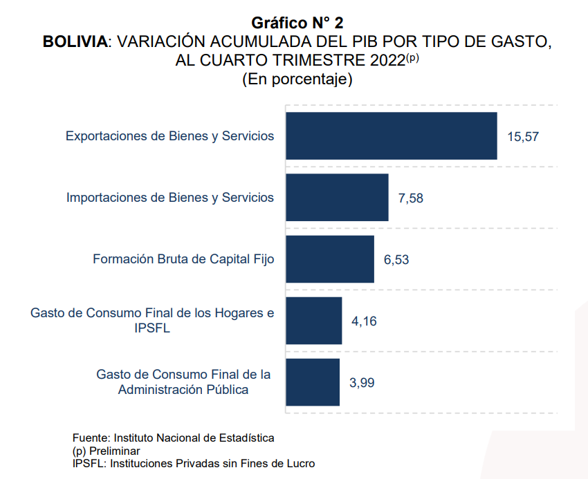 Respecto de la cuantificación del PIB según el tipo de gasto durante la gestión 2022, se reportó que los principales incrementos se registraron en los componentes de exportaciones de bienes y servicios que aumentó en 15,57% y la formación bruta de capital fijo, que mostró que la inversión incrementó en 6,53%.