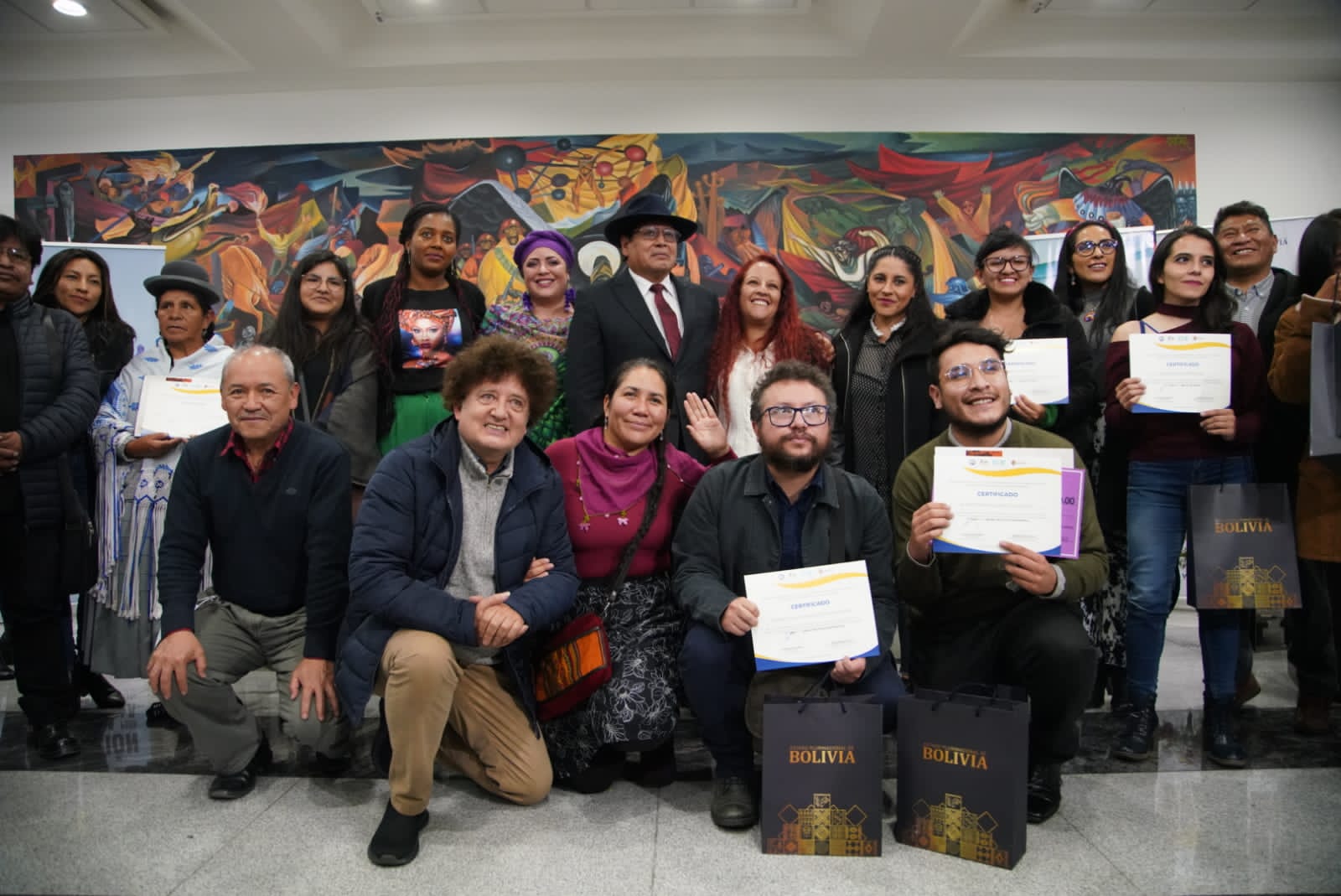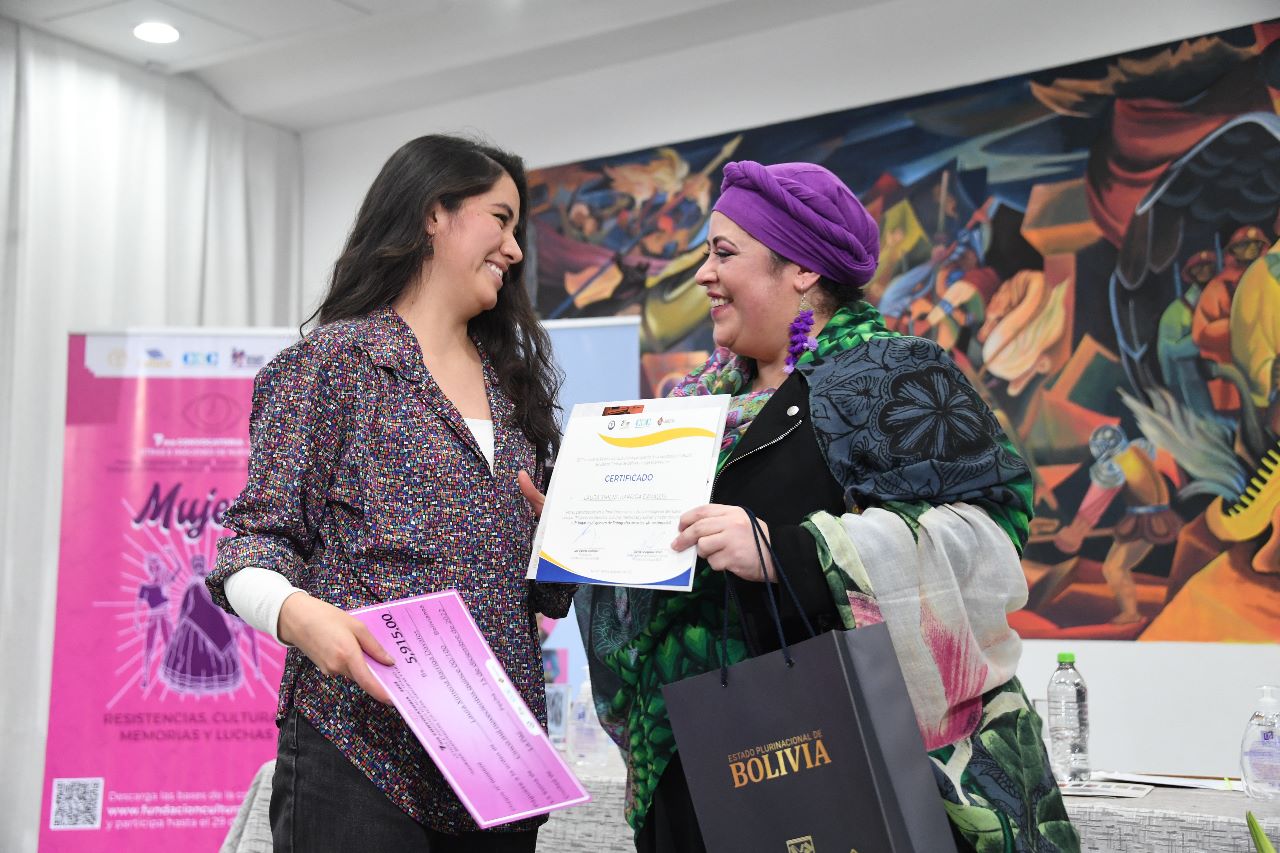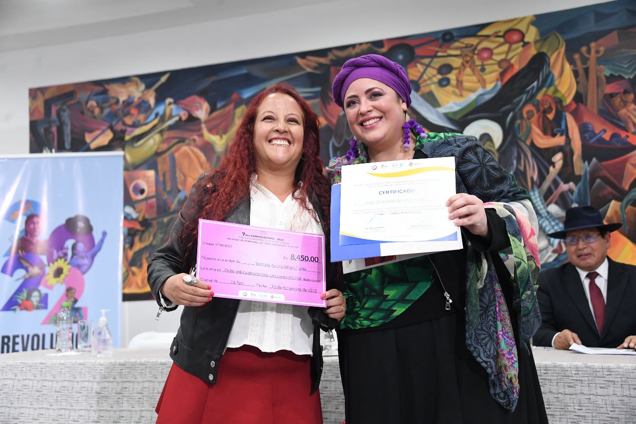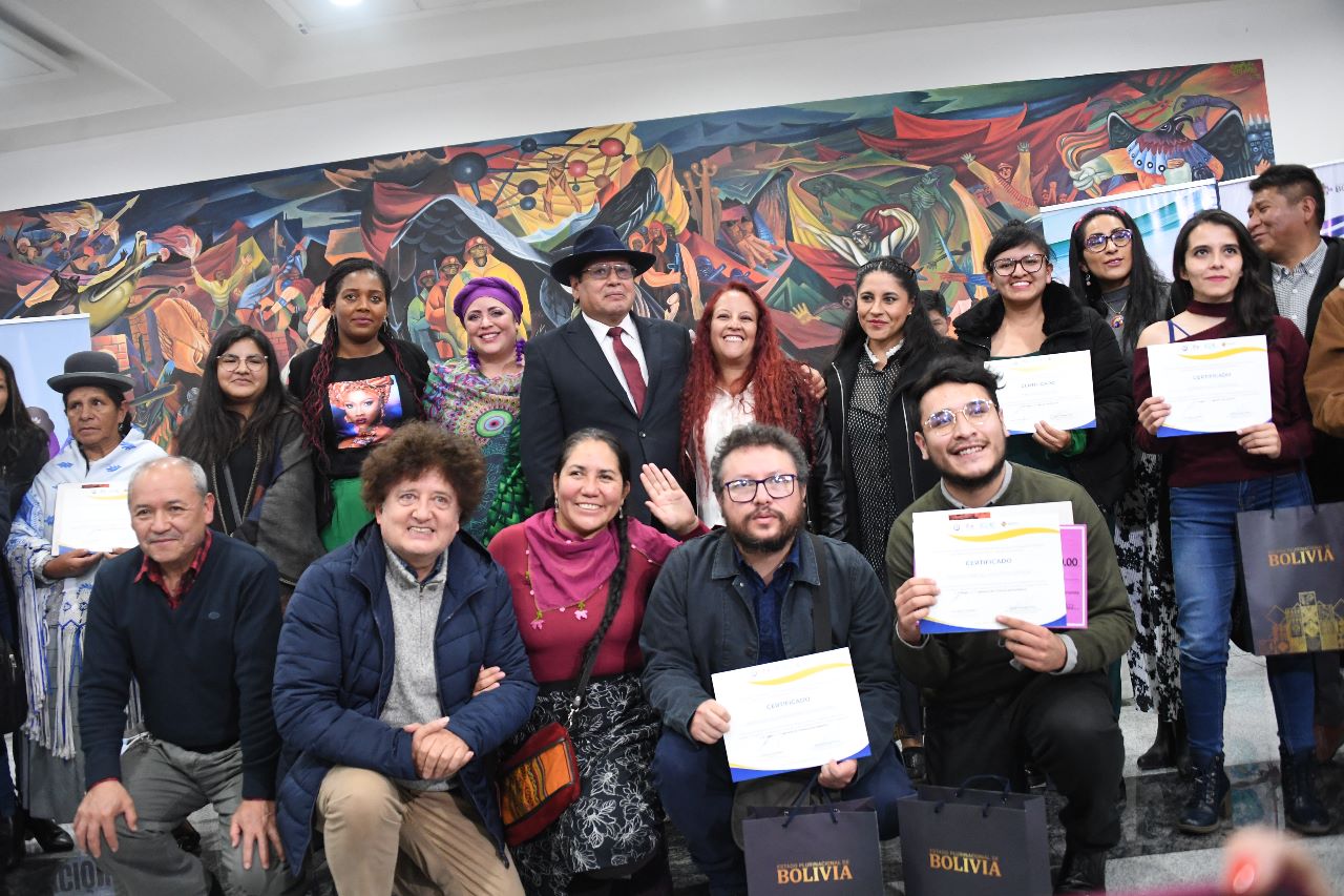 Acto de premiación de las ganadoras y ganadores de la 7ma Convocatoria Letras e Imágenes del Nuevo TiempoShareTwittearshare with Whatsappshare with Telegram Fotos Jorge Mamani / AEPAnteriorSiguiente
