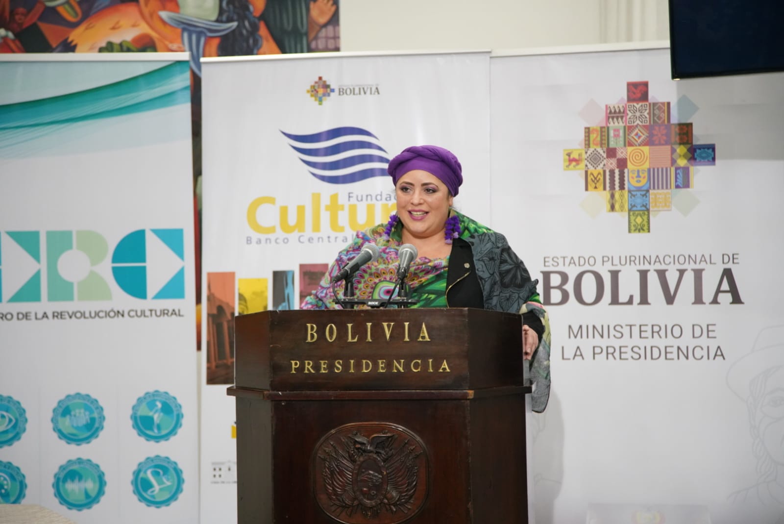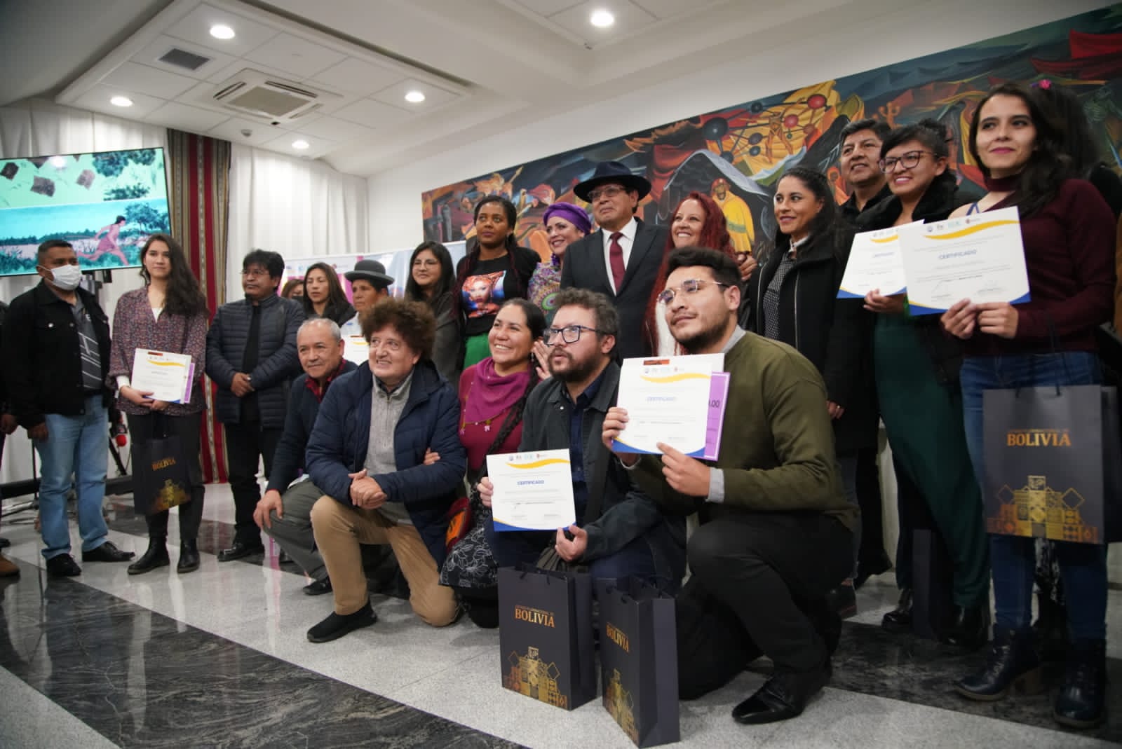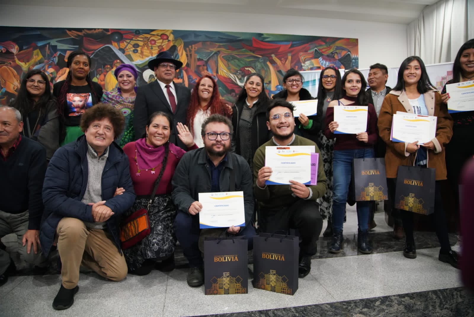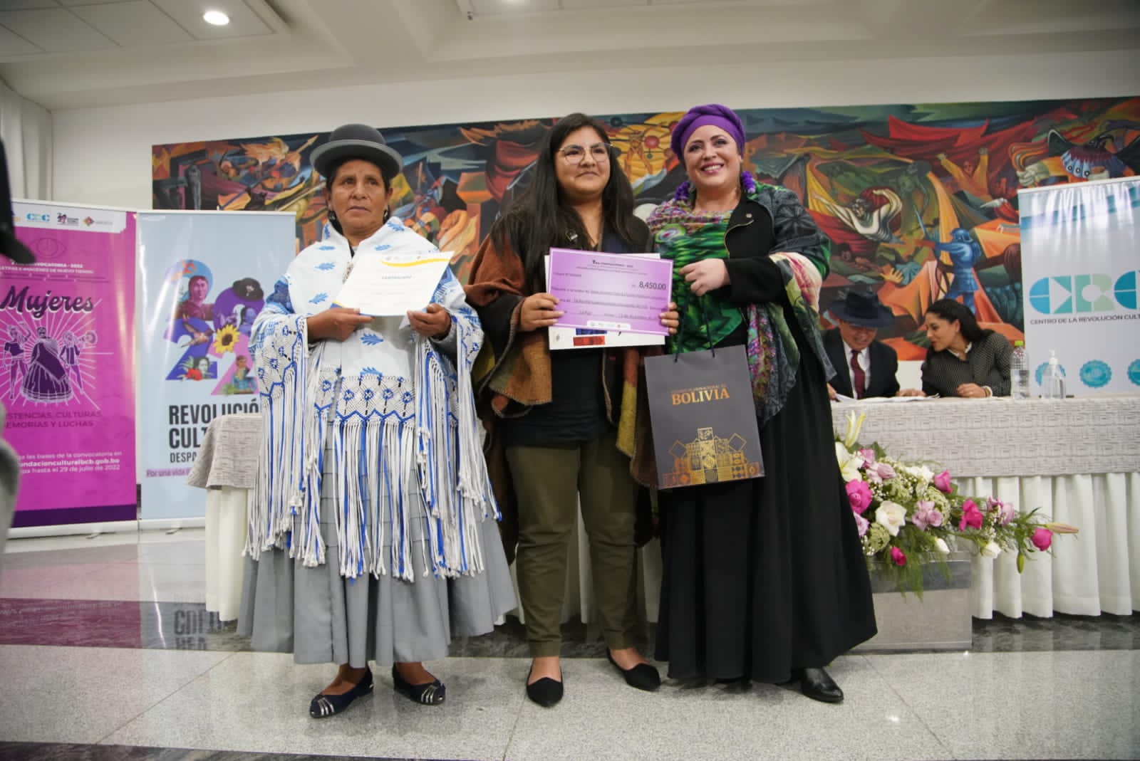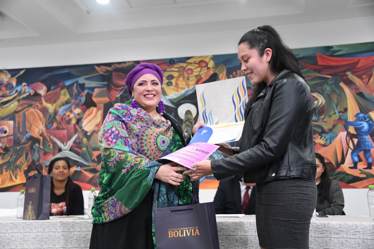 Acto de premiación de las ganadoras y ganadores de la 7ma Convocatoria Letras e Imágenes del Nuevo TiempoShareTwittearshare with Whatsappshare with Telegram Fotos Jorge Mamani / AEPAnteriorSiguiente