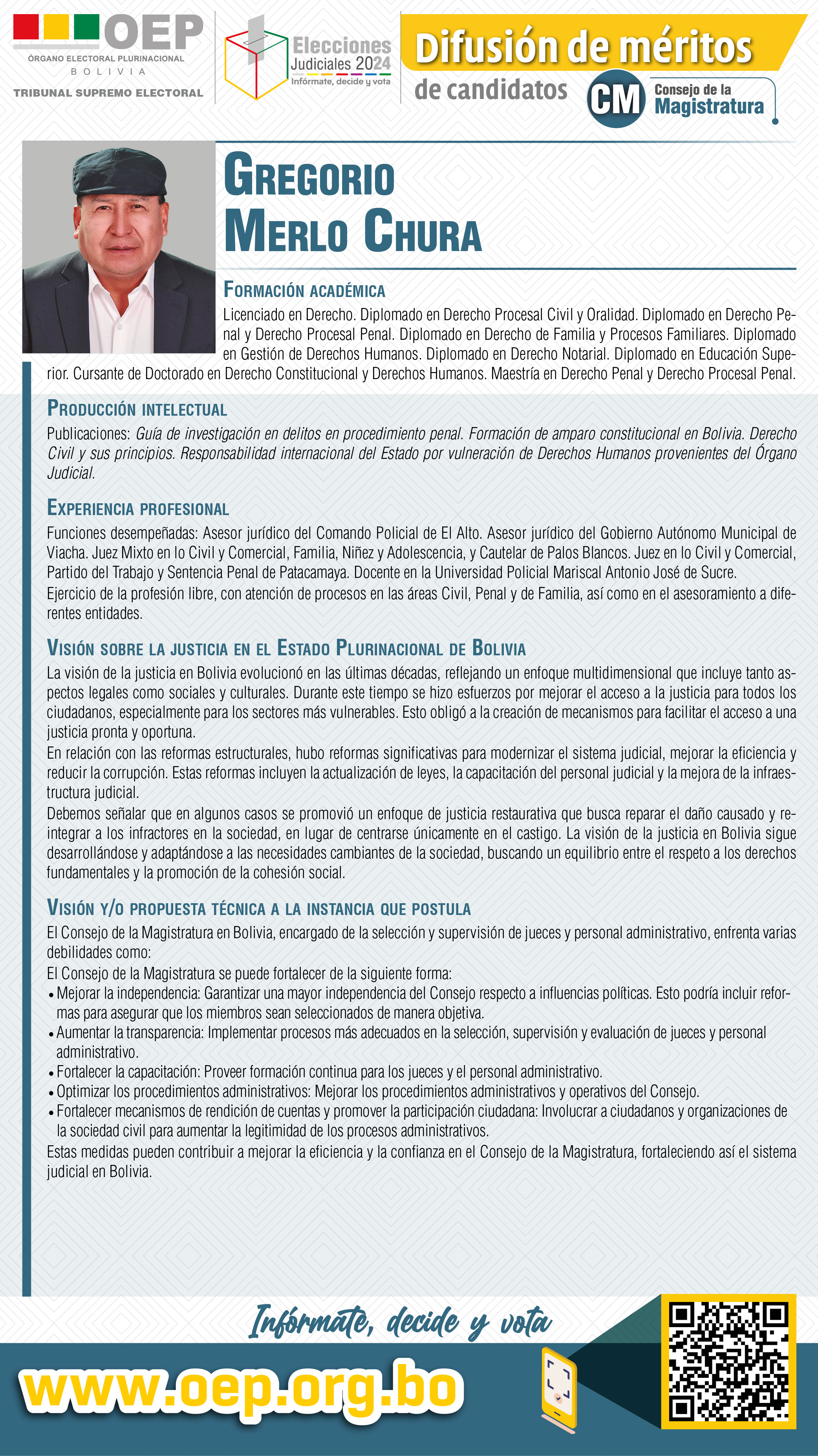 Espacio solicitado: Conforme a lo establecido en el Artículo 10 "Difusión de méritos" del “Reglamento de Difusión de Méritos e Información del Proceso de Elección de Autoridades del Órgano Judicial y del Tribunal Constitucional Plurinacional 2024”, (aprobado Mediante Resolución TSE-RSP-ADM N° 301/2024 de 27 de agosto de 2024), que señala que “Los medios de comunicación del Estado deben establecer espacios gratuitos para la difusión de méritos de las candidatas y los candidatos, garantizando que tengan el mismo tiempo y condiciones".