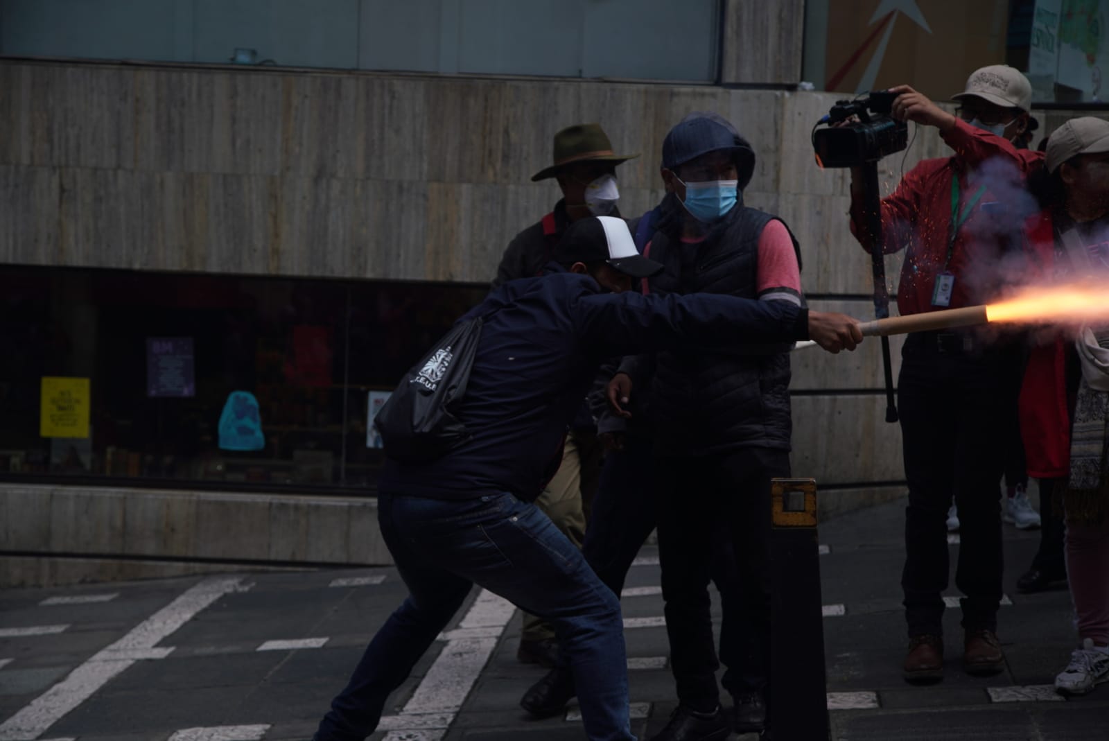 Esta marcha llegó hasta inmediaciones del Ministerio de Educación en la avenida Arce, en la que lanzan petardos a quemarropa contra los efectivos policiales que resguardan la institución.