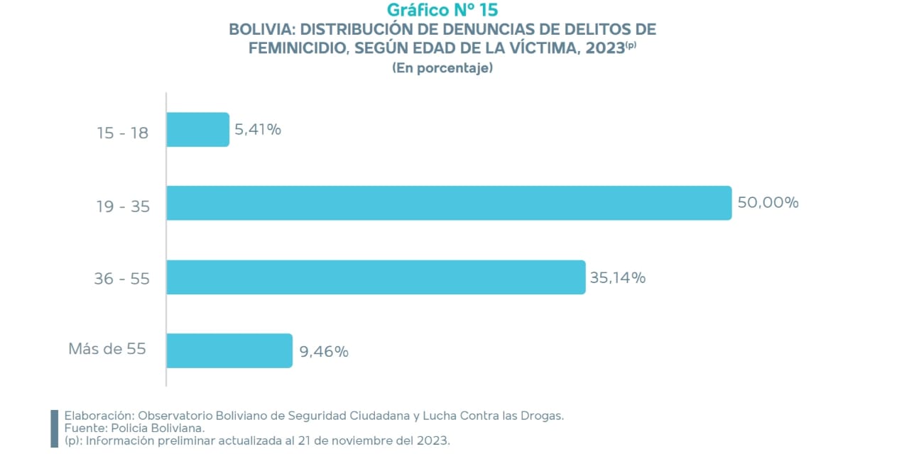 La Paz, 27 de noviembre de 2023 (ABI). – De acuerdo con los datos del boletín Warmi Cifras, del Observatorio Boliviano de Seguridad Ciudadana y Lucha Contra las Drogas (OBSCD), el 50% de las víctimas de feminicidio tiene la edad de 19 a 35 años.