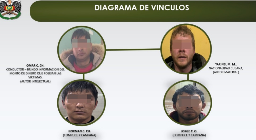 La Paz, 27 de agosto de 2024 (ABI). – La Policía Boliviana aprehendió a Omar C. Ch., Yarinel M. M., Jorge C. O., y Norman C. Ch., acusados del triple asesinato de tres jóvenes que pretendían adquirir $us 100.000 “a un precio accesible”, pero fueron victimados en Unduavi, camino a Yungas, en el norte del departamento de La Paz.