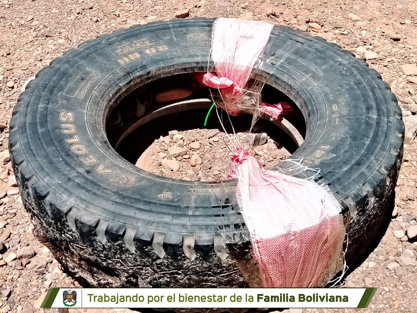 “Tras una exhaustiva búsqueda se detectó cachorros de dinamita camuflados en neumáticos; asimismo, se procedió a la desactivación y el secuestro del material explosivo”, informó la Policía Boliviana.