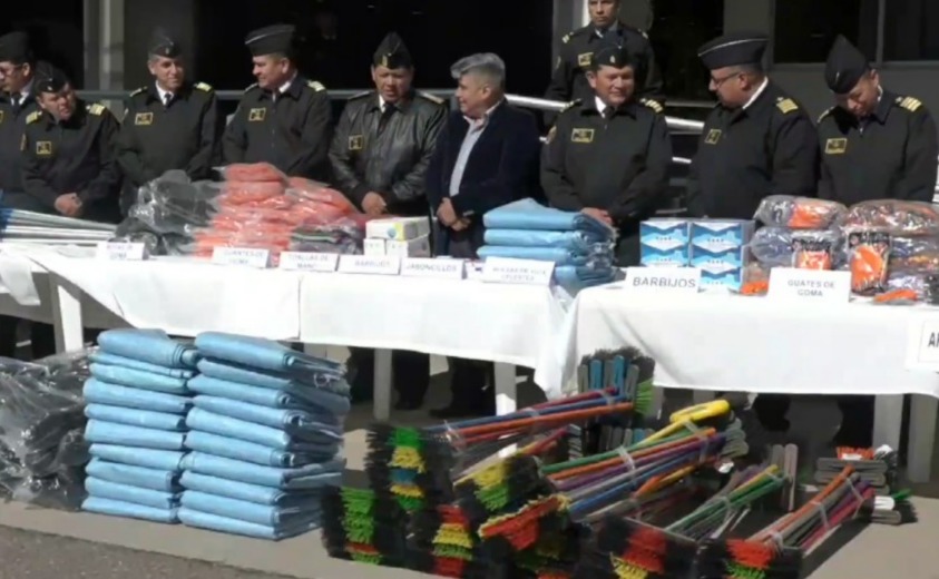 Durante el evento se realizó la entrega de insumos como rastrillos metálicos, botas, guantes, escobas, barbijos y toallas, los cuales serán distribuidos entre las unidades de la Armada Boliviana encargadas de operar en riberas, lagos y ríos.