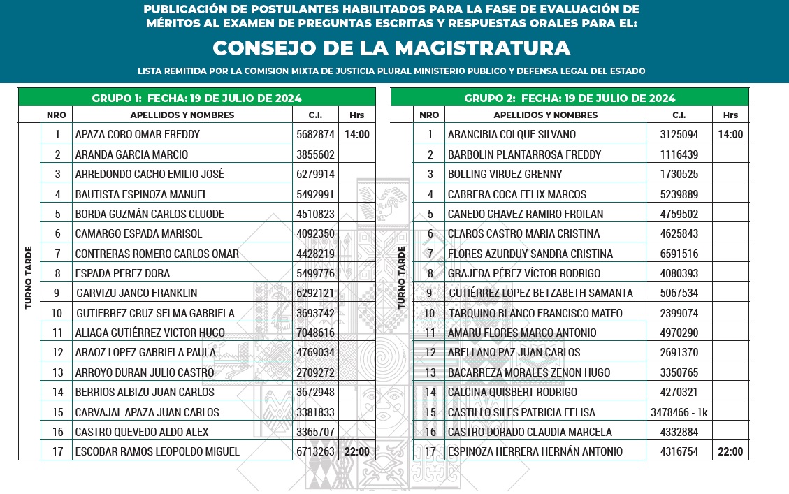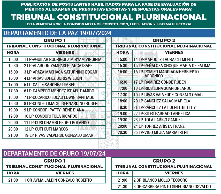 La Paz, 18 de julio de 2024 (ABI). – La vocal electoral María Cristina Claros, el exdiputado Franklin Garvizu, el vocal judicial Israel Campero y la exmagistrada Blanca Isabel Alarcón están en la nómina de los 62 postulantes que rendirán exámenes orales este viernes para la preselección de aspirantes al Tribunal Constitucional Plurinacional (TCP) y al Consejo de la Magistratura (CM).