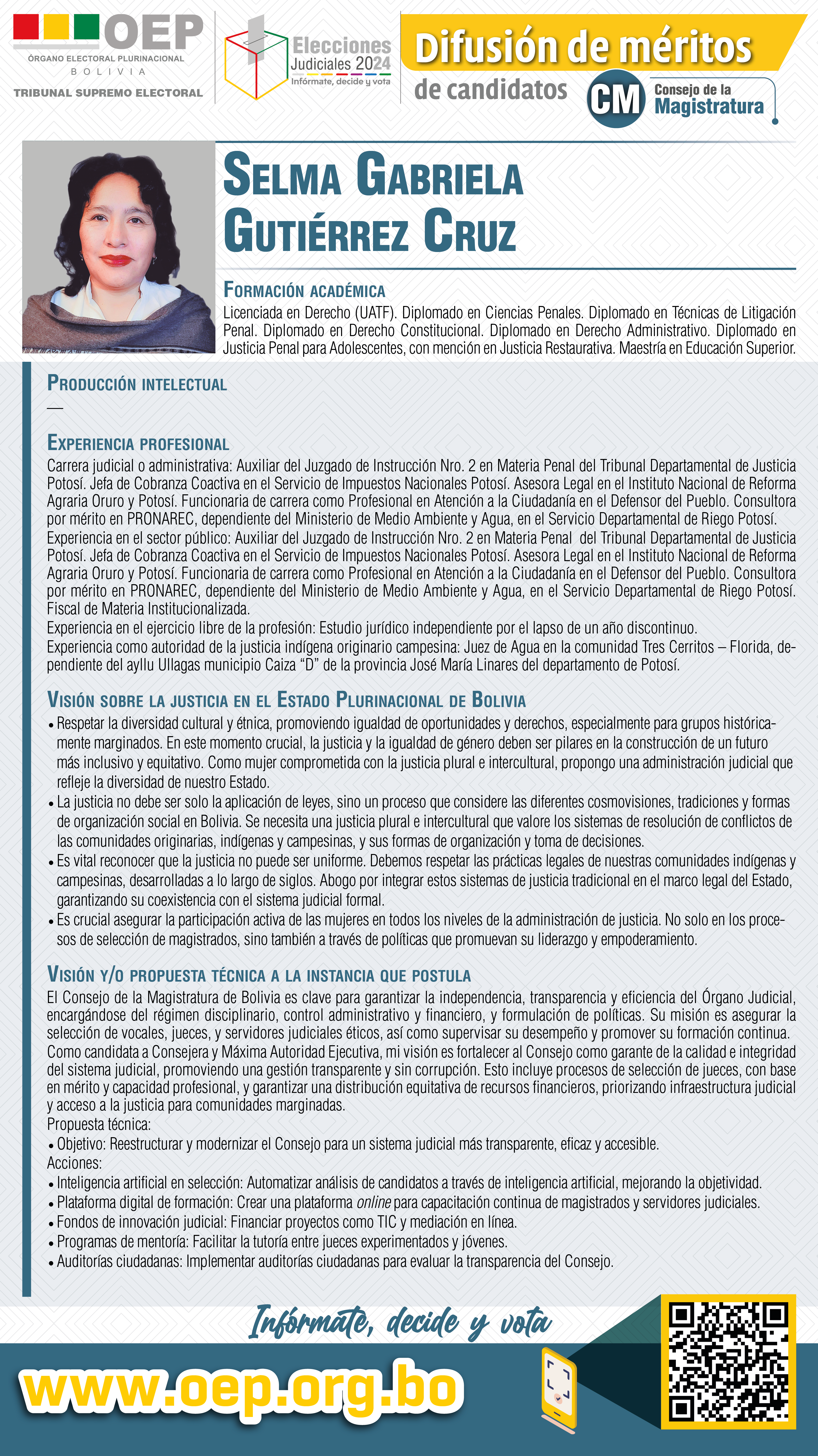 ELECCIONES JUDICIALES: Conozca a la candidata al Consejo de la Magistratura, Selma Gabriela Gutiérrez Cruz