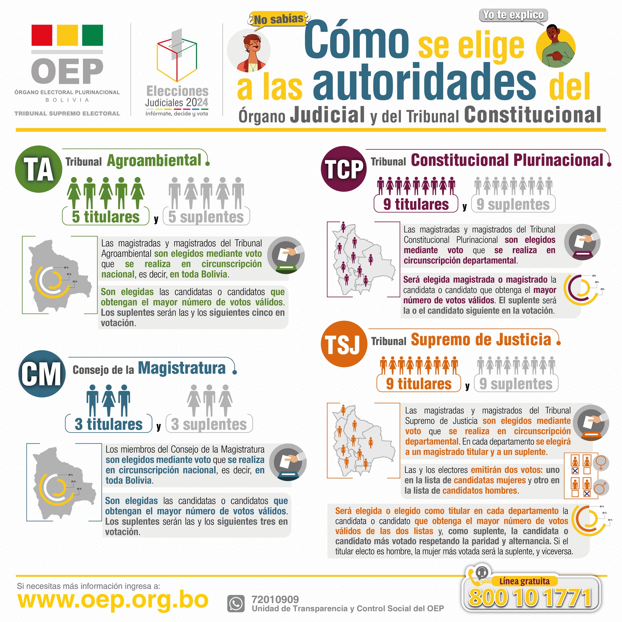 Además de 4 magistrados del Tribunal Constitucional Plurinacional (de Chuquisaca, La Paz, Oruro y Potosí) y 7 magistrados del Tribunal Supremo de Justicia (de Chuquisaca, La Paz, Oruro, Potosí, Santa Cruz, Cochabamba y Tarija) en circunscripción departamental. Para cada cargo, también se elegirá a su suplente.