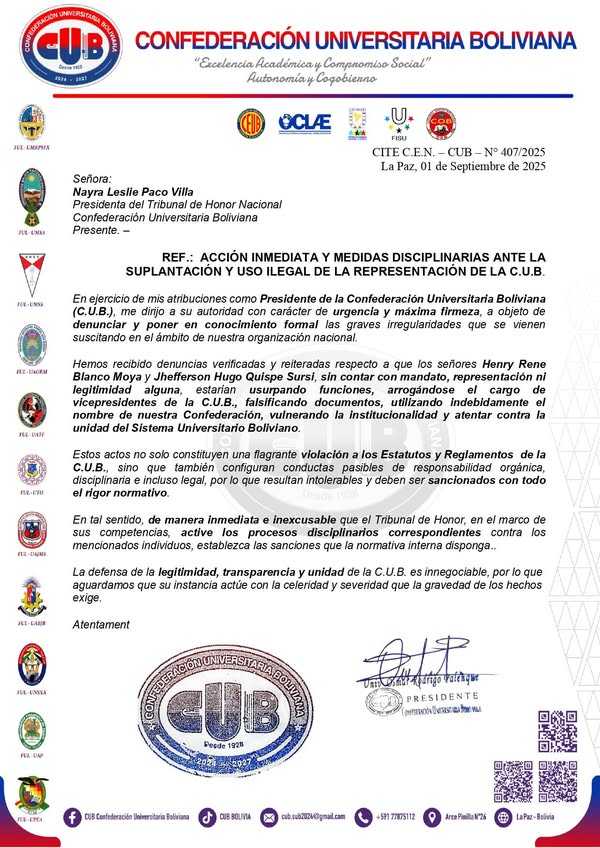 “Se ha confirmado que (…) han usurpado cargos de la C.U.B., falsificado documentos y utilizado el nombre de nuestra Confederación de manera indebida”, señala el pronunciamiento firmado por Palenque, quien fue acreditado como presidente de la organización por la V Conferencia Nacional de Universidades (Resolución N.º 02/2025) y reconocido legalmente mediante la Resolución Ministerial N.º 125/25.