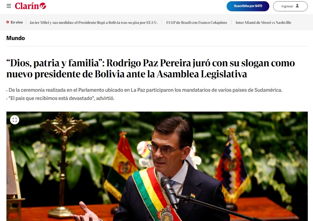 Clarín, de Argentina, puso en relevancia las palabras de Paz durante su juramento: “Dios, patria y familia, ¡sí, juro!”.