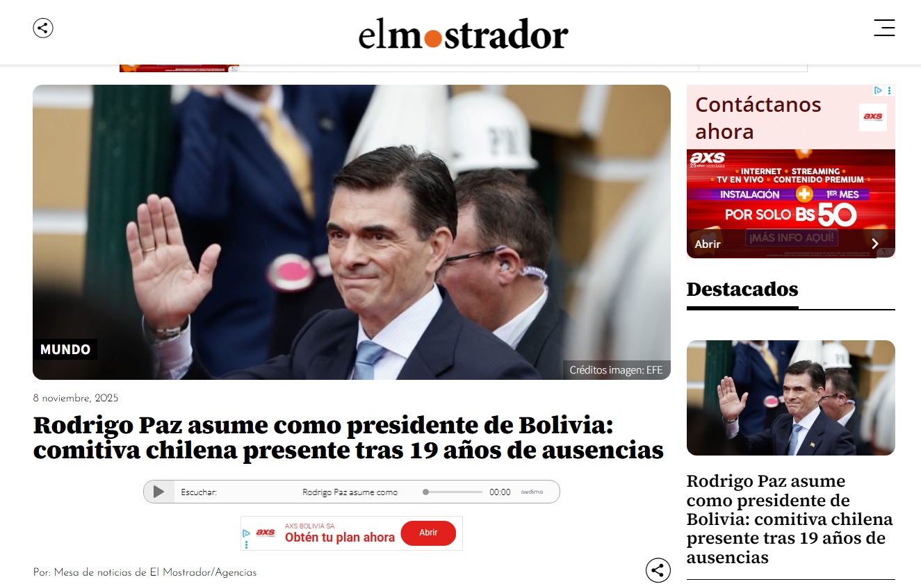 La Paz, 08 de noviembre de 2025 (ABI). – La prensa internacional siguió minuto a minuto la investidura del presidente Rodrigo Paz, celebrada este sábado en la Asamblea Legislativa en la ciudad de La Paz.